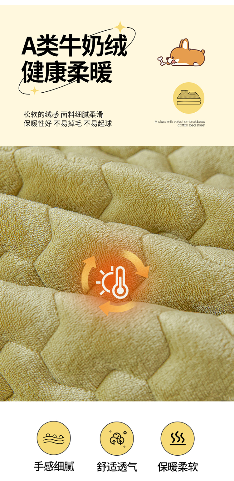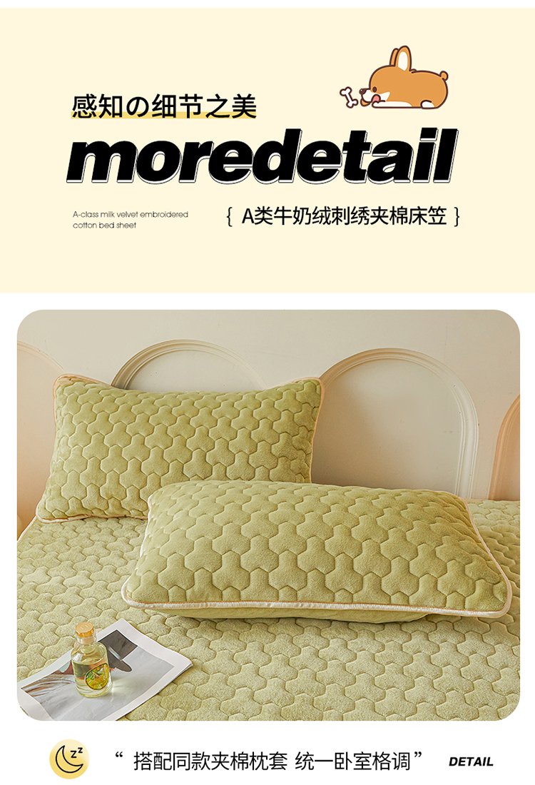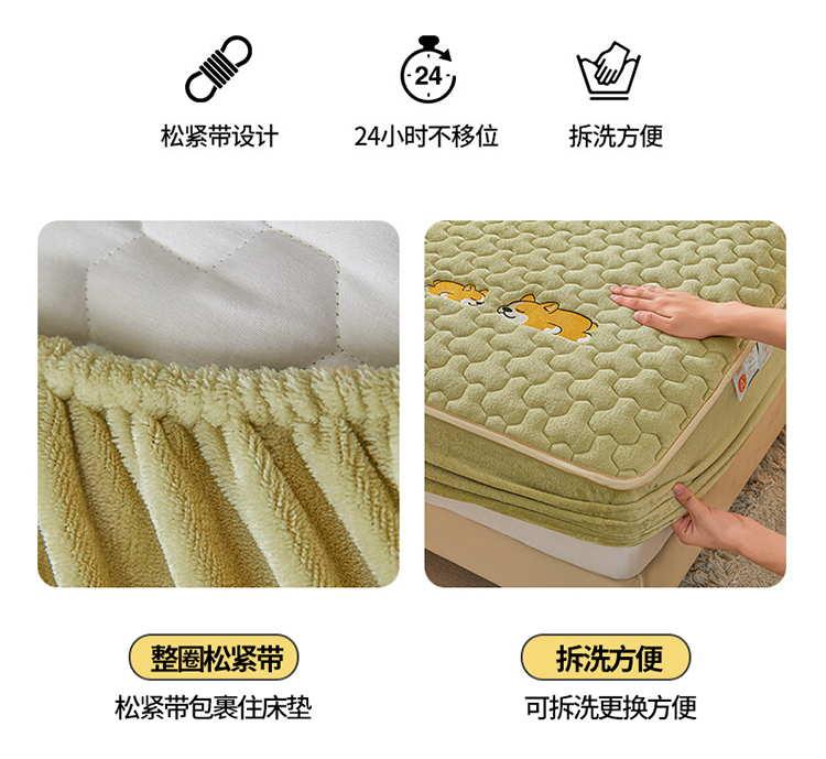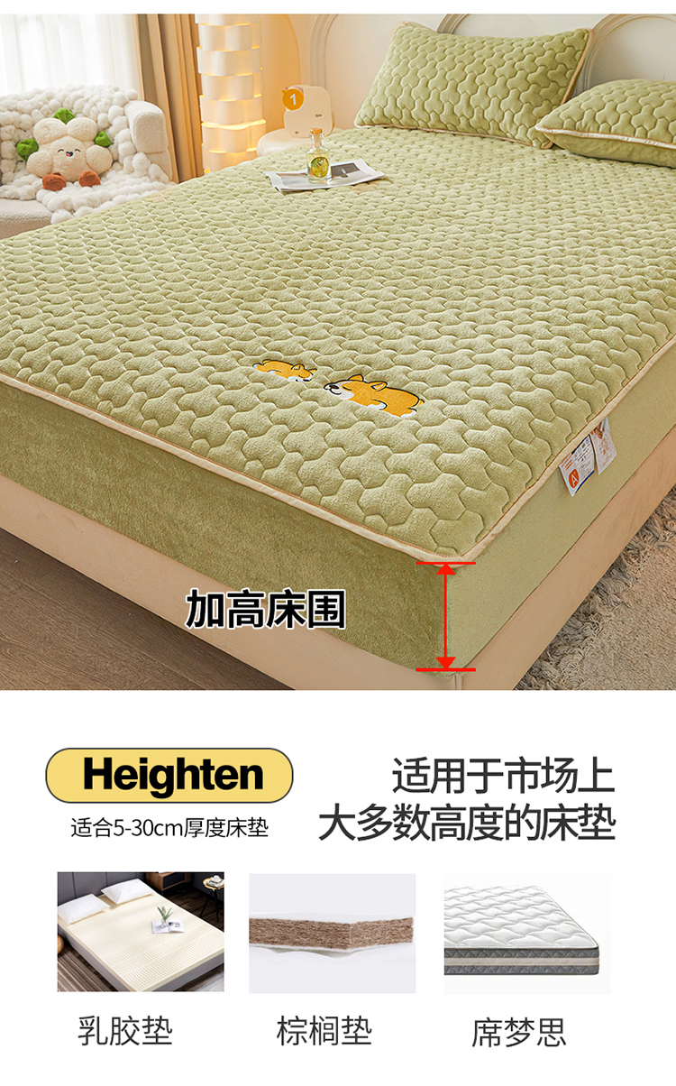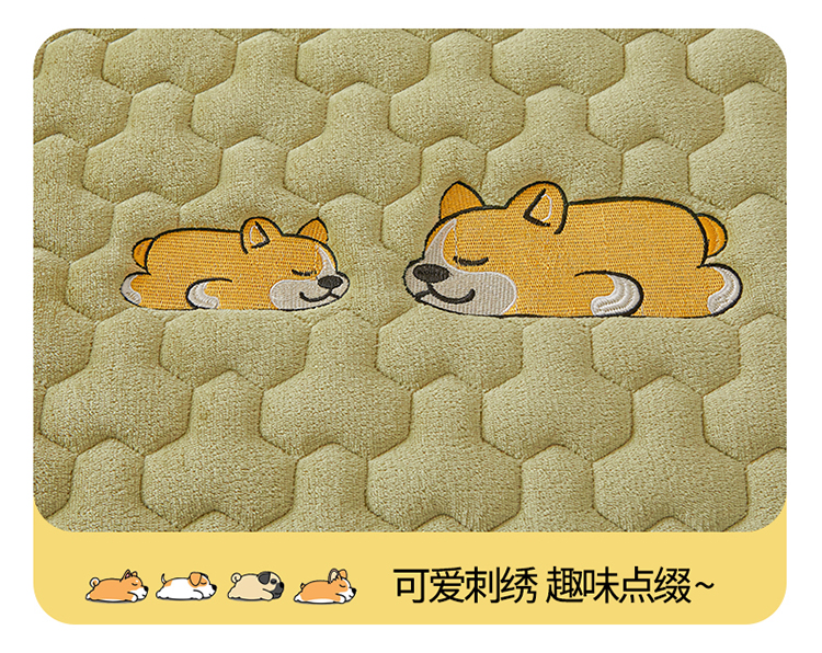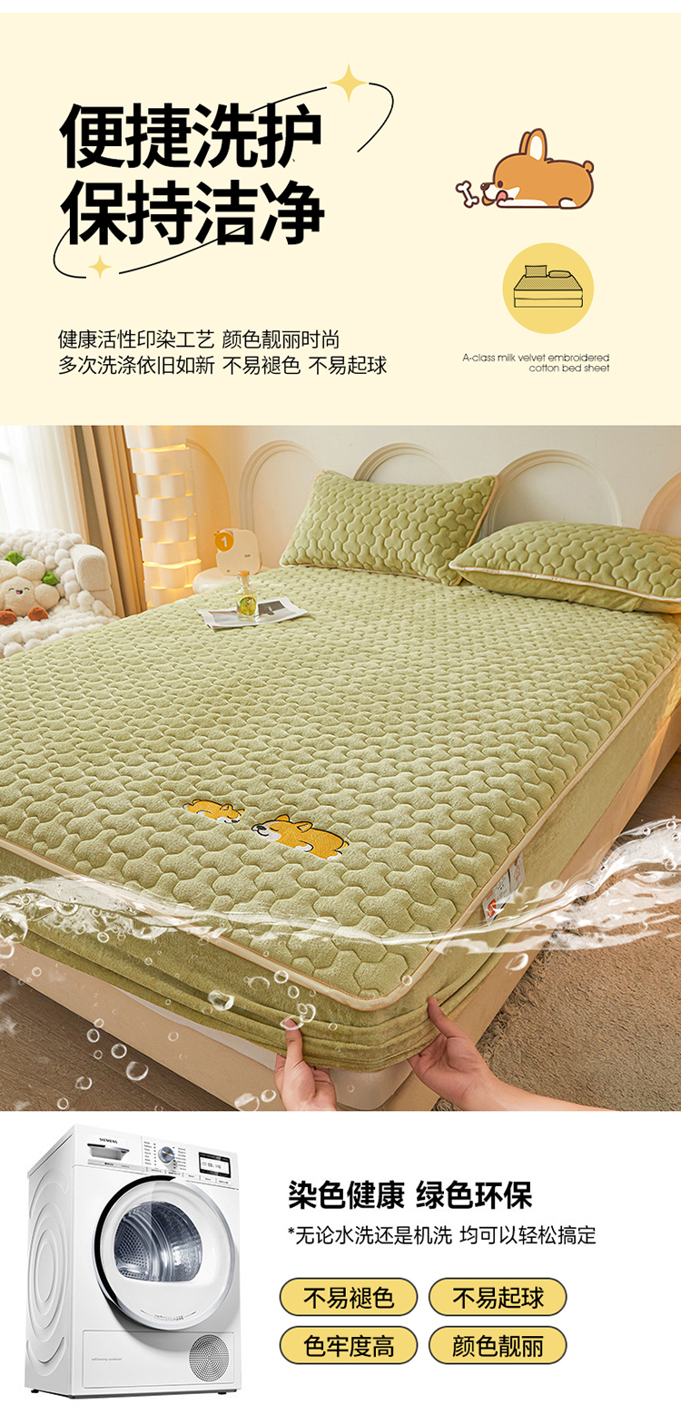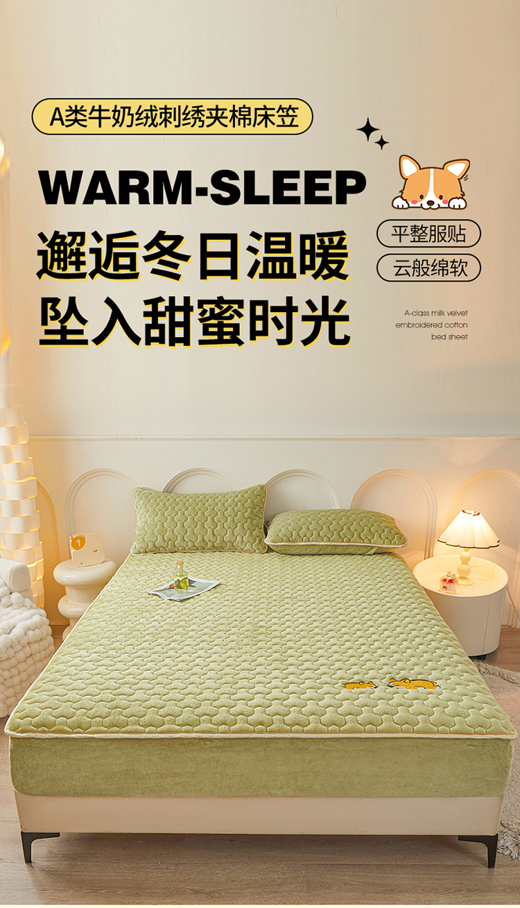 • 91家纺网 家纺一手货源 找家纺 2024新款A类牛奶绒刺绣夹棉床笠-小柯基 小柯基-果茶绿