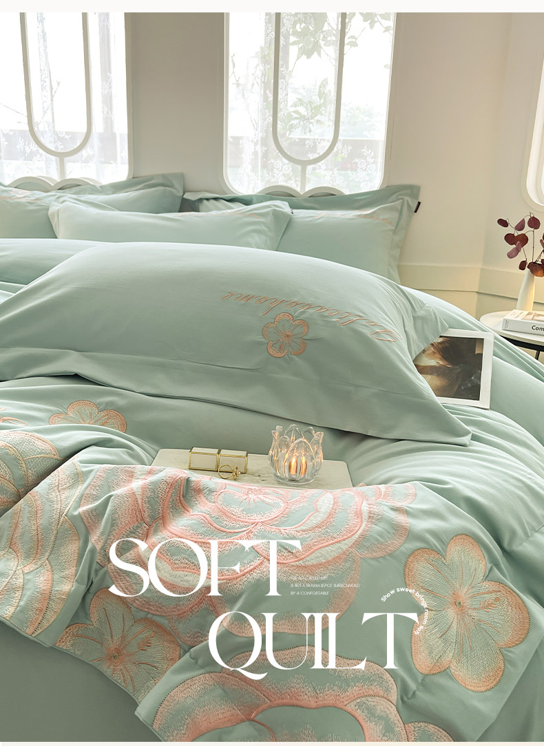 (总)2025新款A类100支长绒棉夹棉床盖三件套全棉纯棉加厚绗绣床单四季款床上用品,茶绿,黛紫,慕蓝,奶玉,颜粉