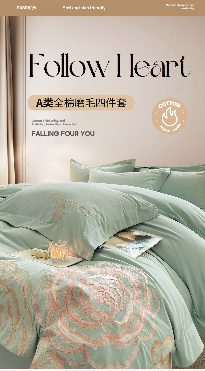 (总)A类加厚保暖全棉磨毛四件套纯棉重工刺绣轻奢风床单被套纯色新疆棉冬季床上用品-晨光蝶语,晨光蝶语-白桃,晨光蝶语-茶绿,晨光蝶语-红桃,晨光蝶语-莓蓝