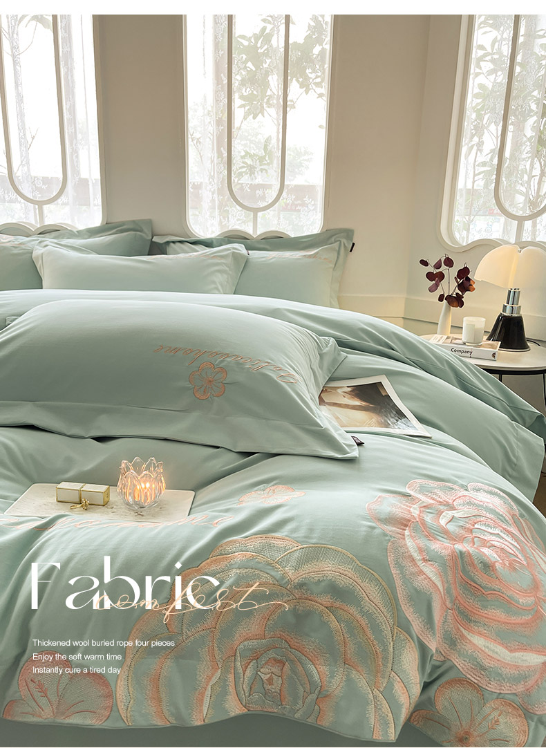 【秋冬爆款】A类母婴级全棉磨毛四件套纯棉重工刺绣花轻奢风床单床笠款新疆棉高奢床上用品 缇菲-茶绿