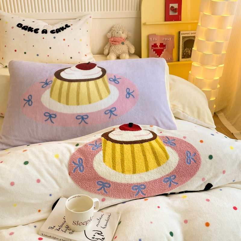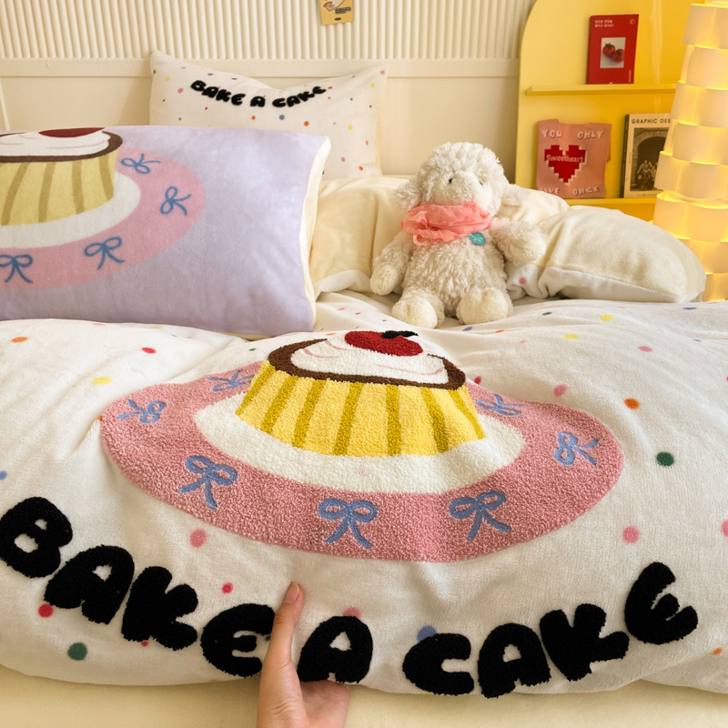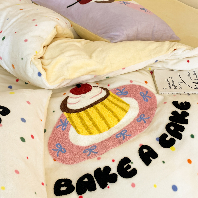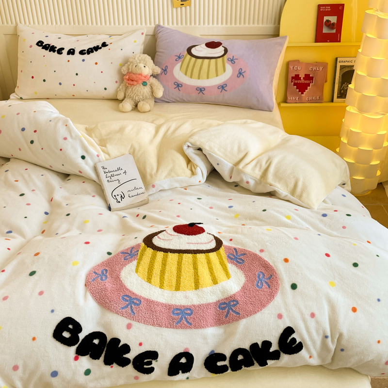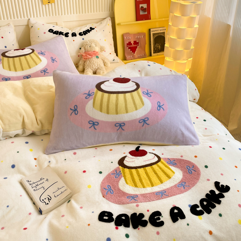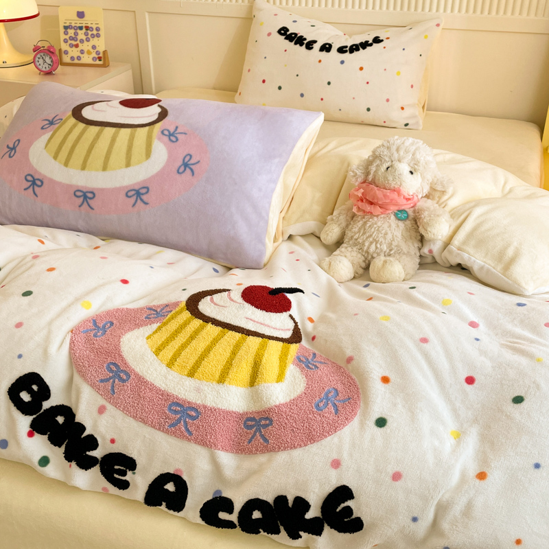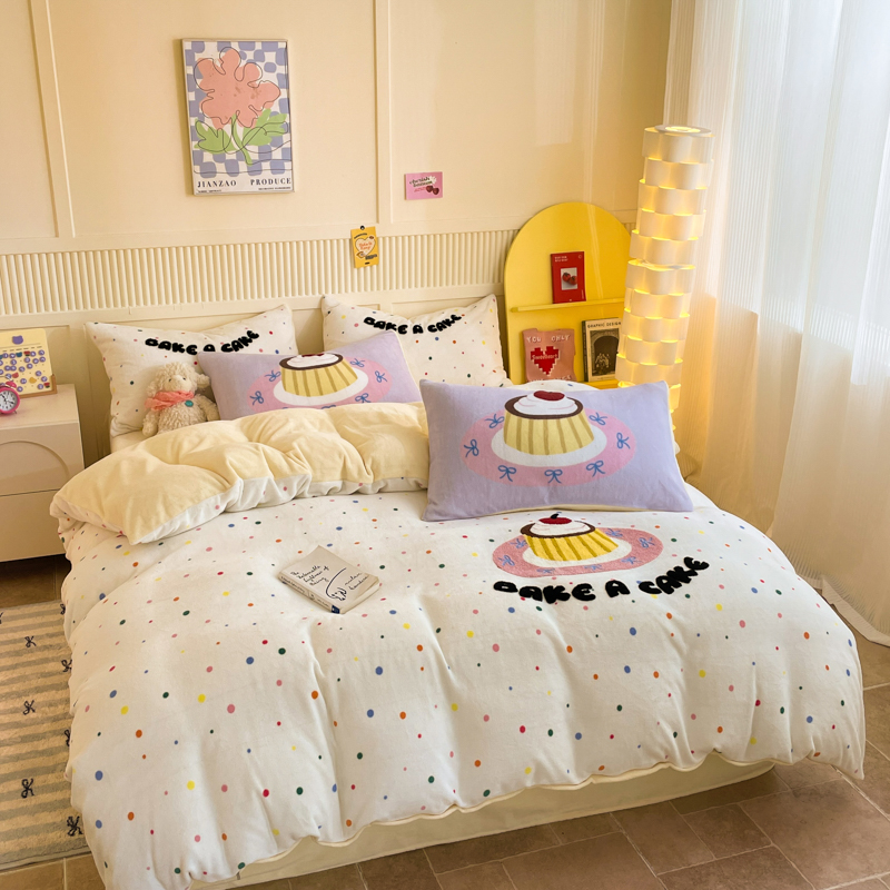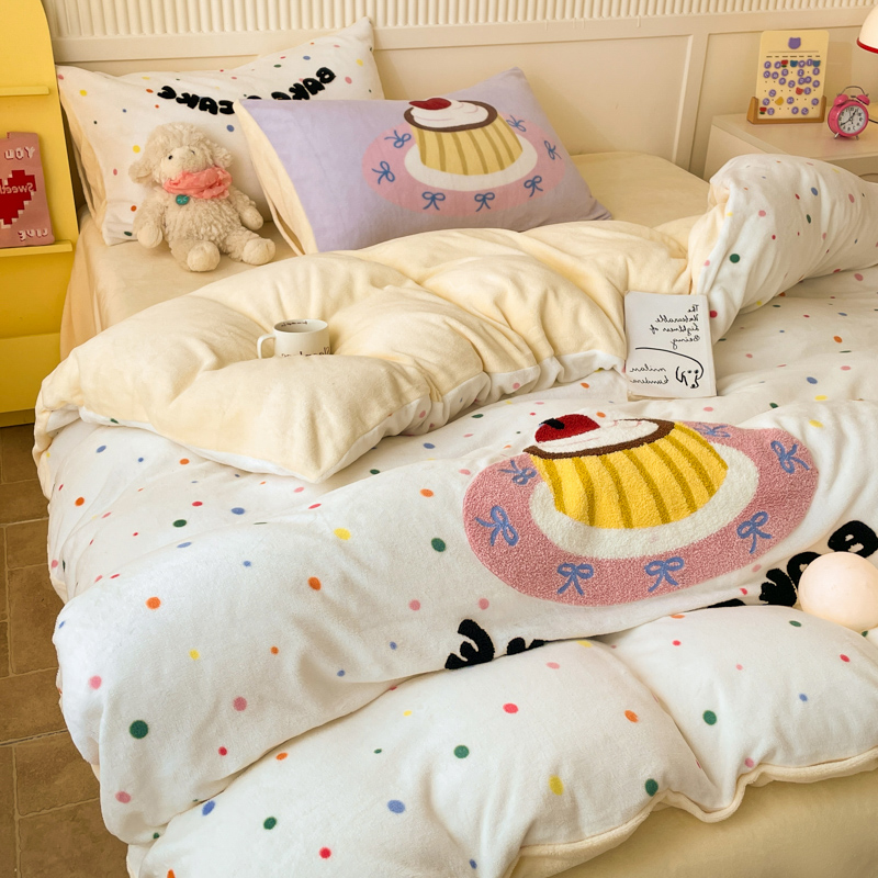 商品名称:呗旺鹿 2024新款高克重卡通印花牛奶绒四件套毛巾绣牛奶绒四件套 樱桃蛋糕