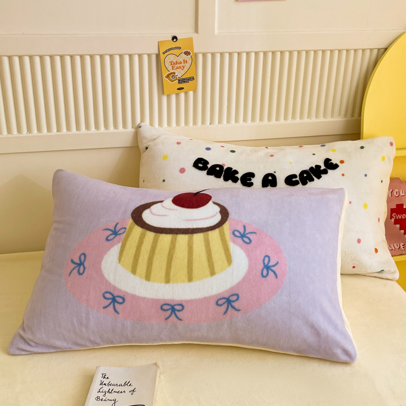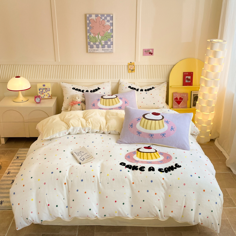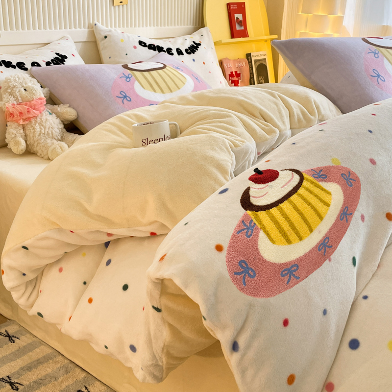 呗旺鹿 2024新款高克重卡通印花牛奶绒四件套毛巾绣牛奶绒四件套 樱桃蛋糕
