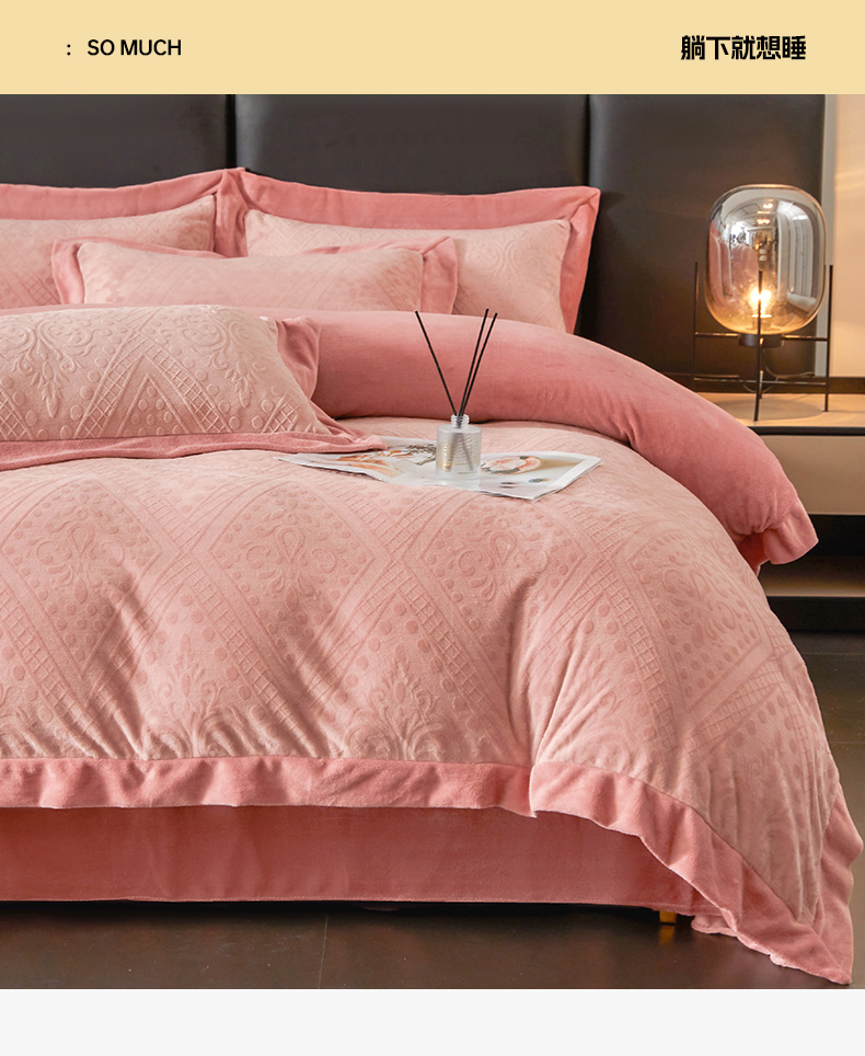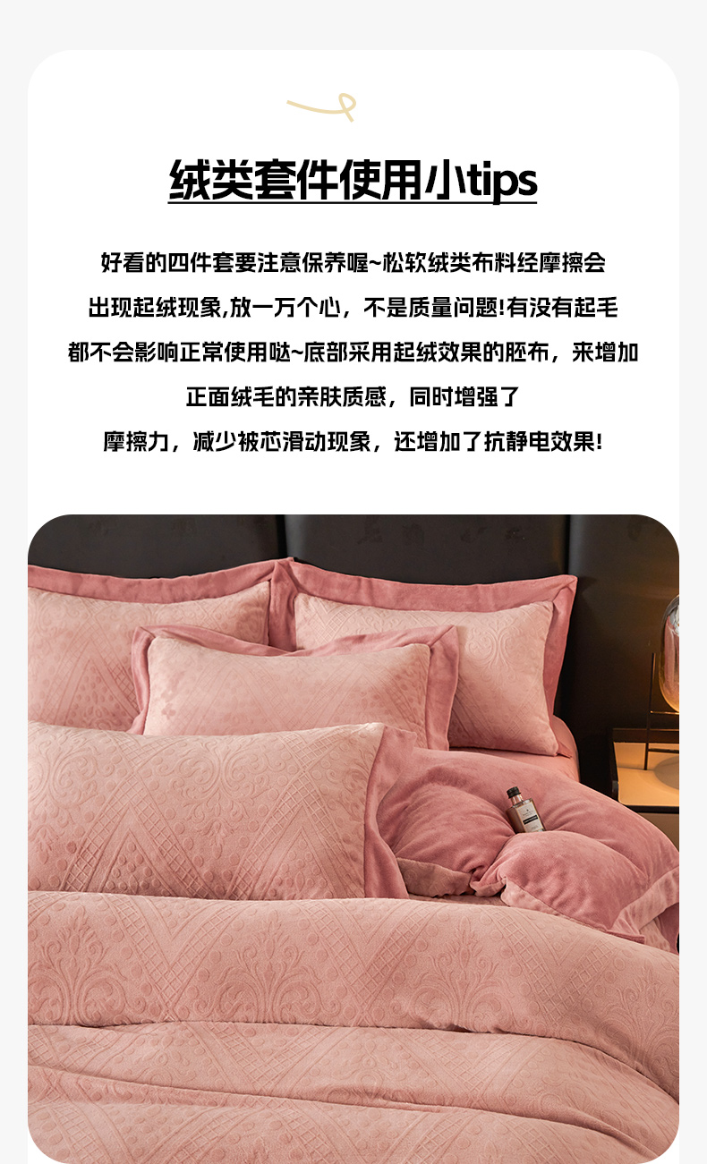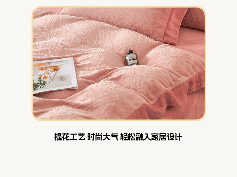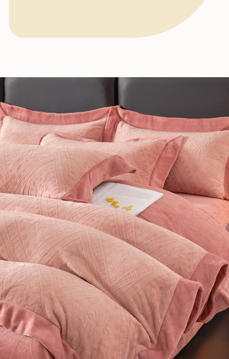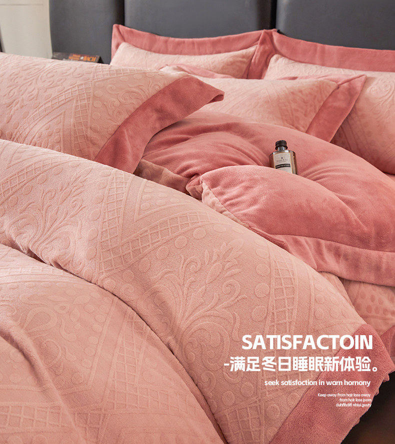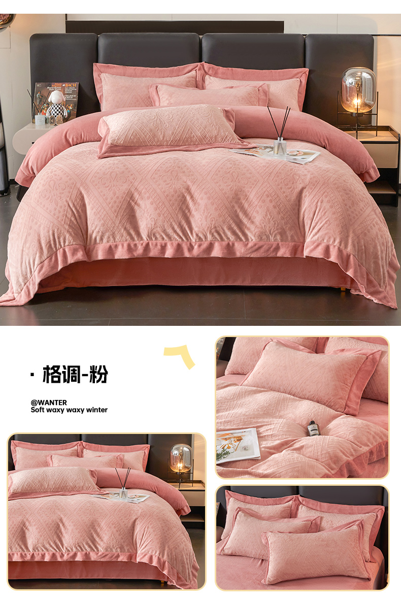 当前位置: 91家纺网 > 商品网购 > 床品套件 > 四件套 > 牛奶绒四件套 > 全季家居 2024新款A类加厚保暖3D雕花拼角牛奶绒四件套 格调-粉