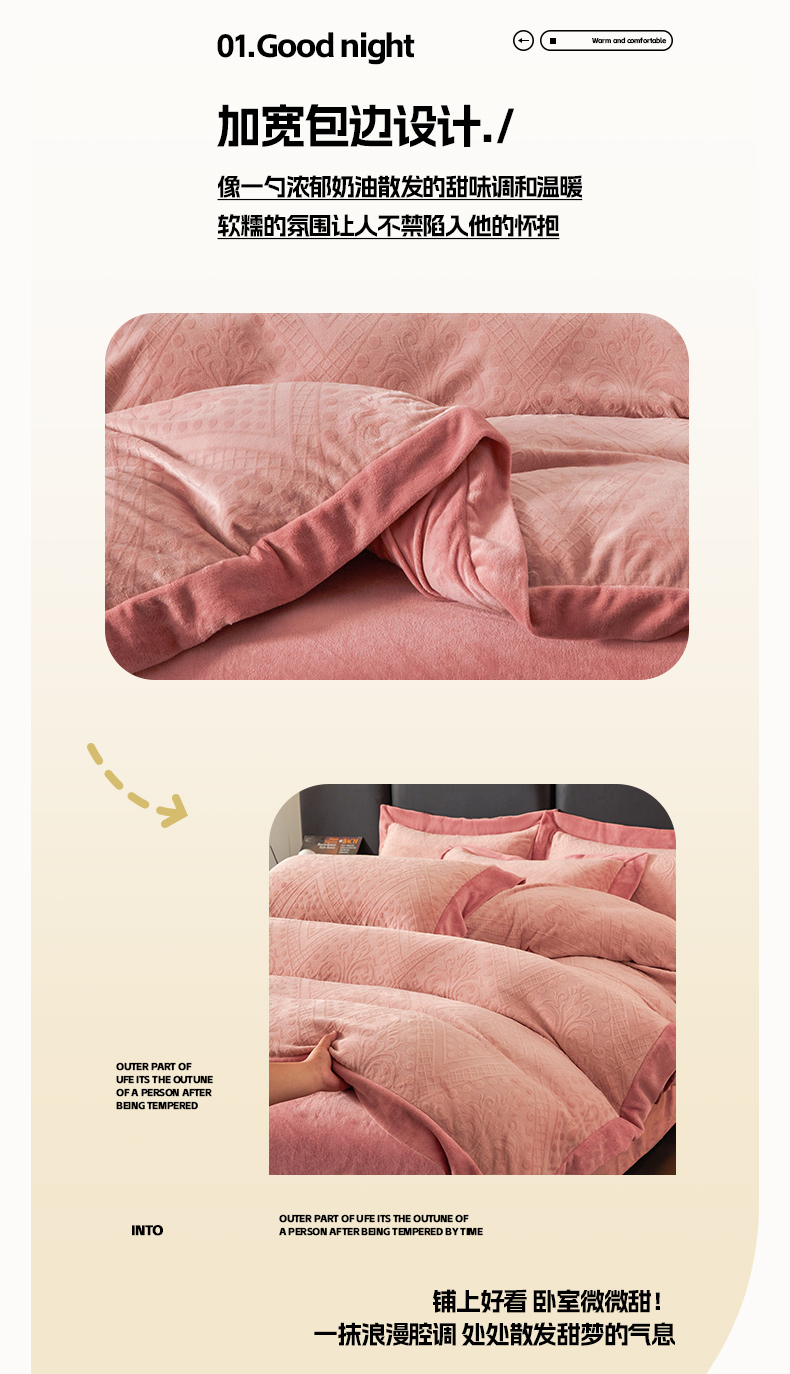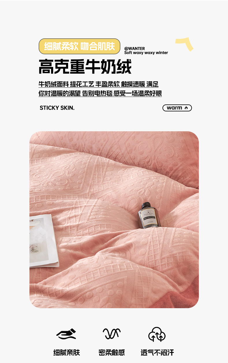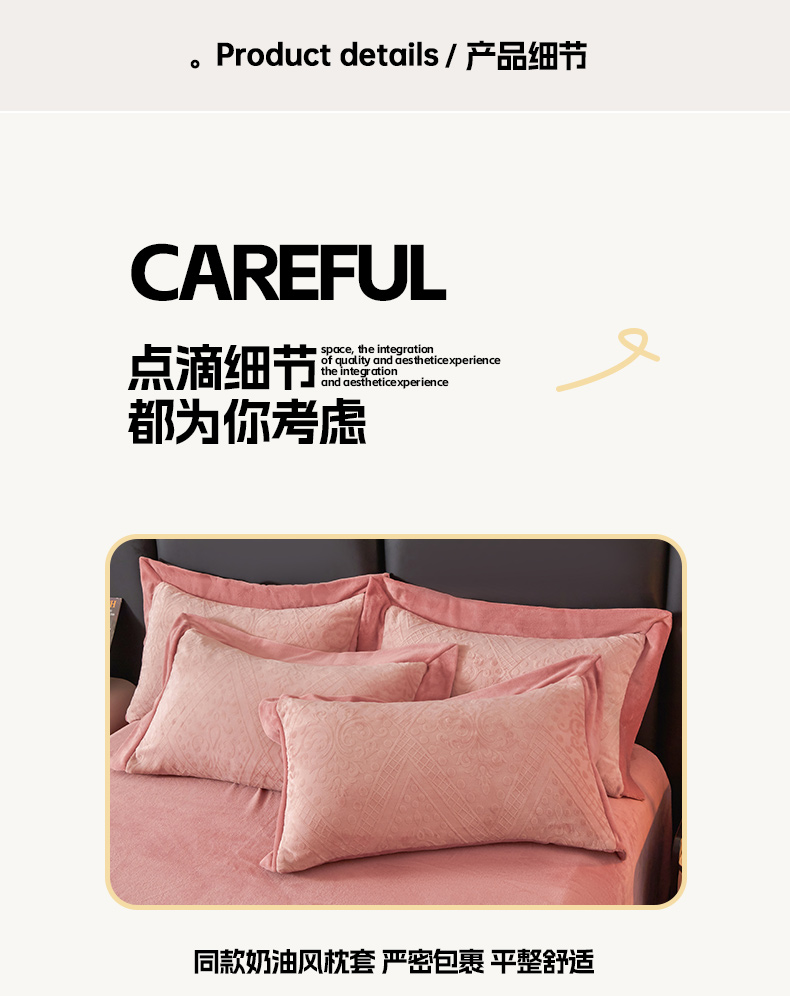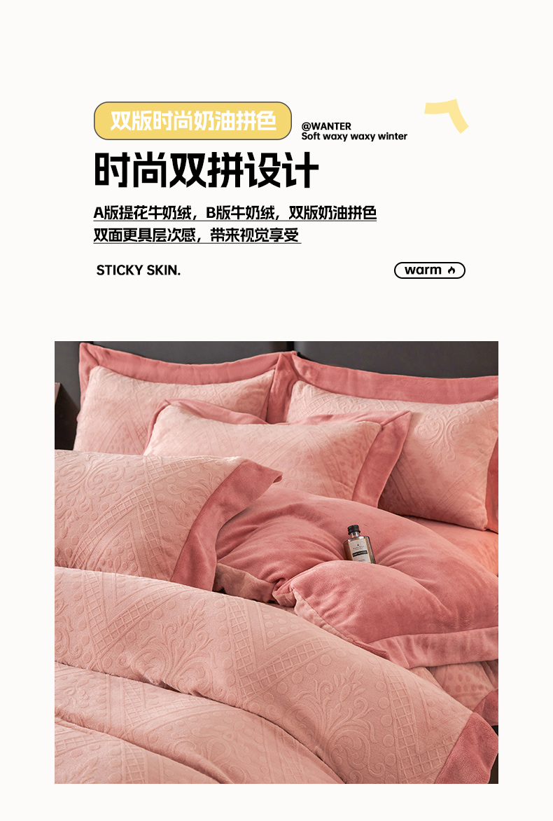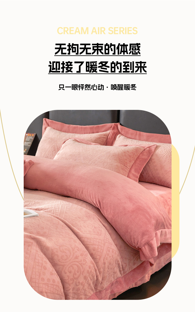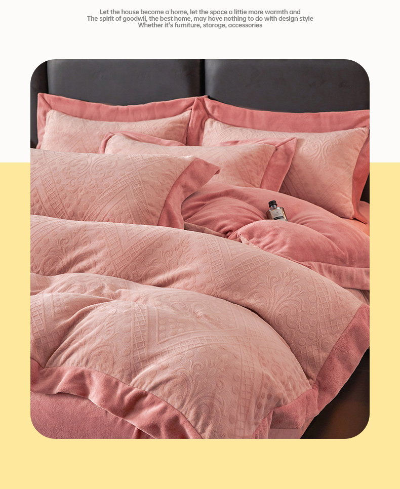 当前位置: 91家纺网 > 商品网购 > 床品套件 > 四件套 > 牛奶绒四件套 > 全季家居 2024新款A类加厚保暖3D雕花拼角牛奶绒四件套 格调-粉