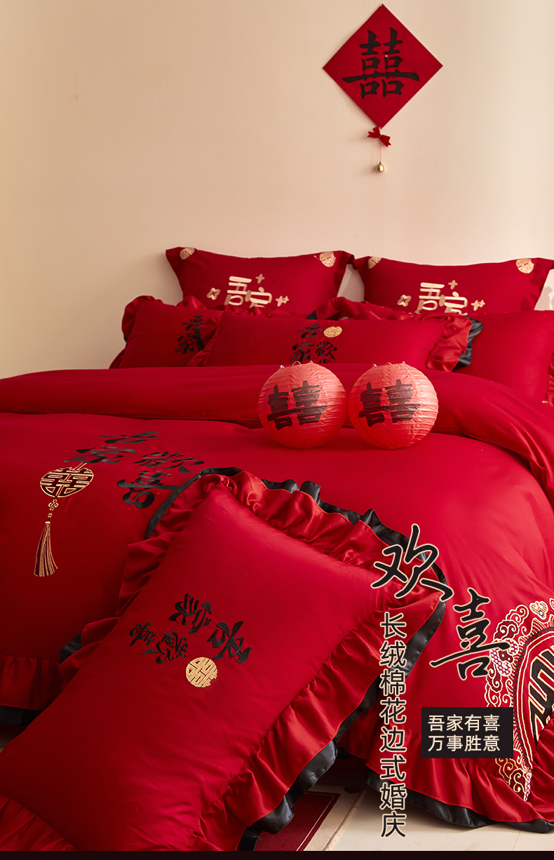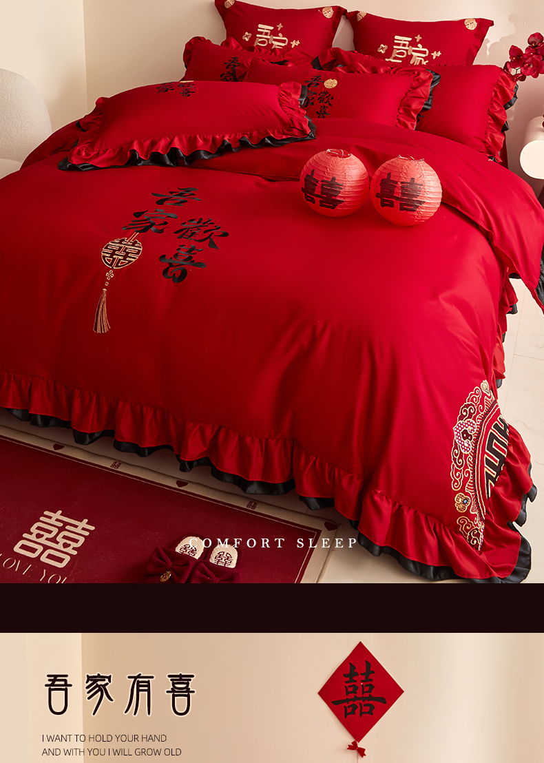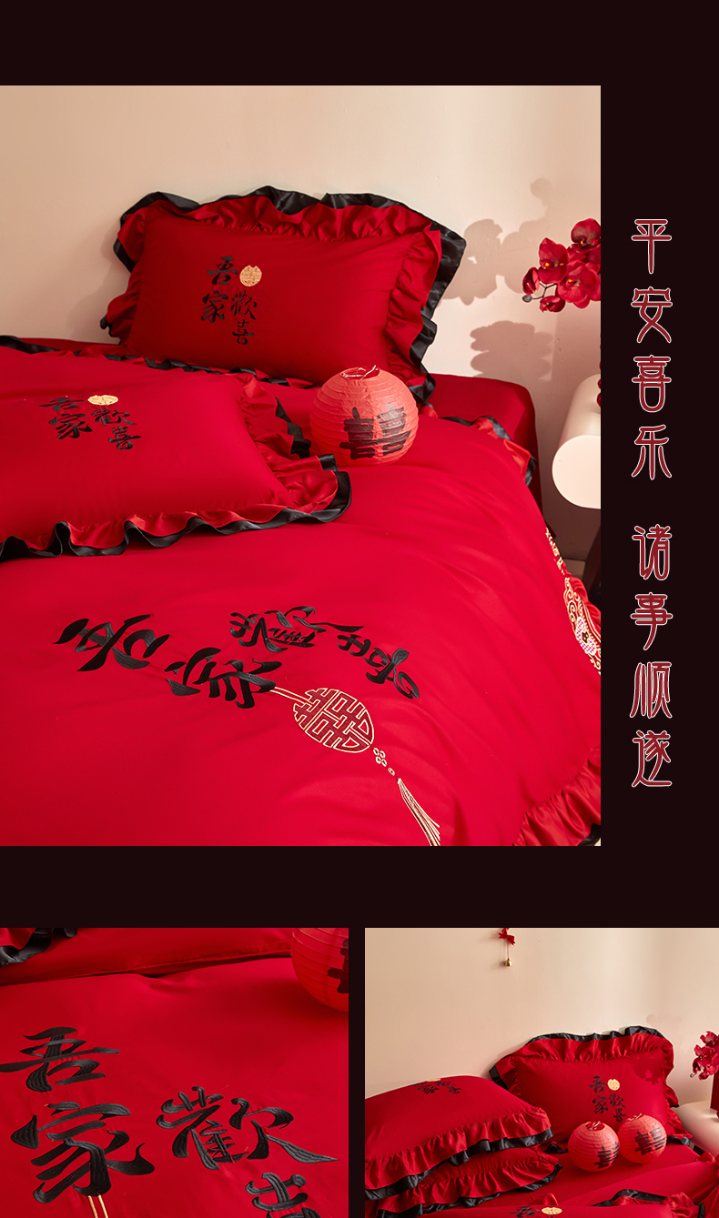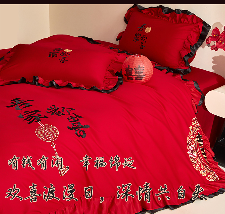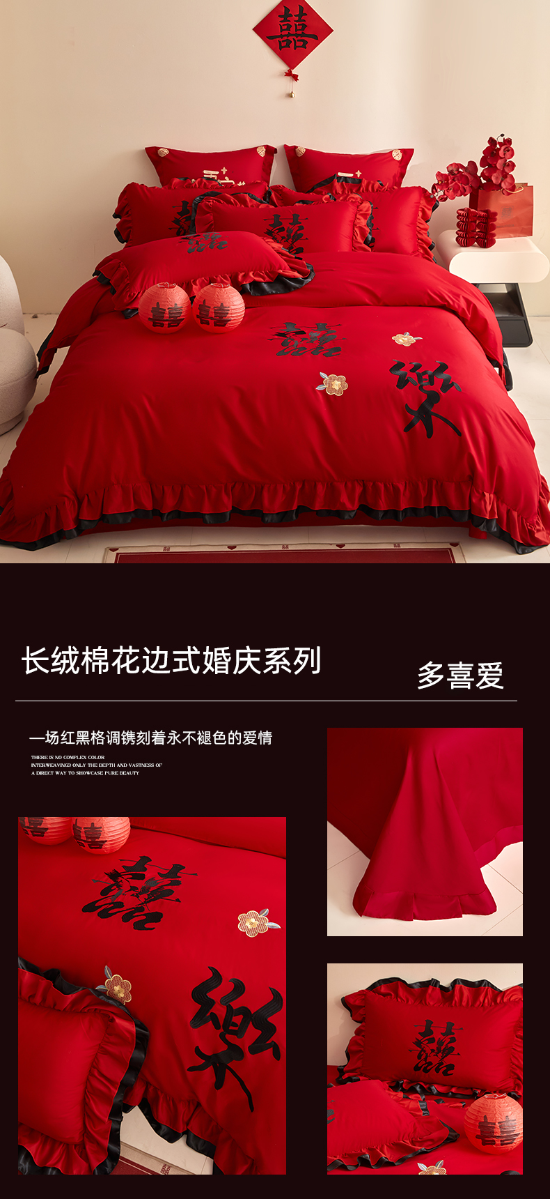 当前位置: 91家纺网 > 商品网购 > 床品套件 > 四件套 > 婚庆四件套 > 玉雅家纺 2025新款长绒棉花边式红黑格调婚庆四件套 花边款-多欢喜