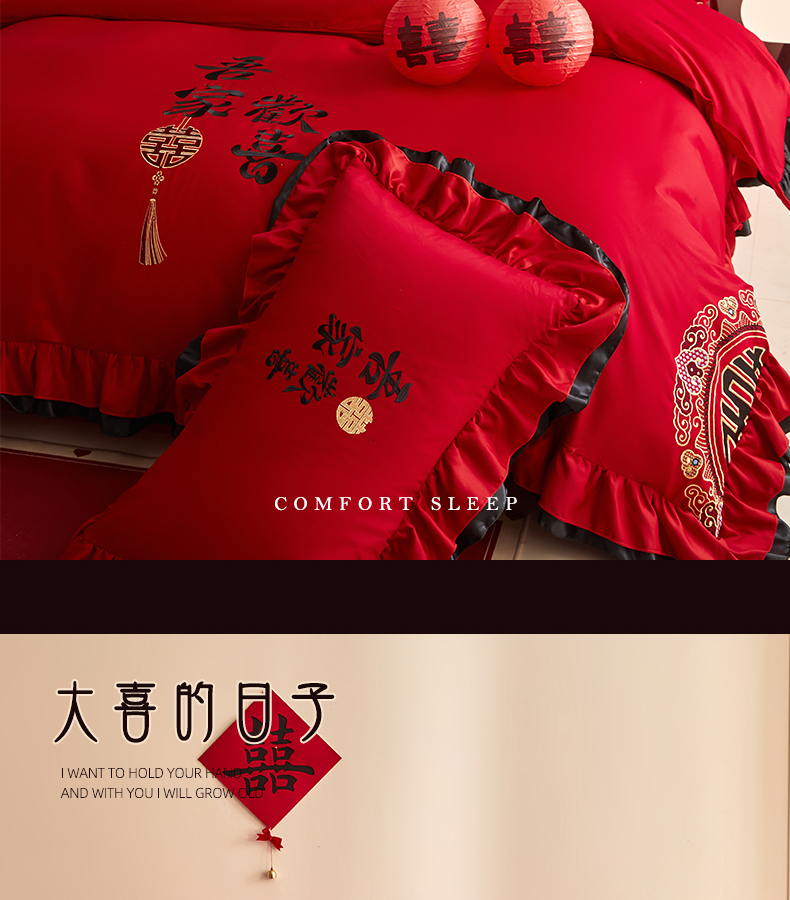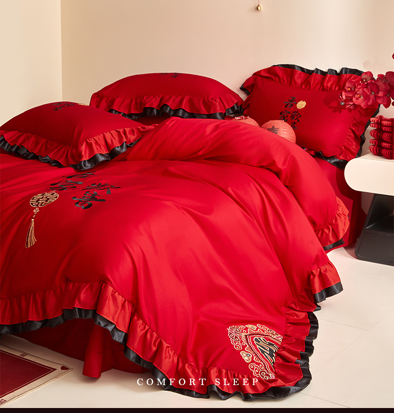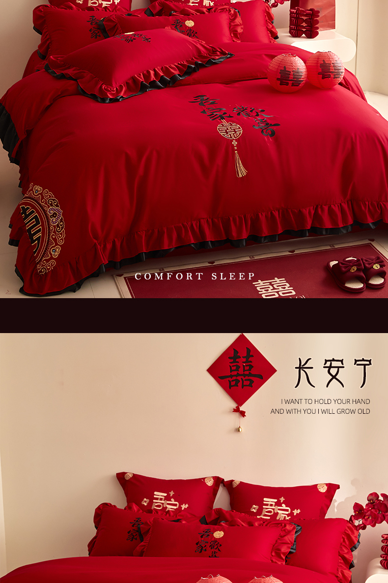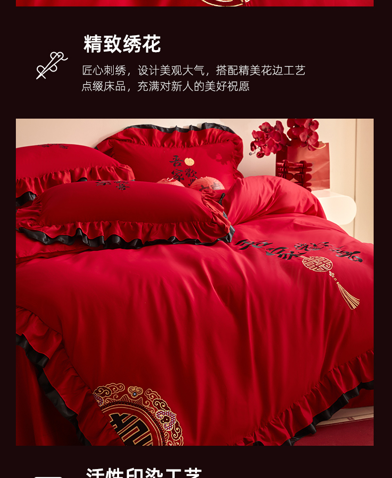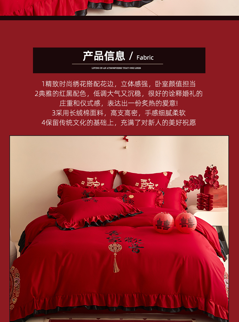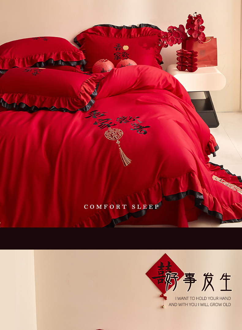 当前位置: 91家纺网 > 商品网购 > 床品套件 > 四件套 > 婚庆四件套 > 玉雅家纺 2025新款长绒棉花边式红黑格调婚庆四件套 花边款-多欢喜