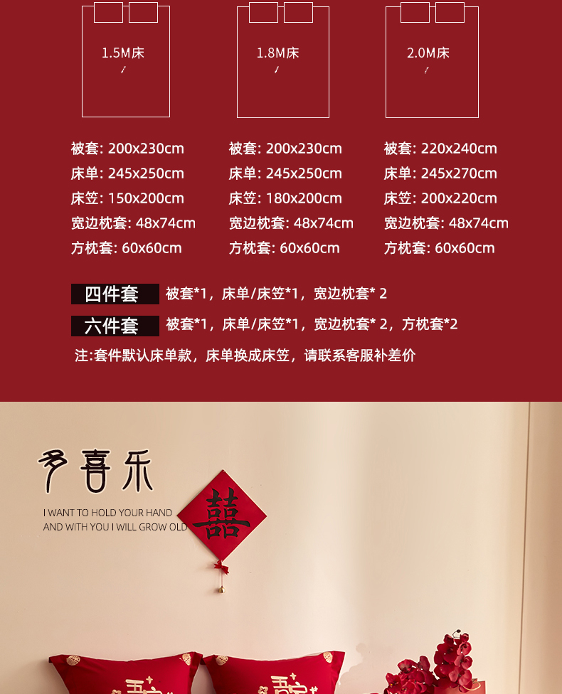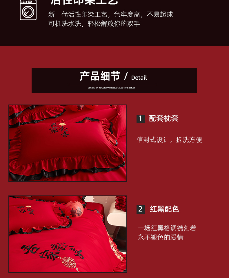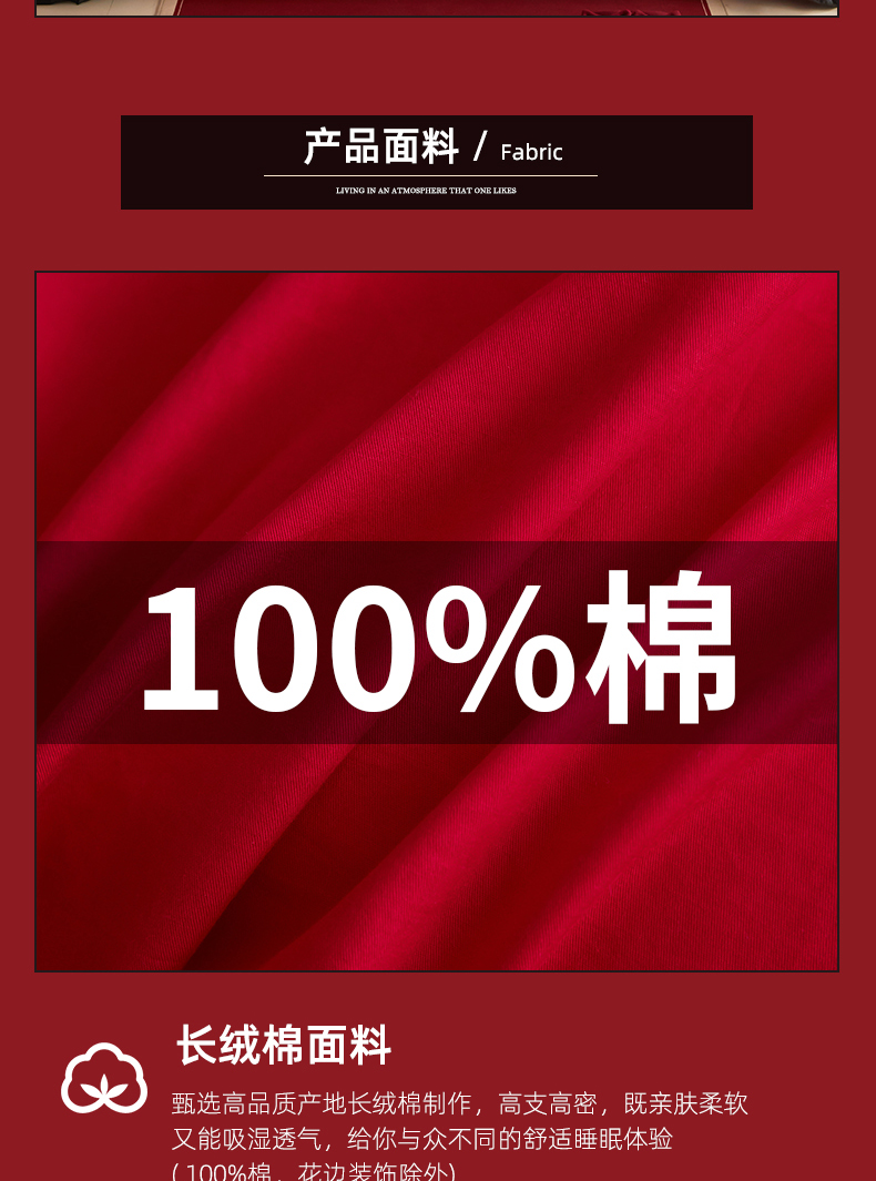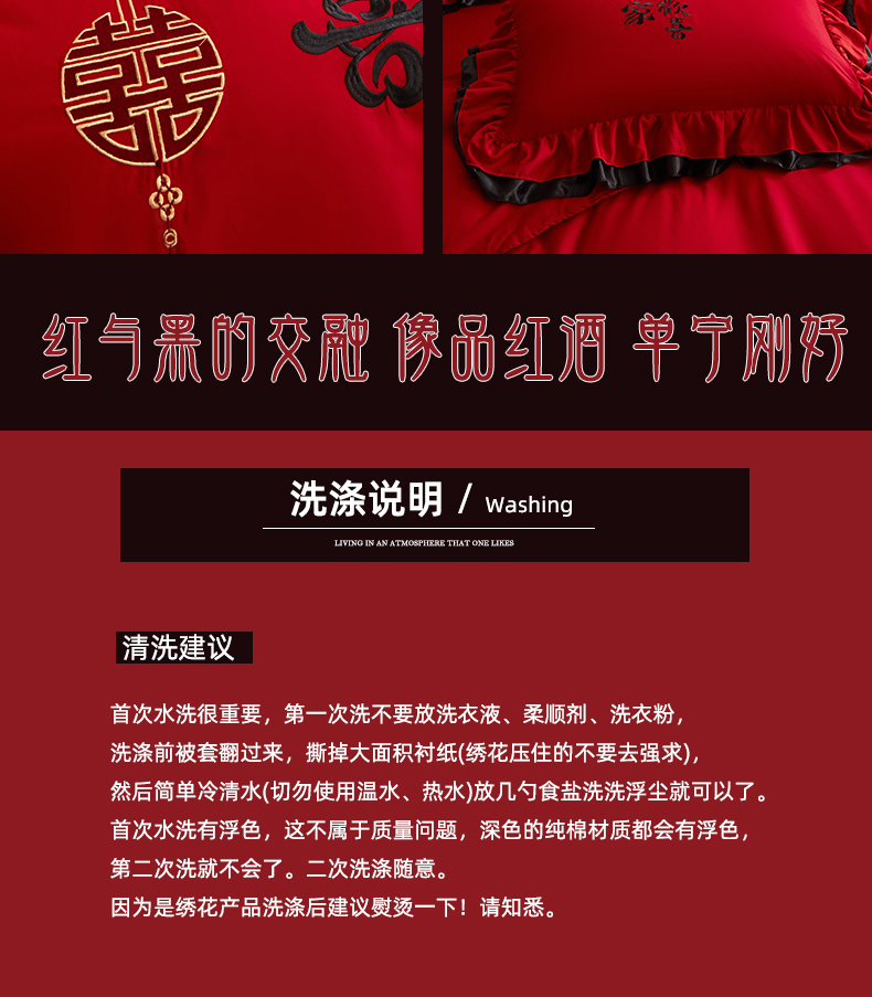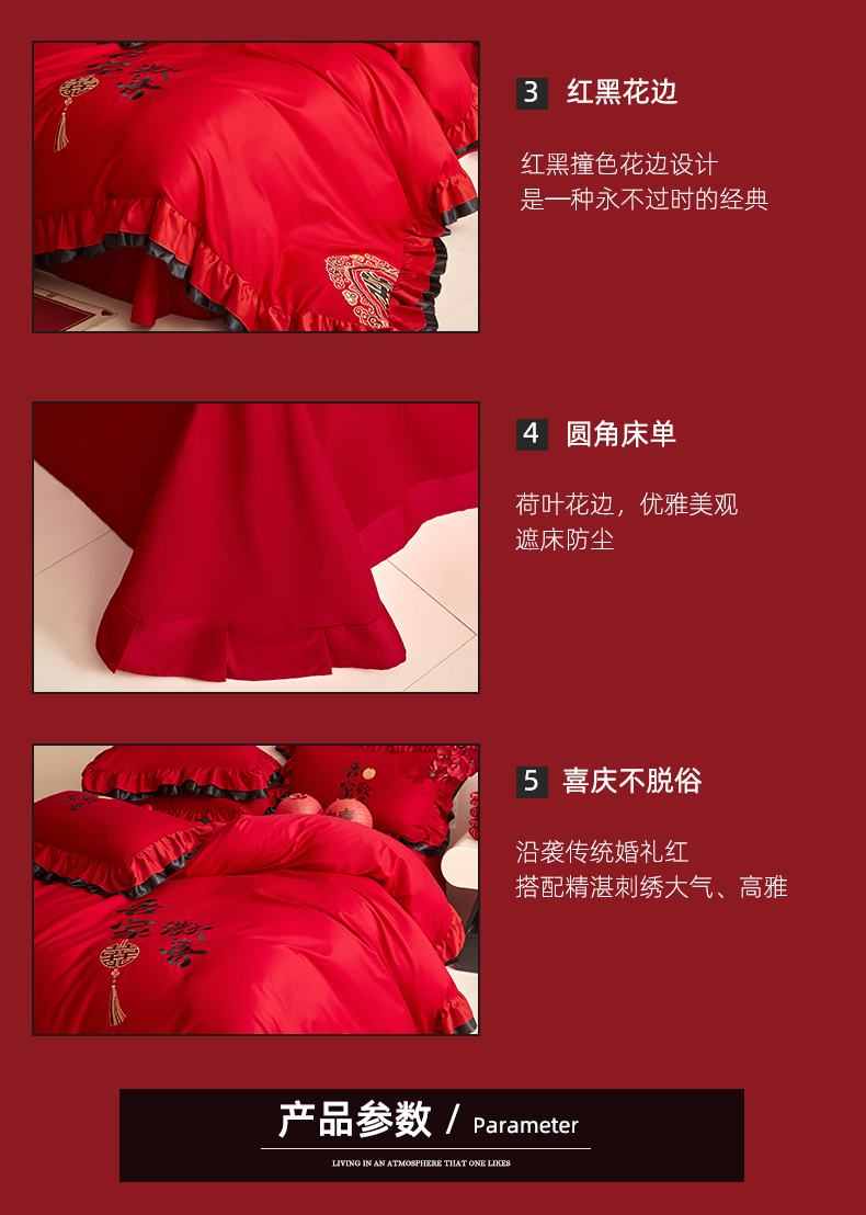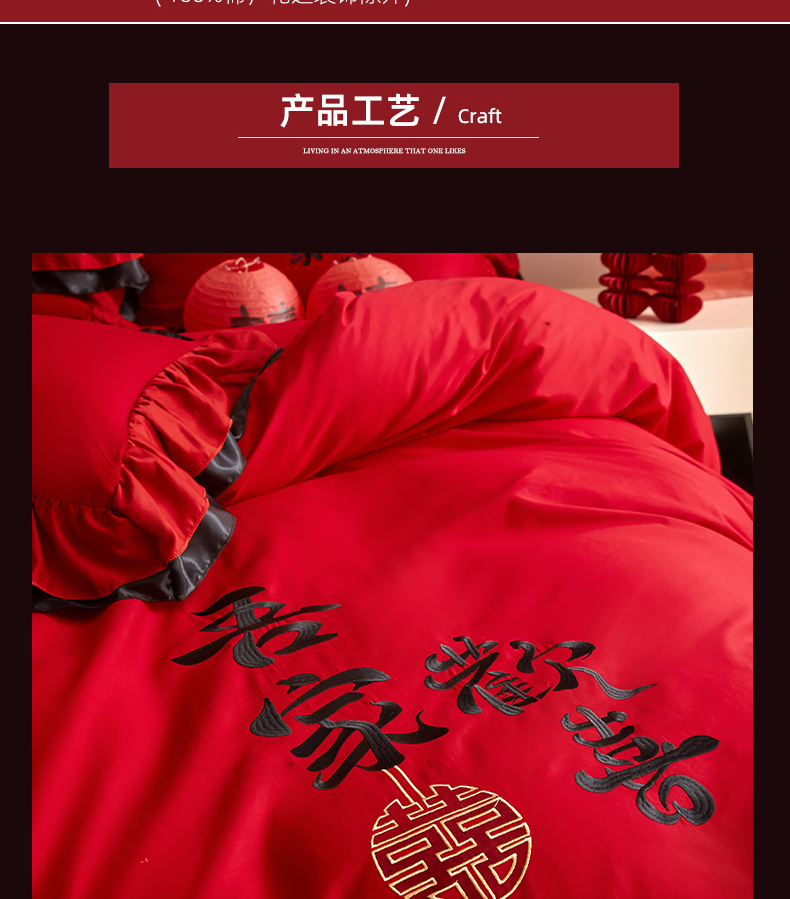 当前位置: 91家纺网 > 商品网购 > 床品套件 > 四件套 > 婚庆四件套 > 玉雅家纺 2025新款长绒棉花边式红黑格调婚庆四件套 花边款-多欢喜