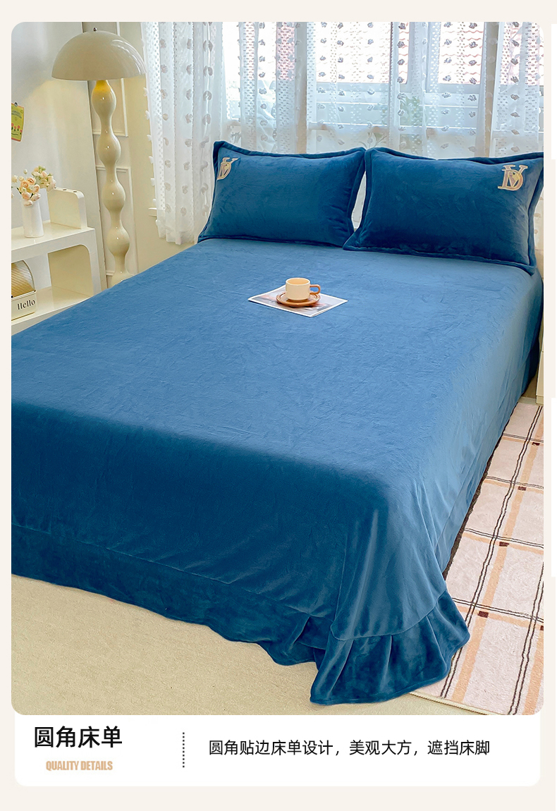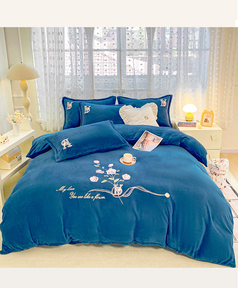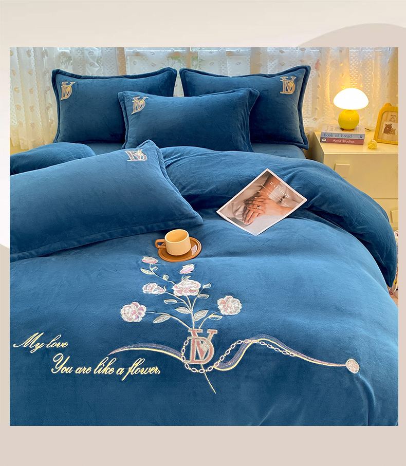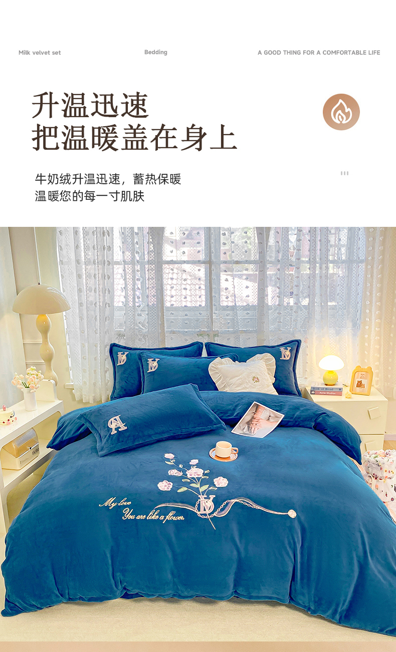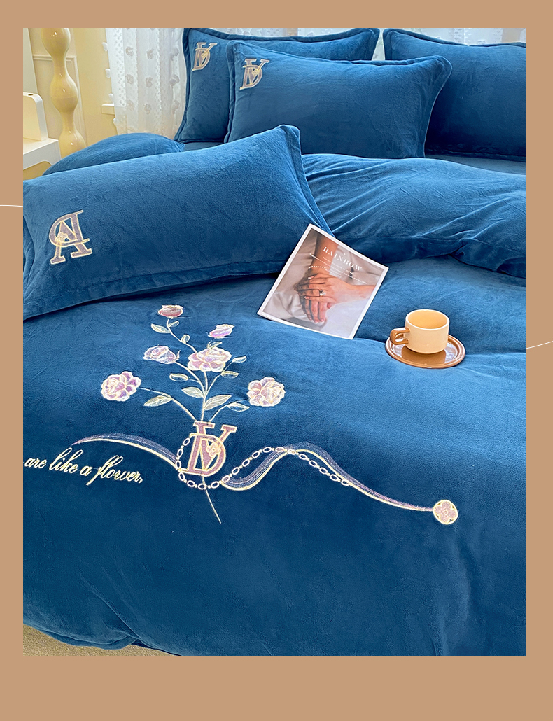 晶缦家纺 2024新款高克重牛奶绒刺绣花四件套 点点花季-藏蓝