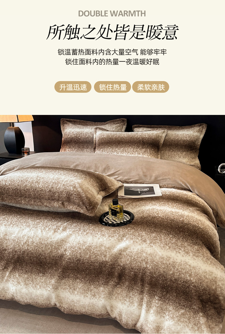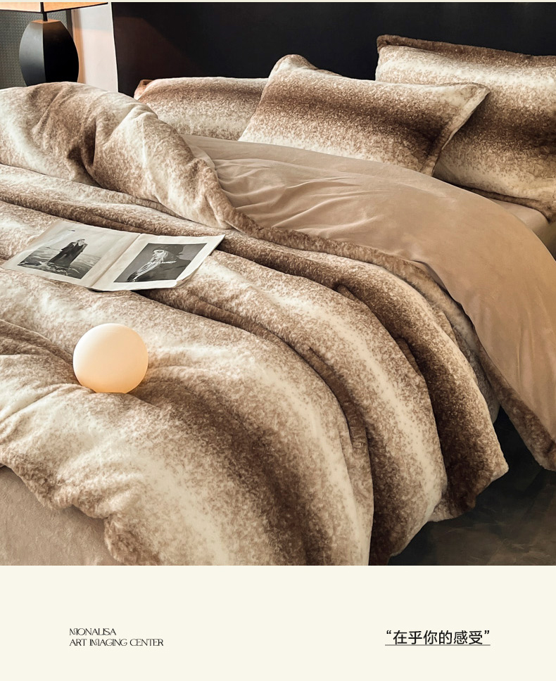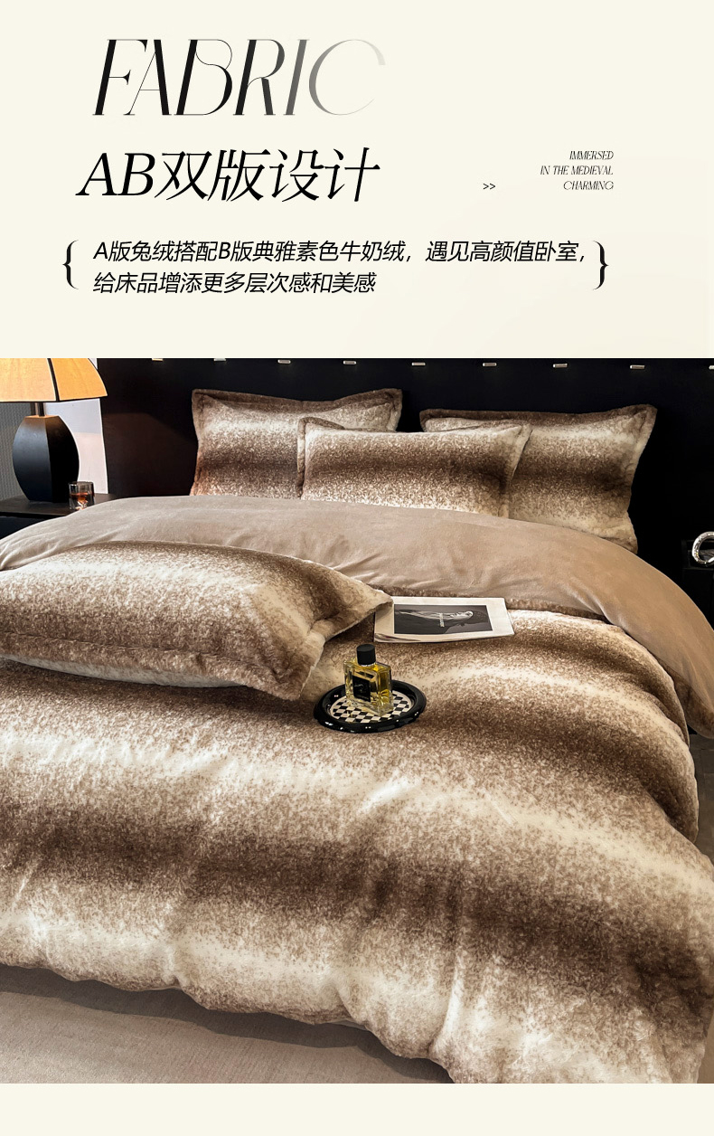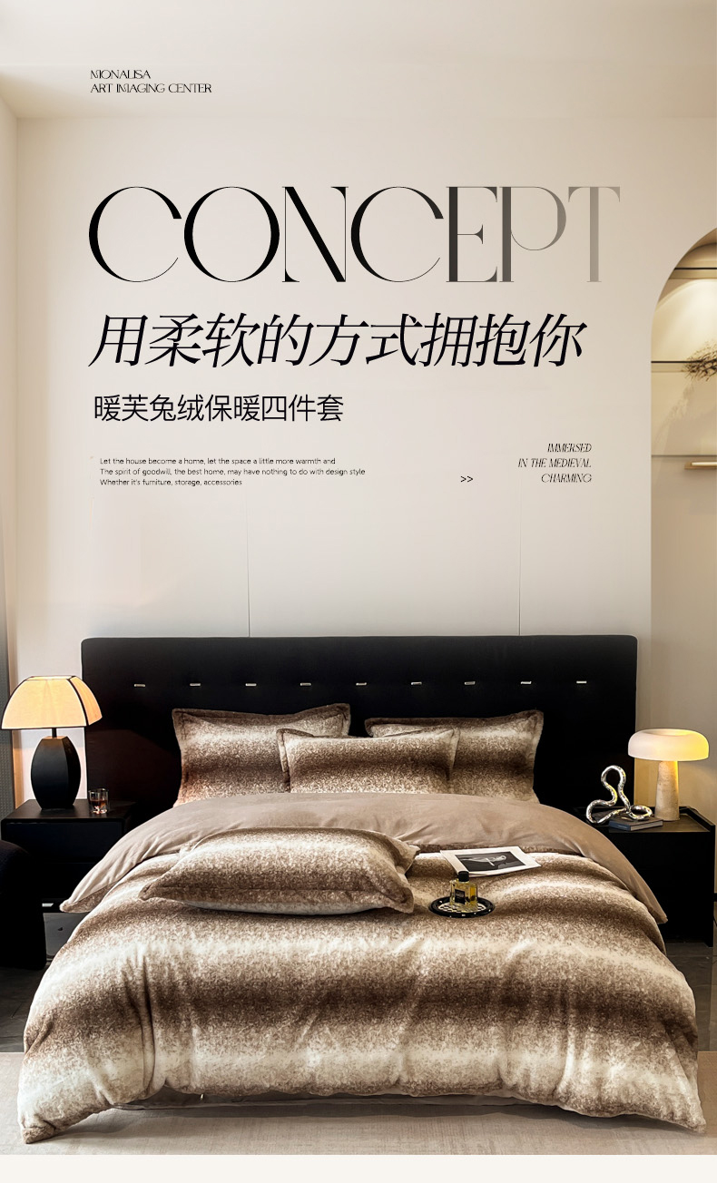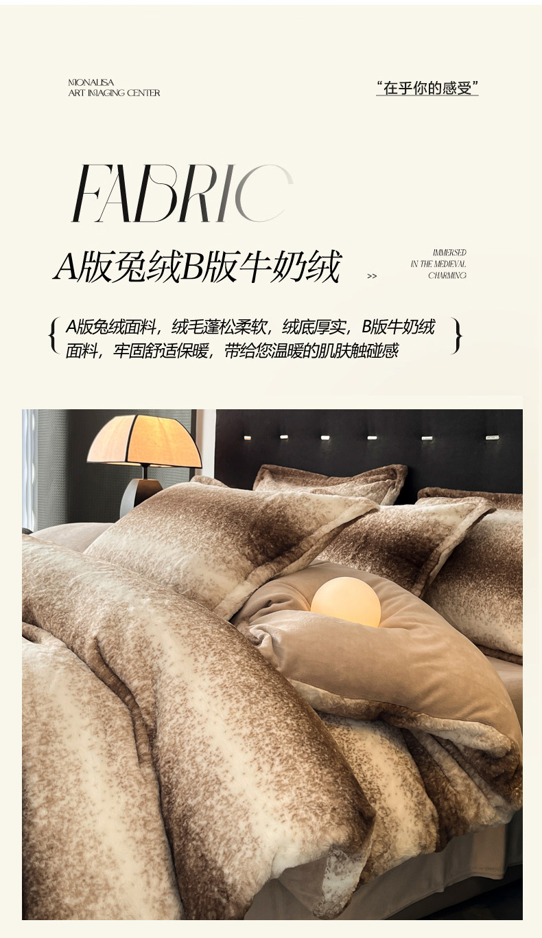 当前位置: 91家纺网 > 商品网购 > 床品套件 > 四件套 > 兔毛绒四件套 > 慕尚家纺 2025新款高端亲肤舒适暖芙兔毛四件套 暖芙-白调咖