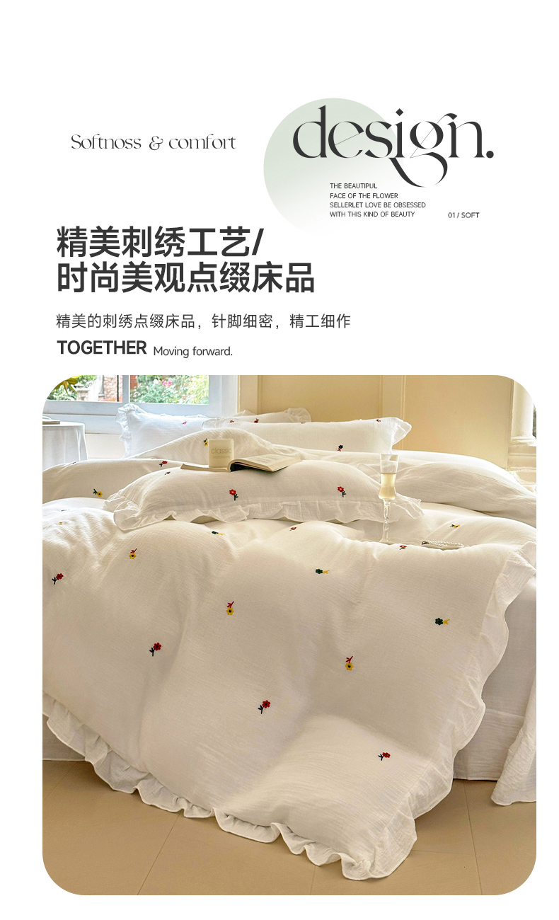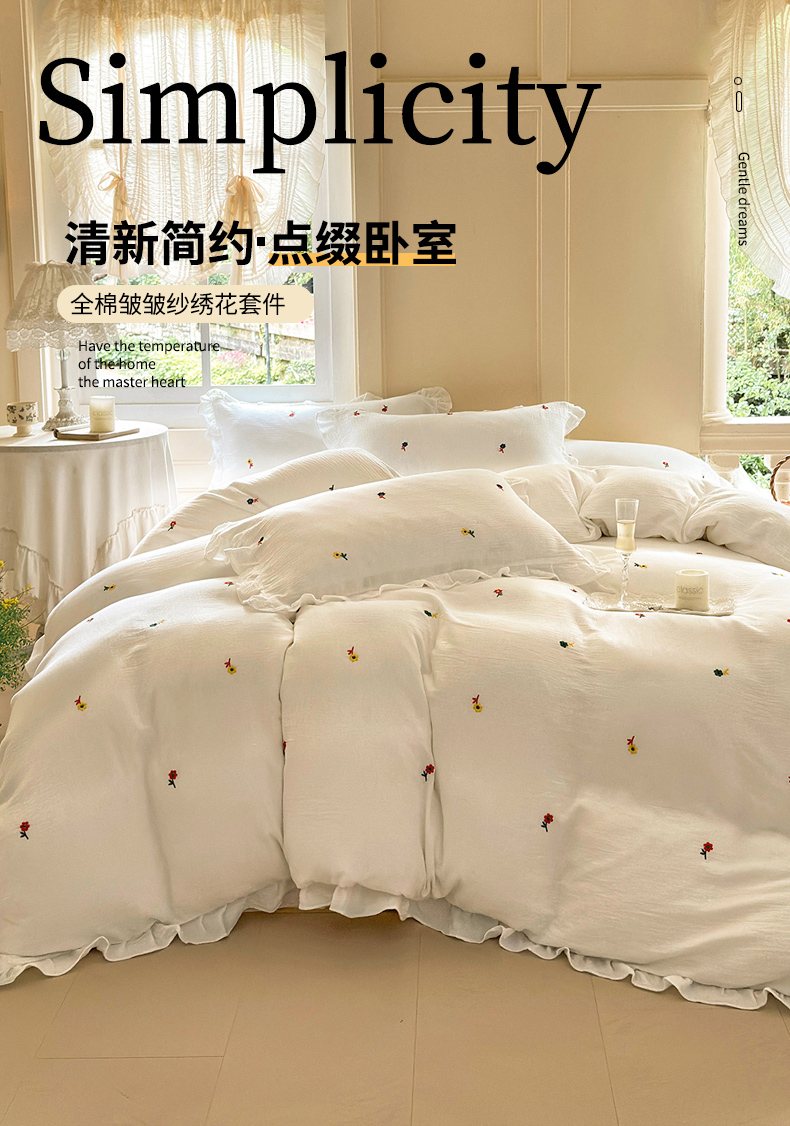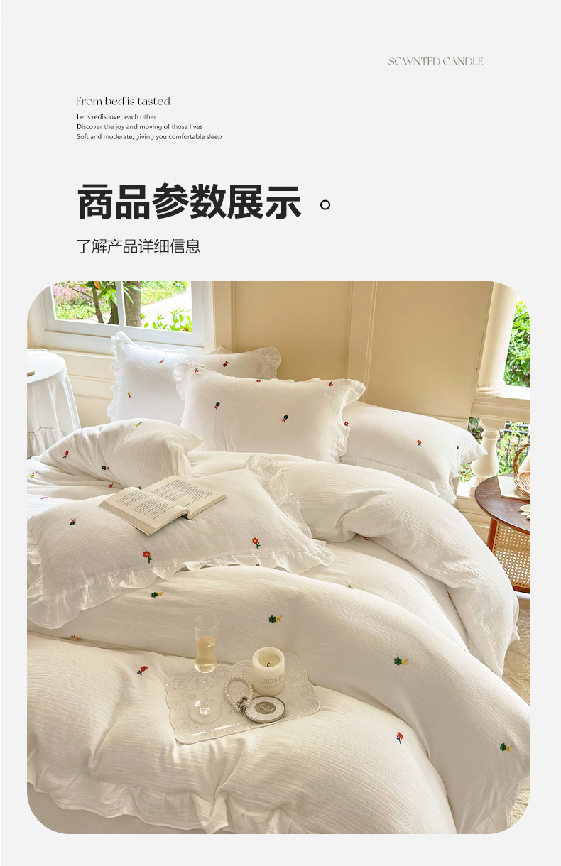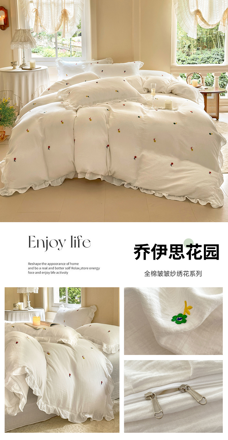 商品名称:木楌 2024全棉皱皱纱荷叶边刺绣工艺款四件套 乔伊斯花园