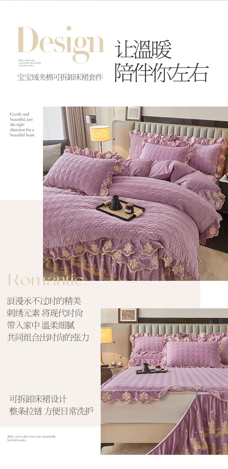 • 91家纺网 家纺一手货源 找家纺 锦格 2024新款浪漫宝宝绒夹棉可拆洗床裙三件套 盛世芳华 香芋紫