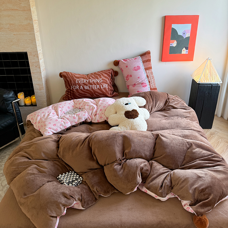 柚子YOUTH 2024新款加厚牛奶绒可脱卸毛球四件套-球球款 红大格