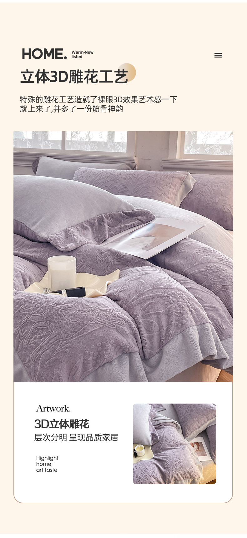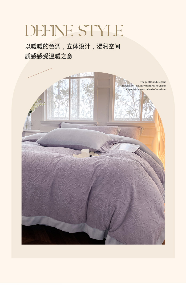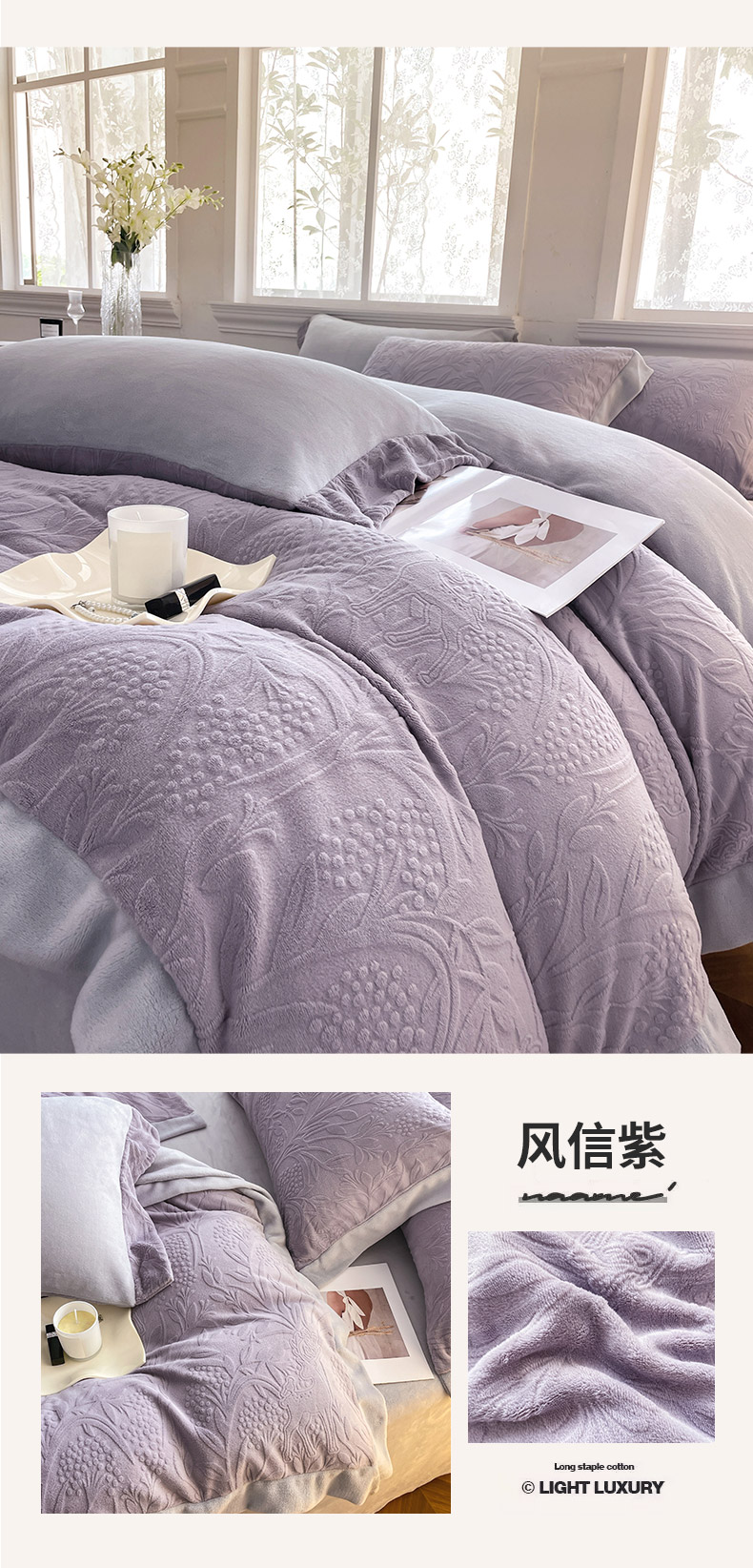 商品名称:2024新款A类雕花绒牛奶绒四件套宝宝绒婴儿绒床单被套保暖套件新品-米鹿提 风信紫