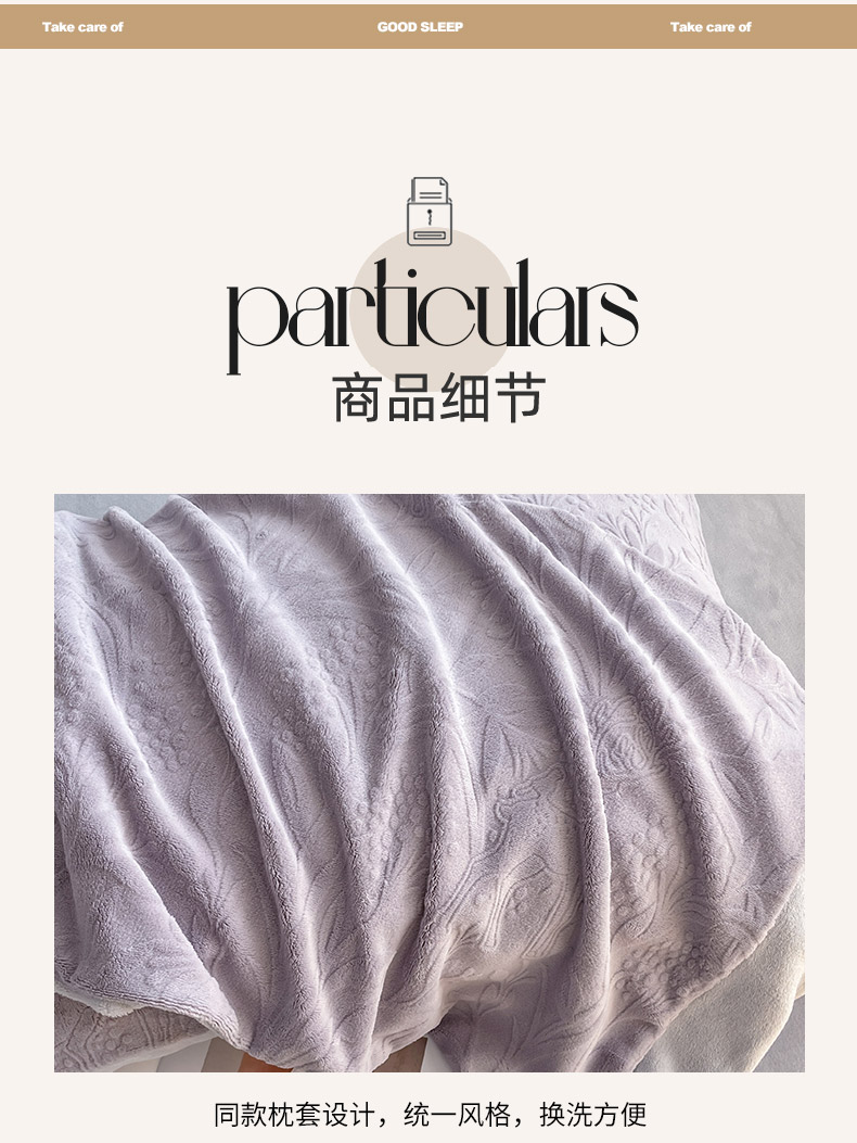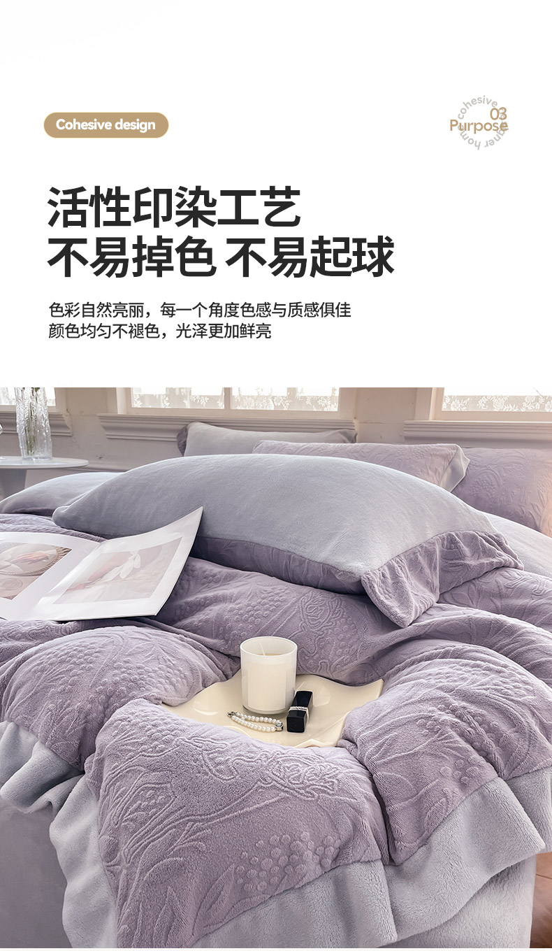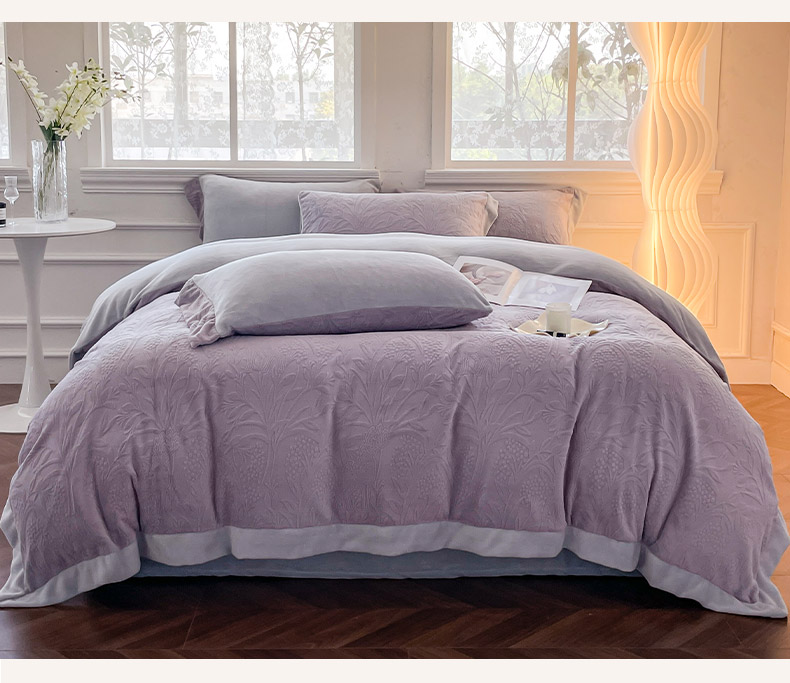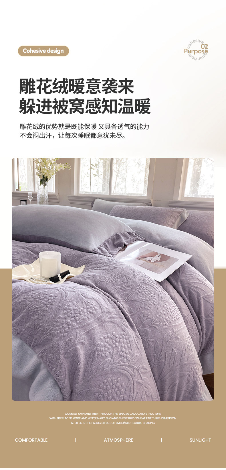 商品名称:2024新款A类雕花绒牛奶绒四件套宝宝绒婴儿绒床单被套保暖套件新品-米鹿提 风信紫