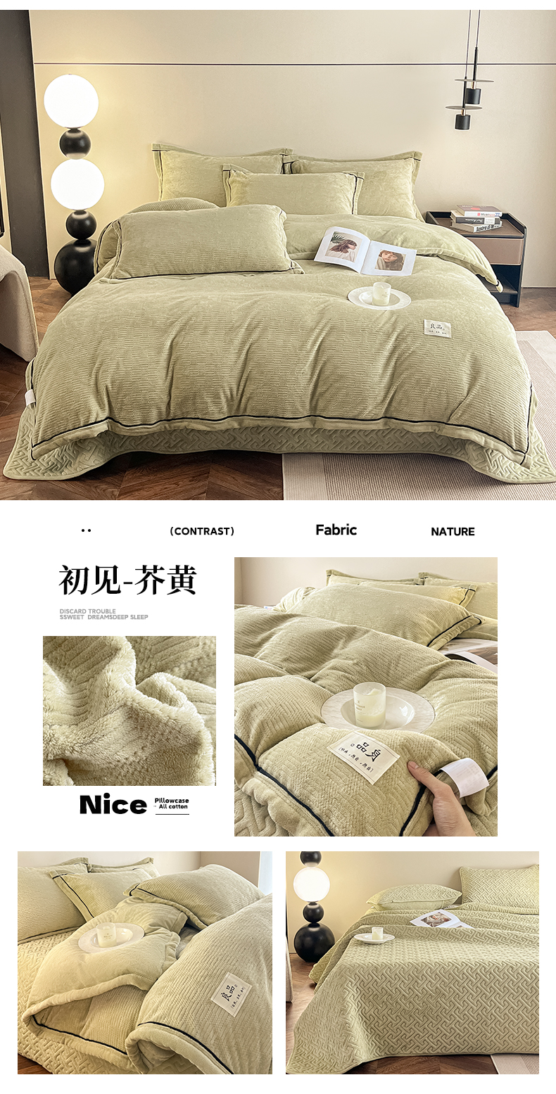 商品名称:欧邦 新款提花针织绒牛奶绒夹棉床盖四件套初见系列 初见-芥黄