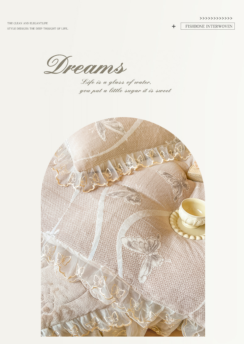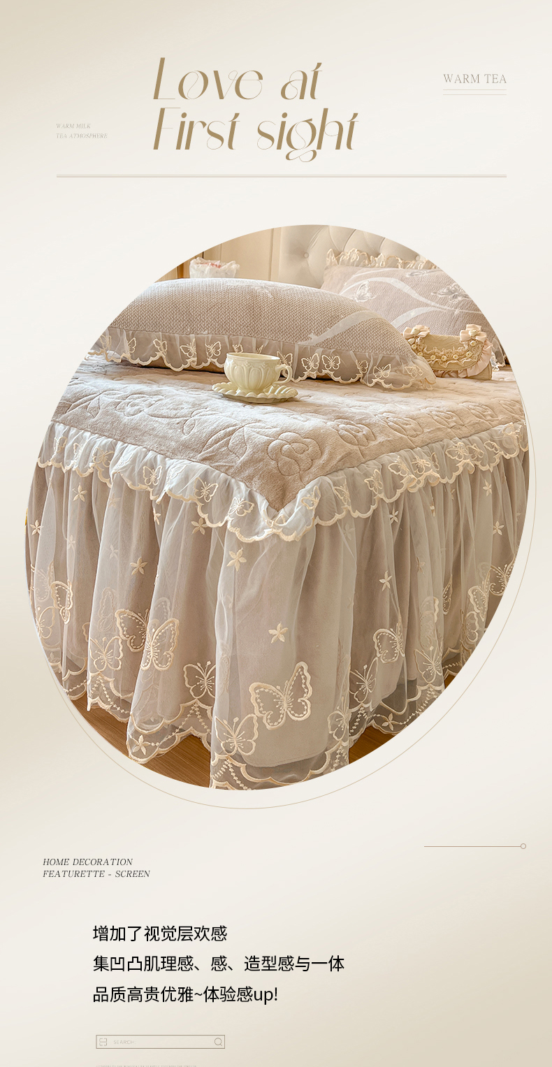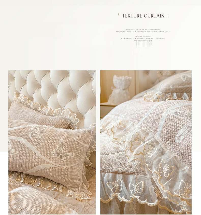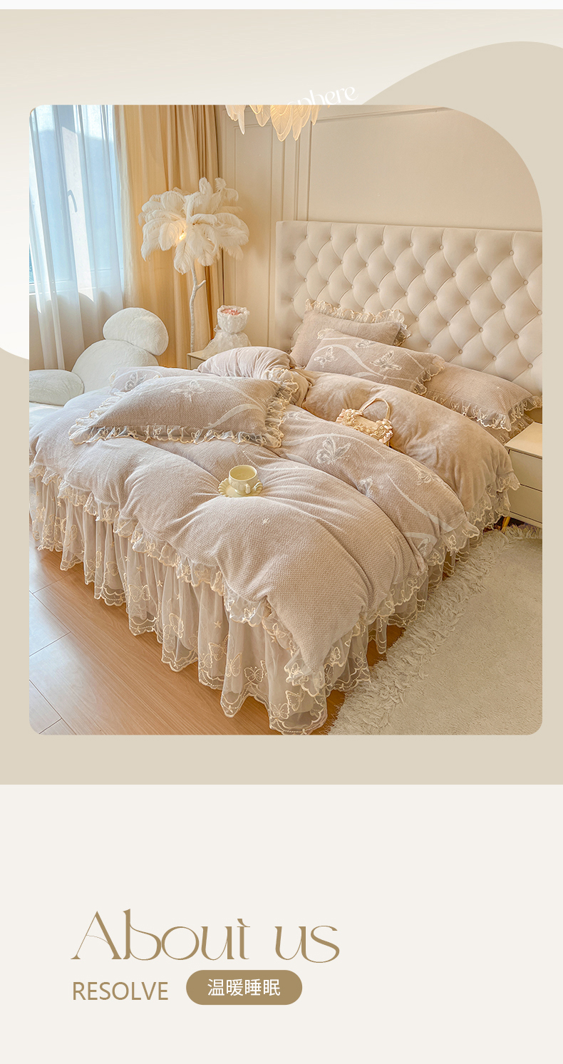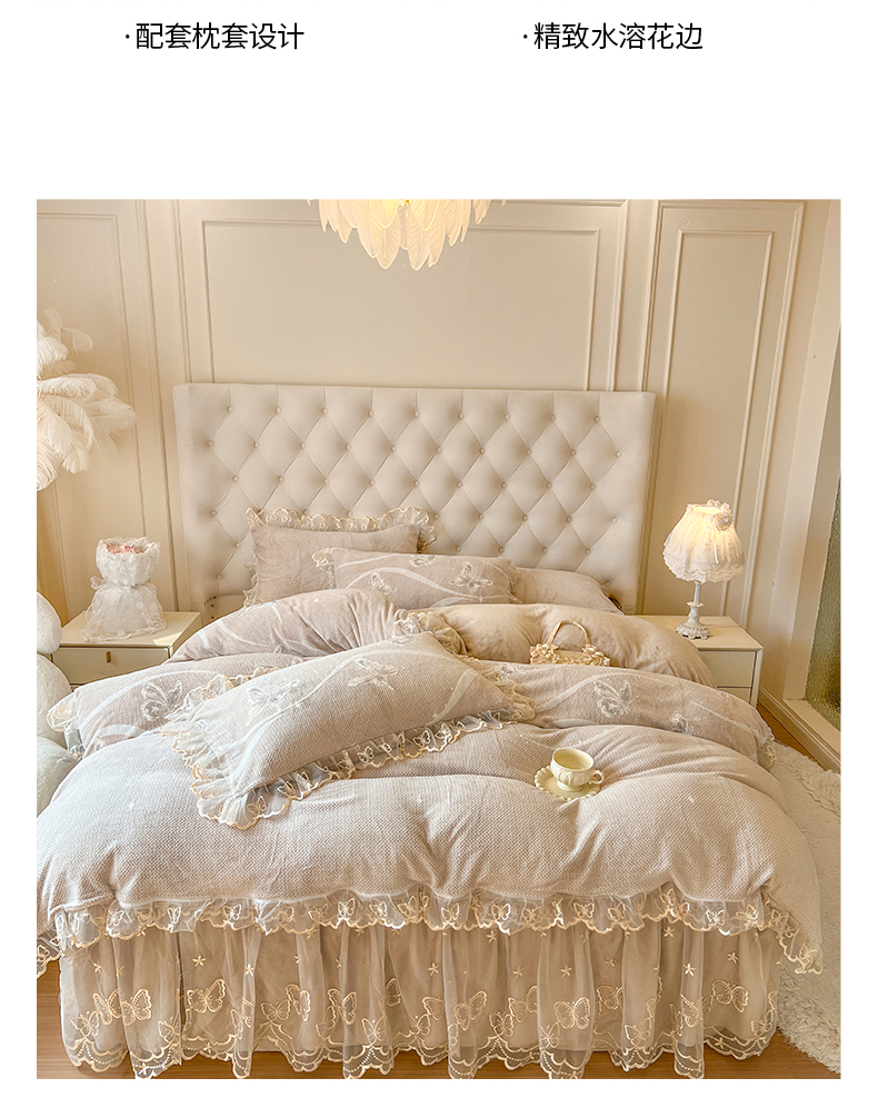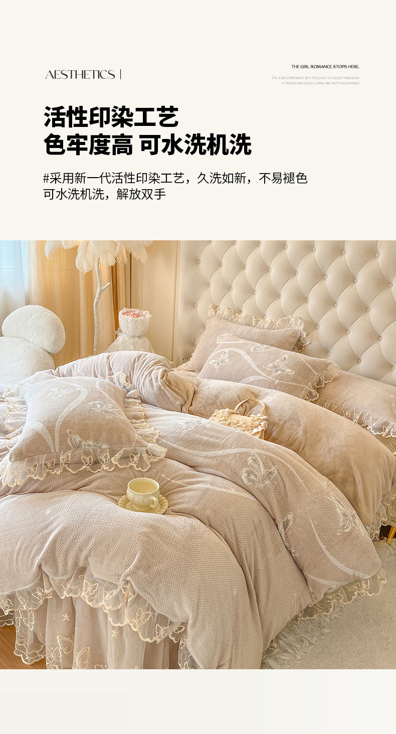 商品名称:2024新款雕花绒牛奶绒重工艺床裙四件套-蝴蝶梦境 奶咖
