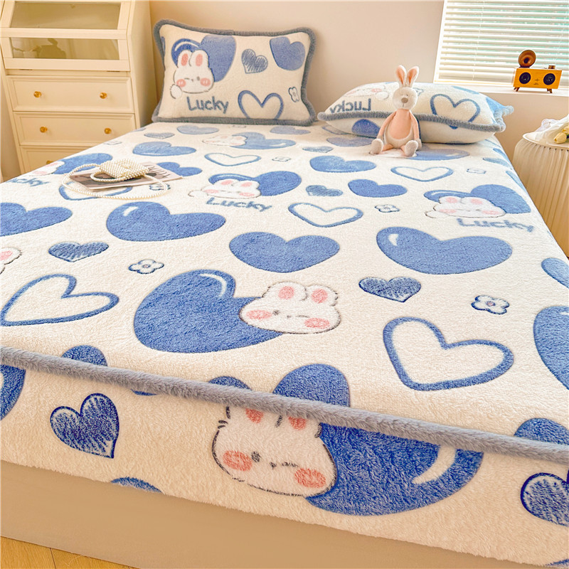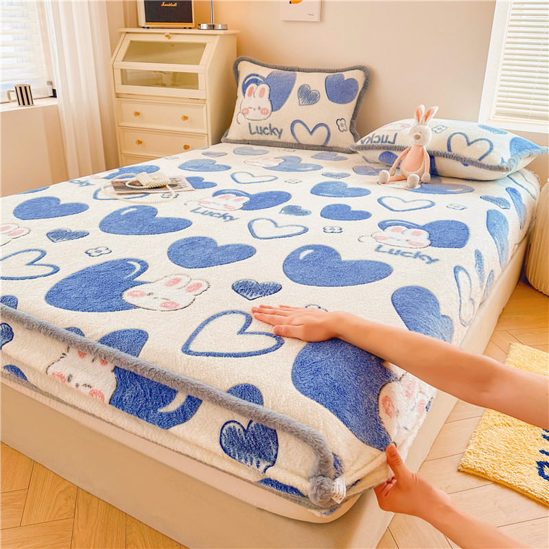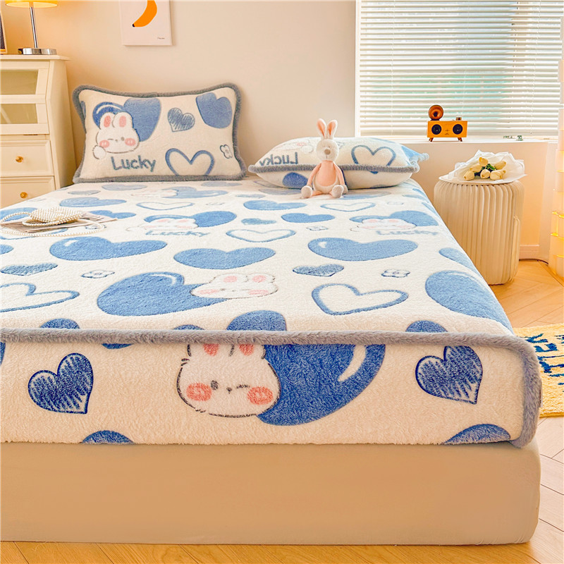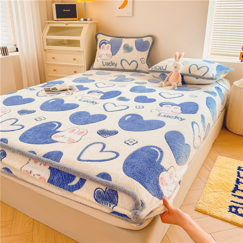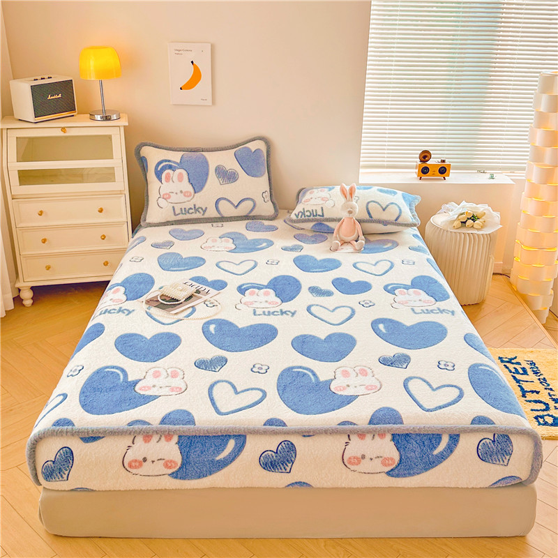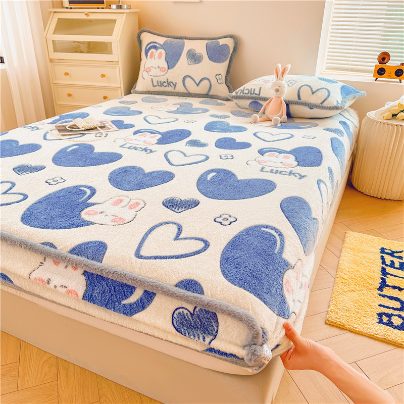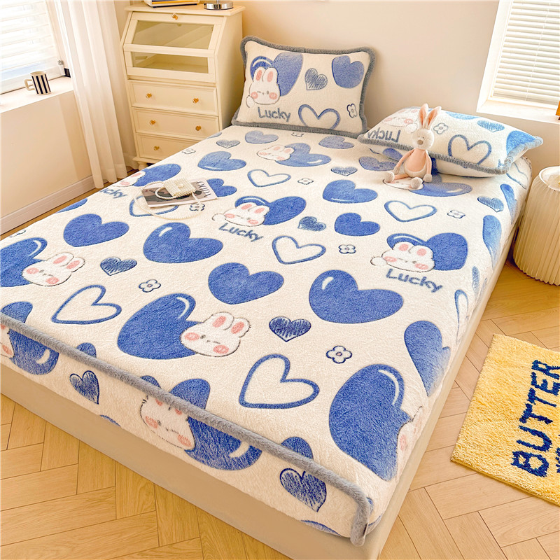 喜居 2024新款雪花绒床笠印花牛奶绒床笠三件套单床笠 爱心兔