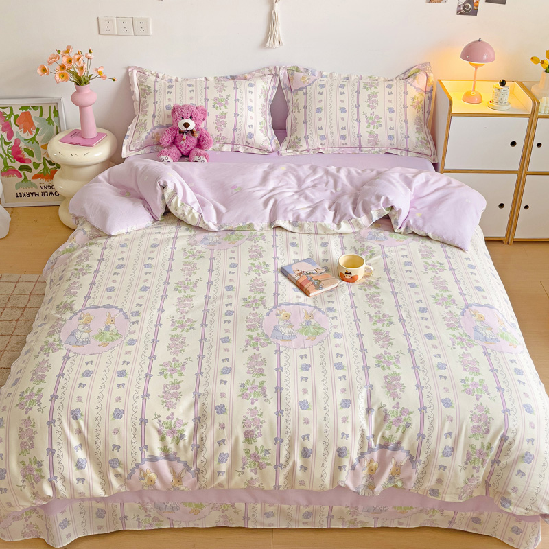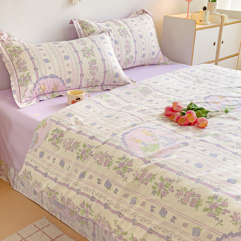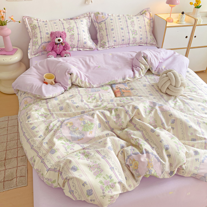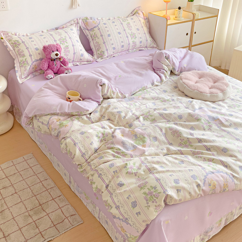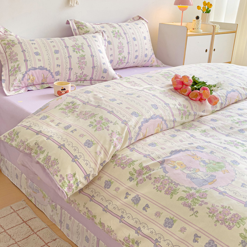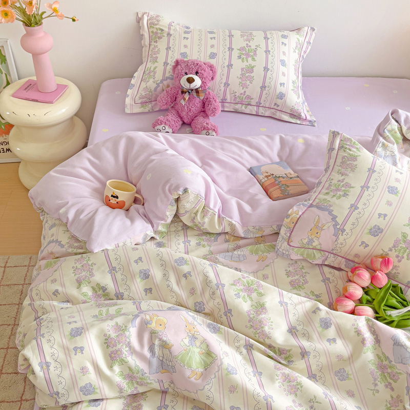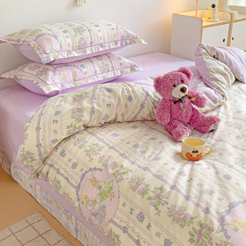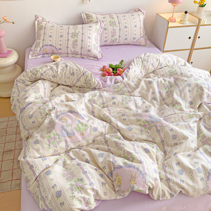 乐童家纺 2024新款直播爆款13070纯棉印花吊边款一字绣四件套 罗拉萌兔