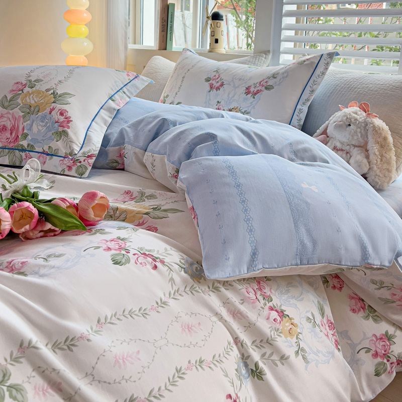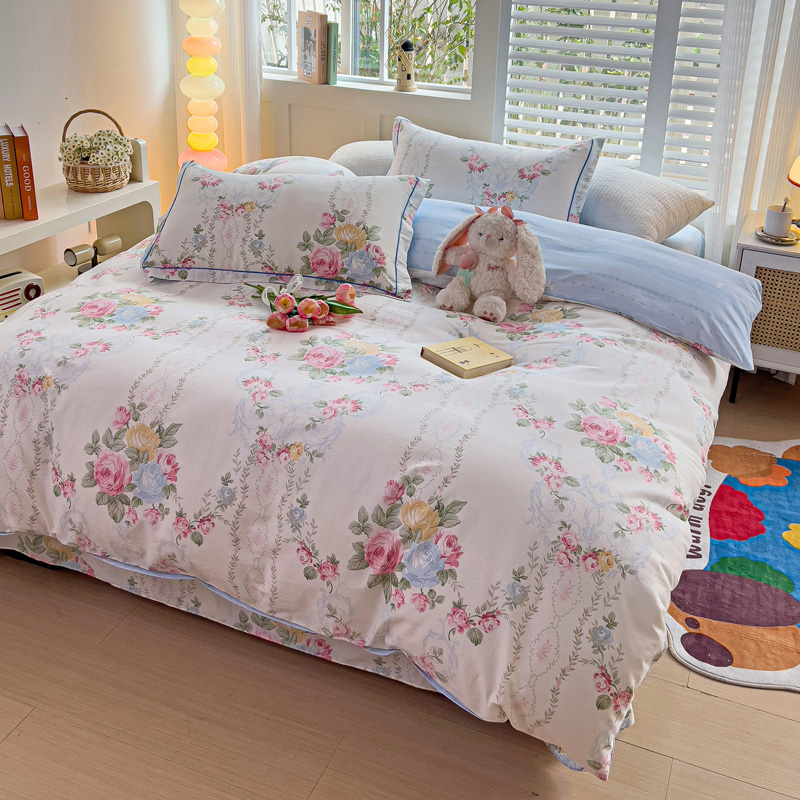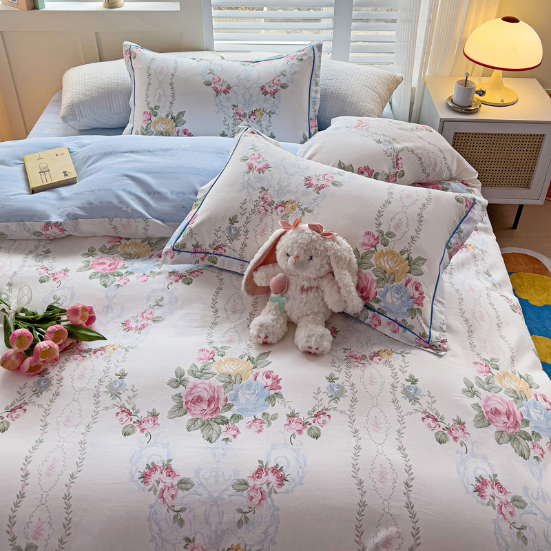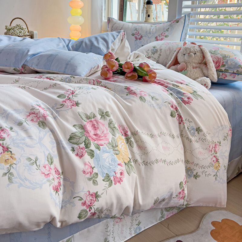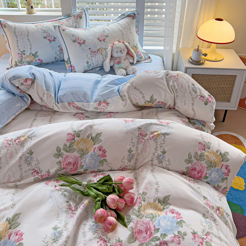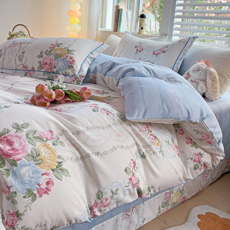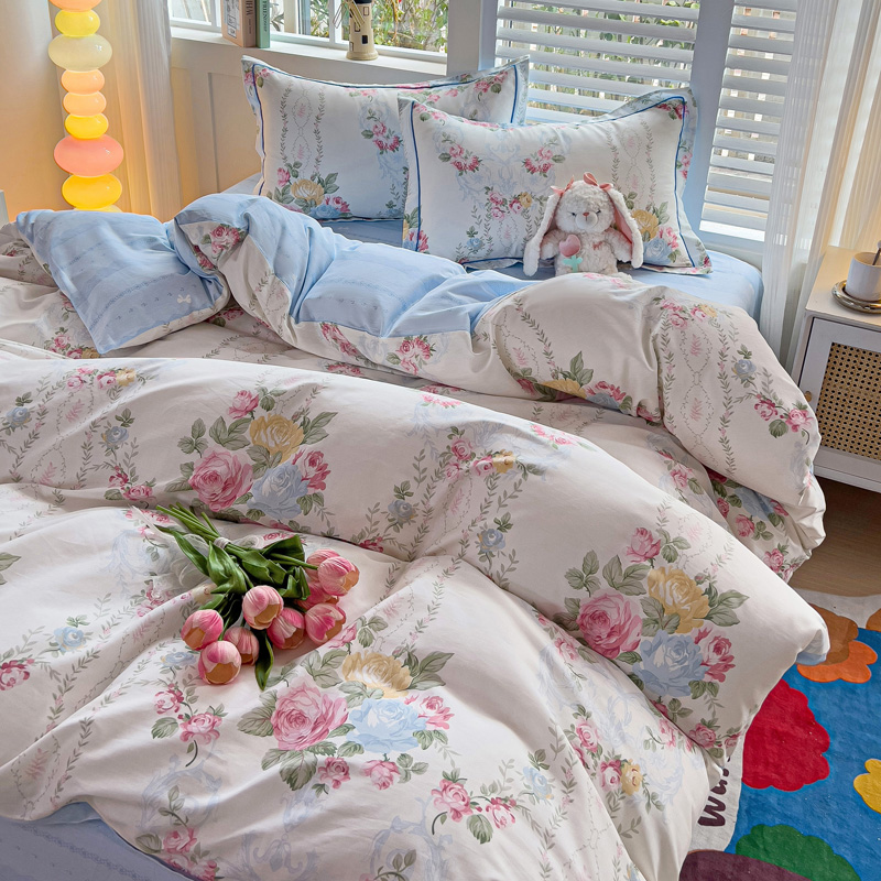 商品名称:乐童家纺 2024新款直播爆款13070纯棉印花吊边款一字绣四件套 夏日花园