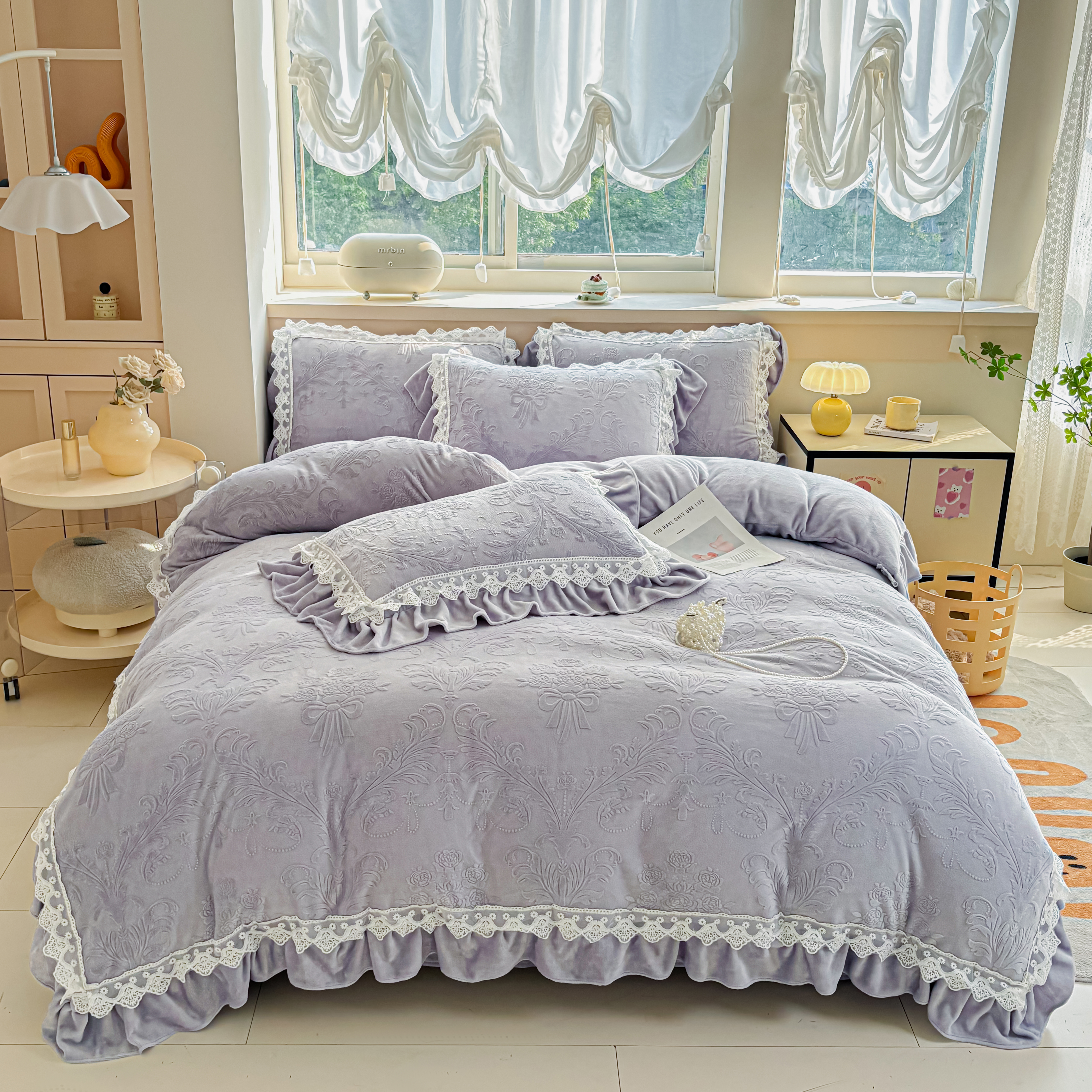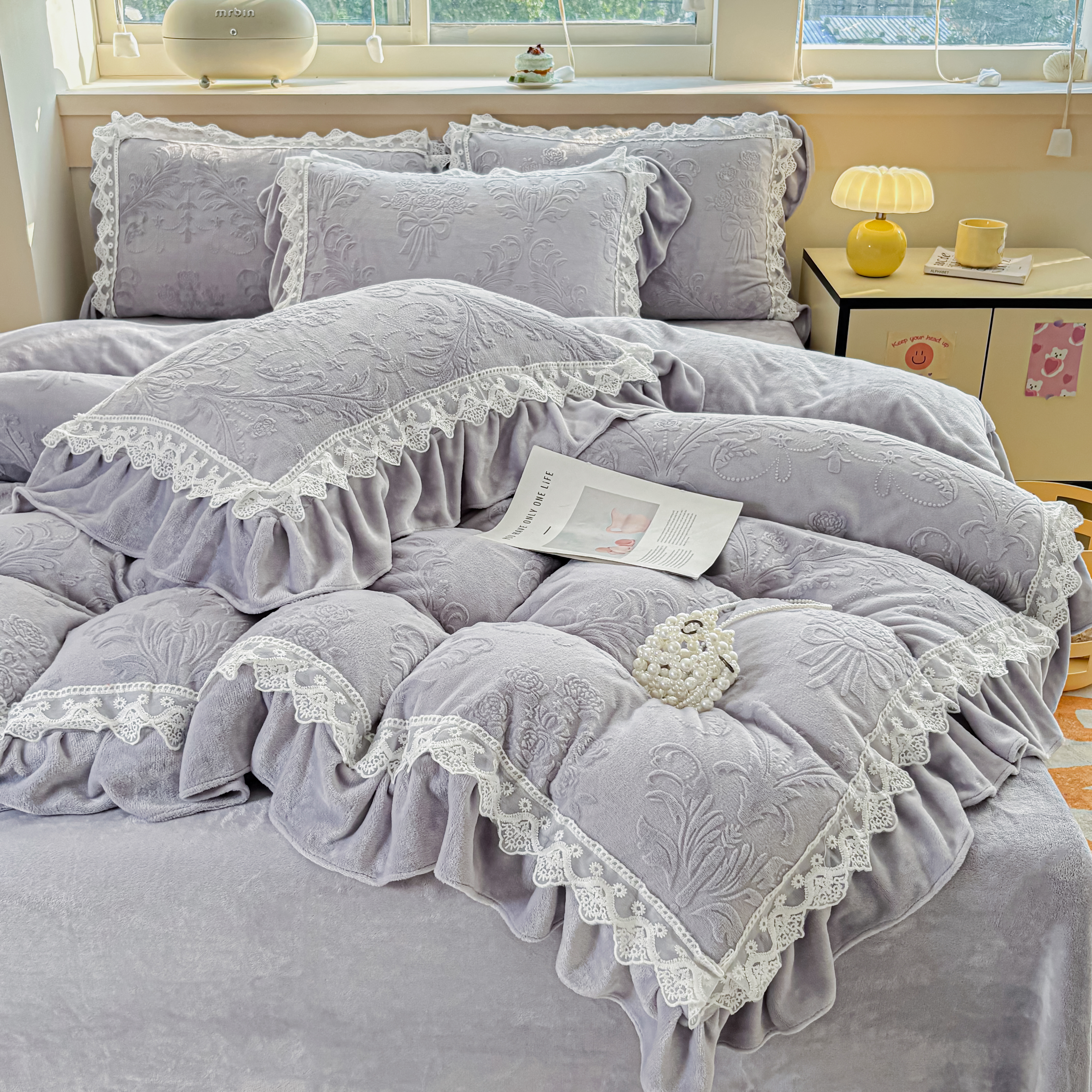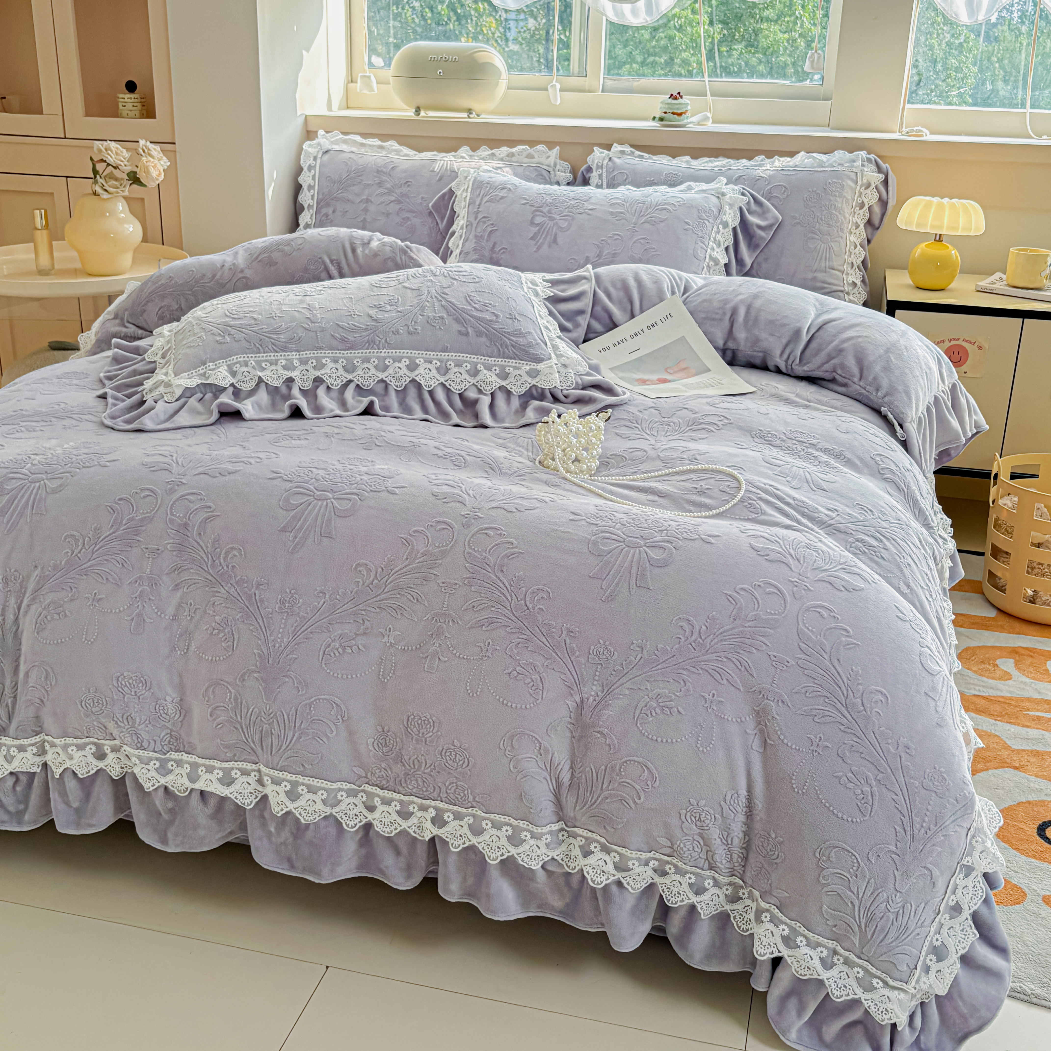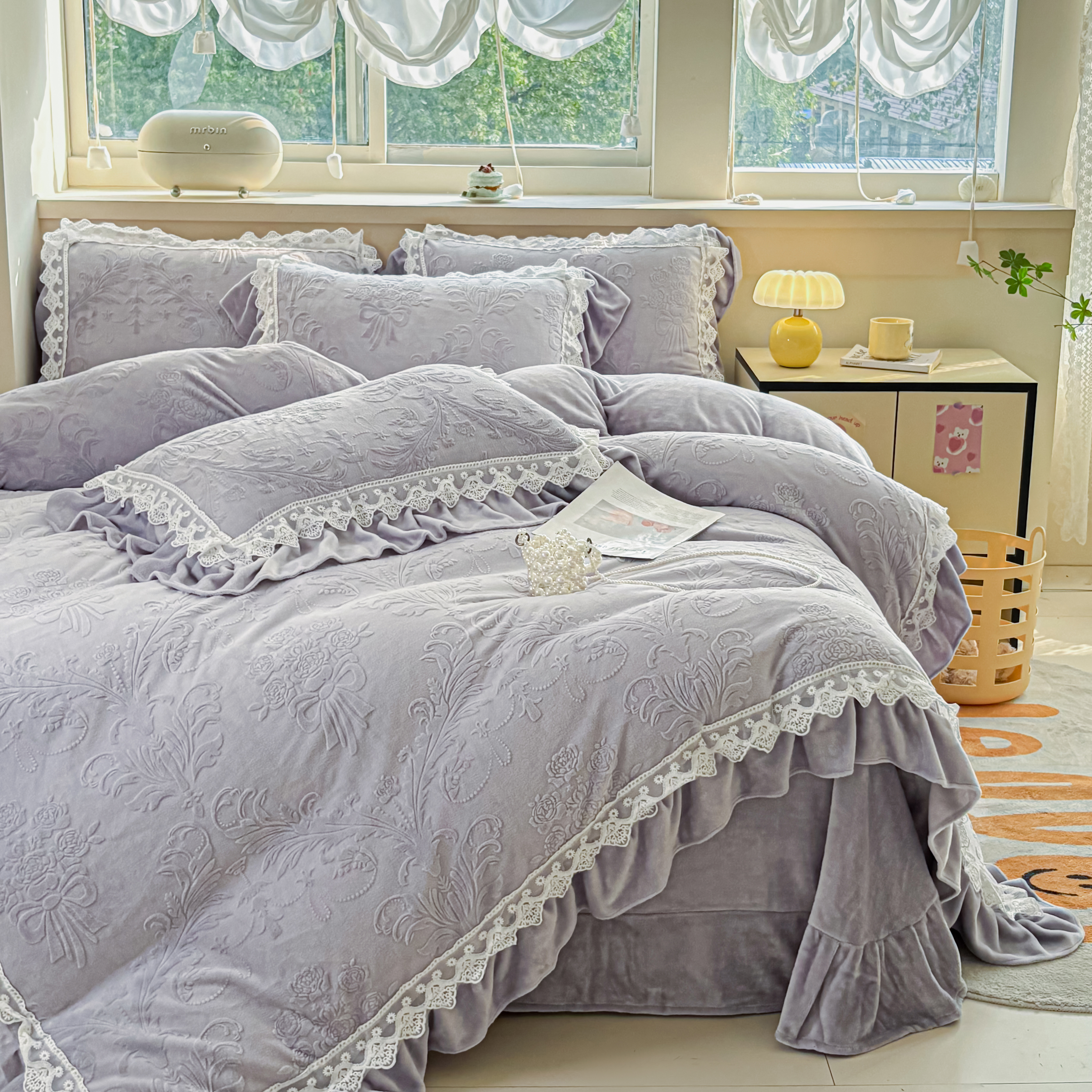 (总)锦格家纺 2025新款A类高克重雕花牛奶绒花边四件套,梦幻-玉粉,初薇-豆沙,初薇-绿,初薇-玉粉,幻梦-黄,幻梦-天蓝,蝶漫-奶白,蝶漫-天蓝