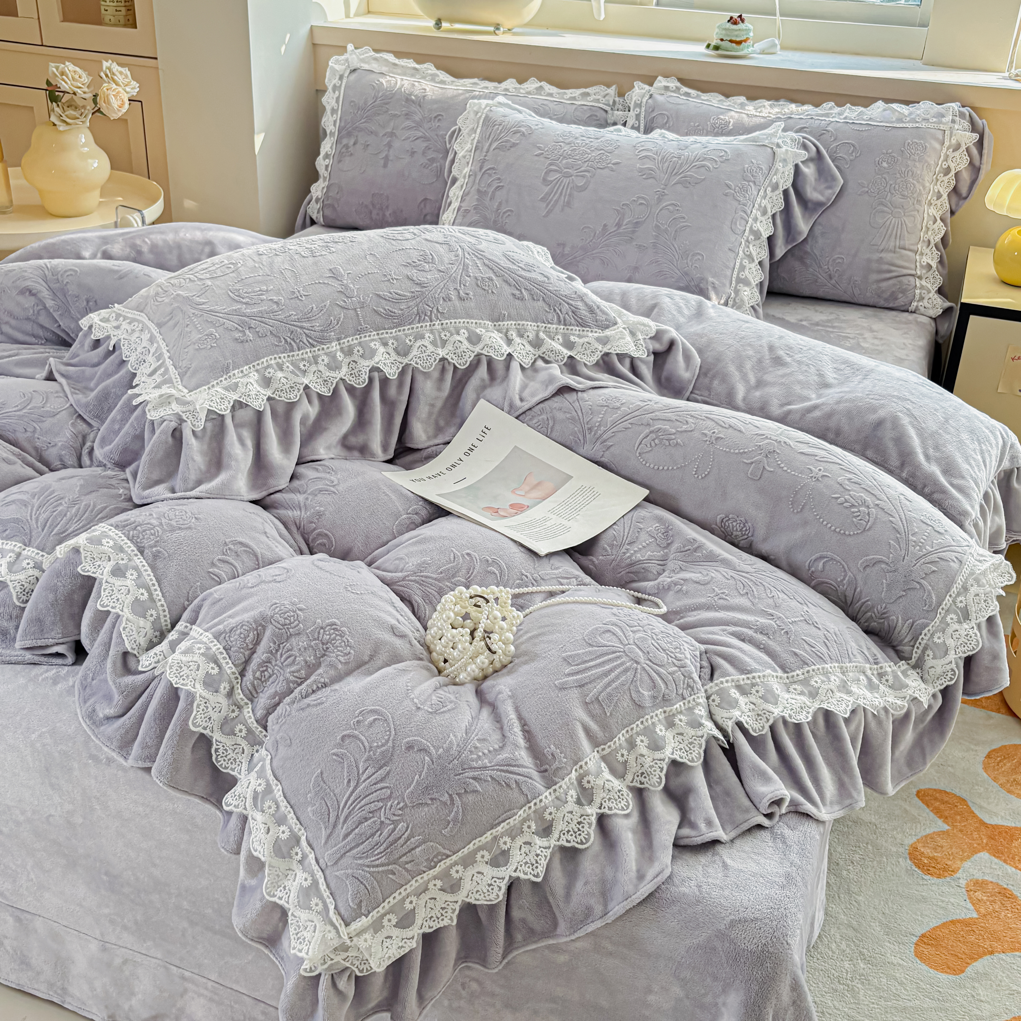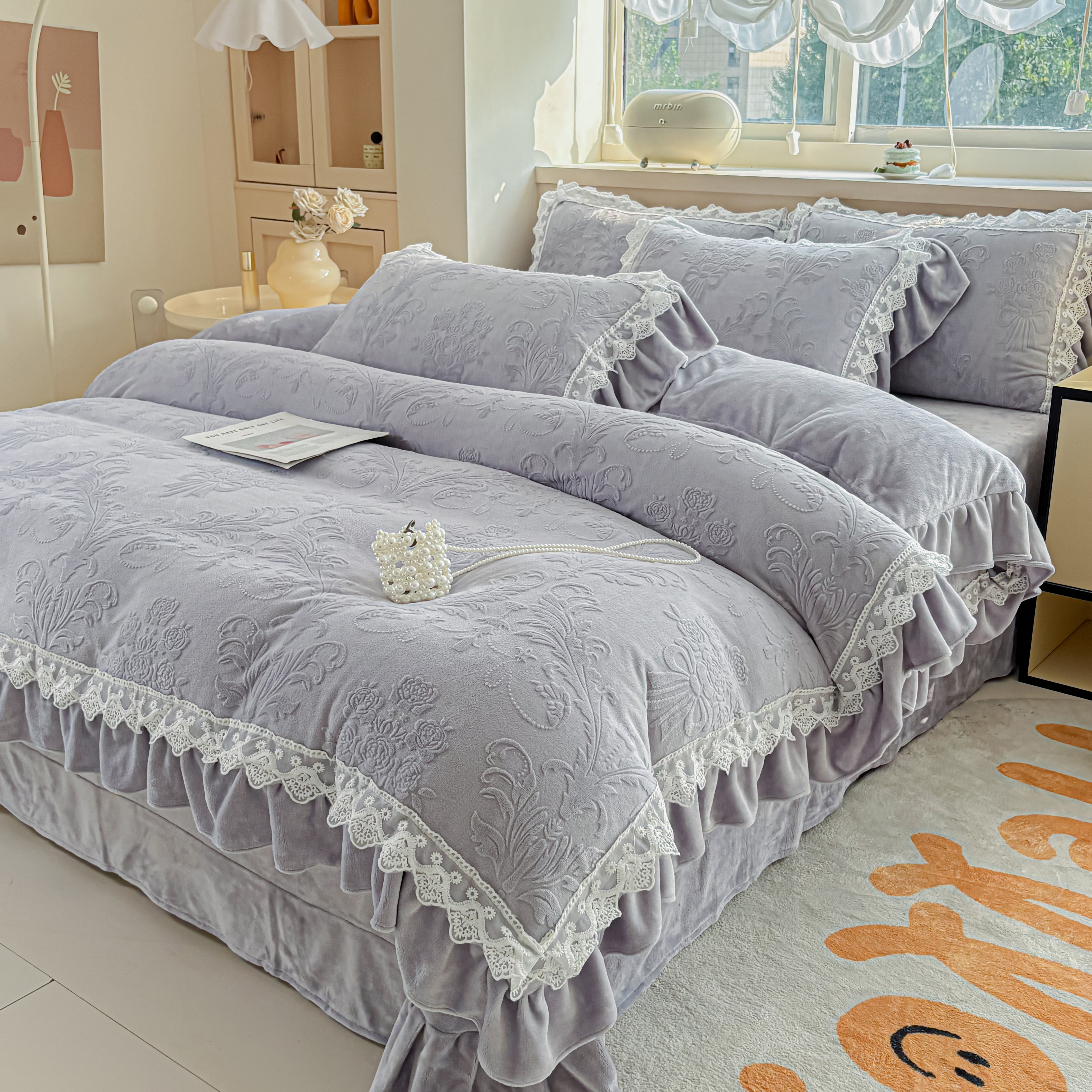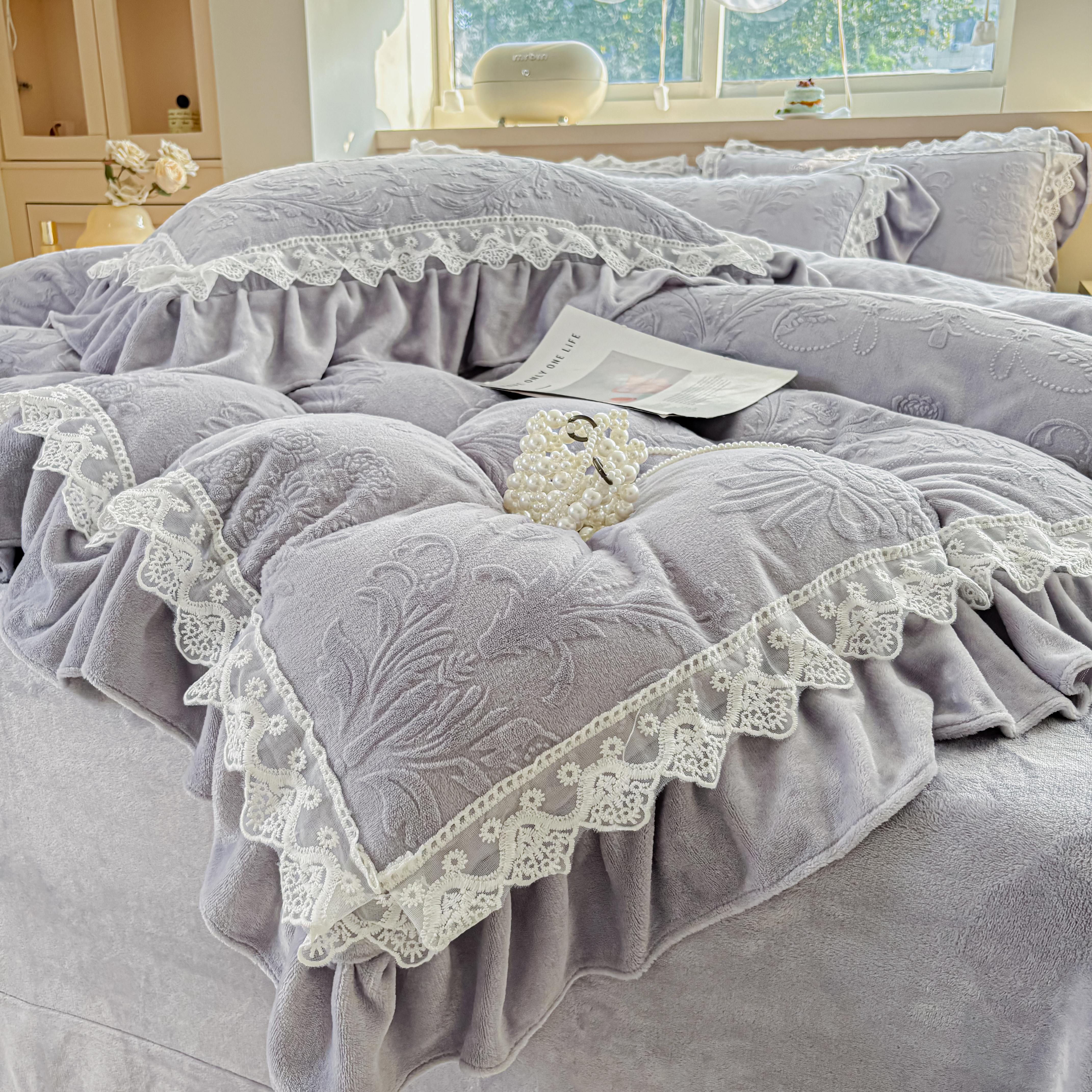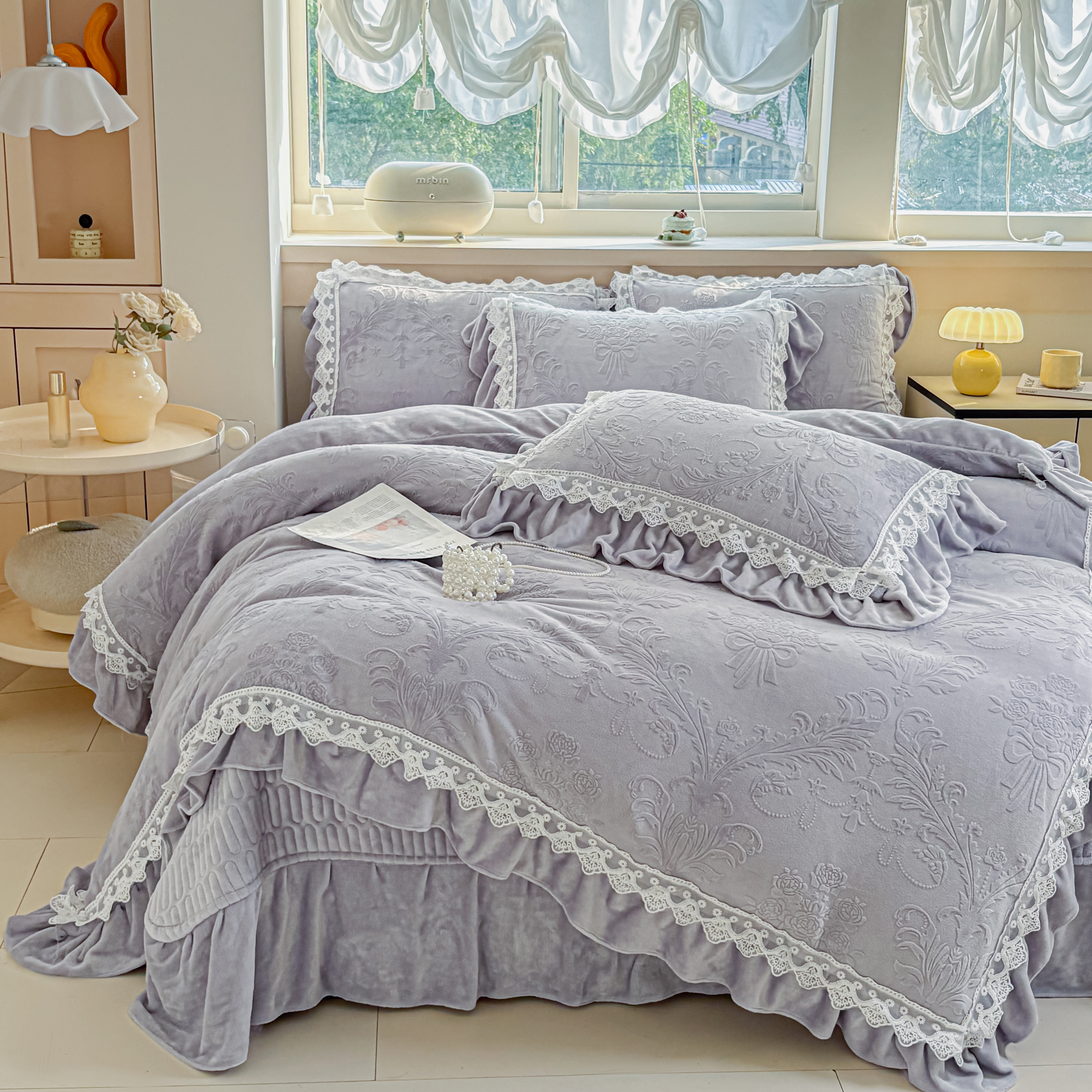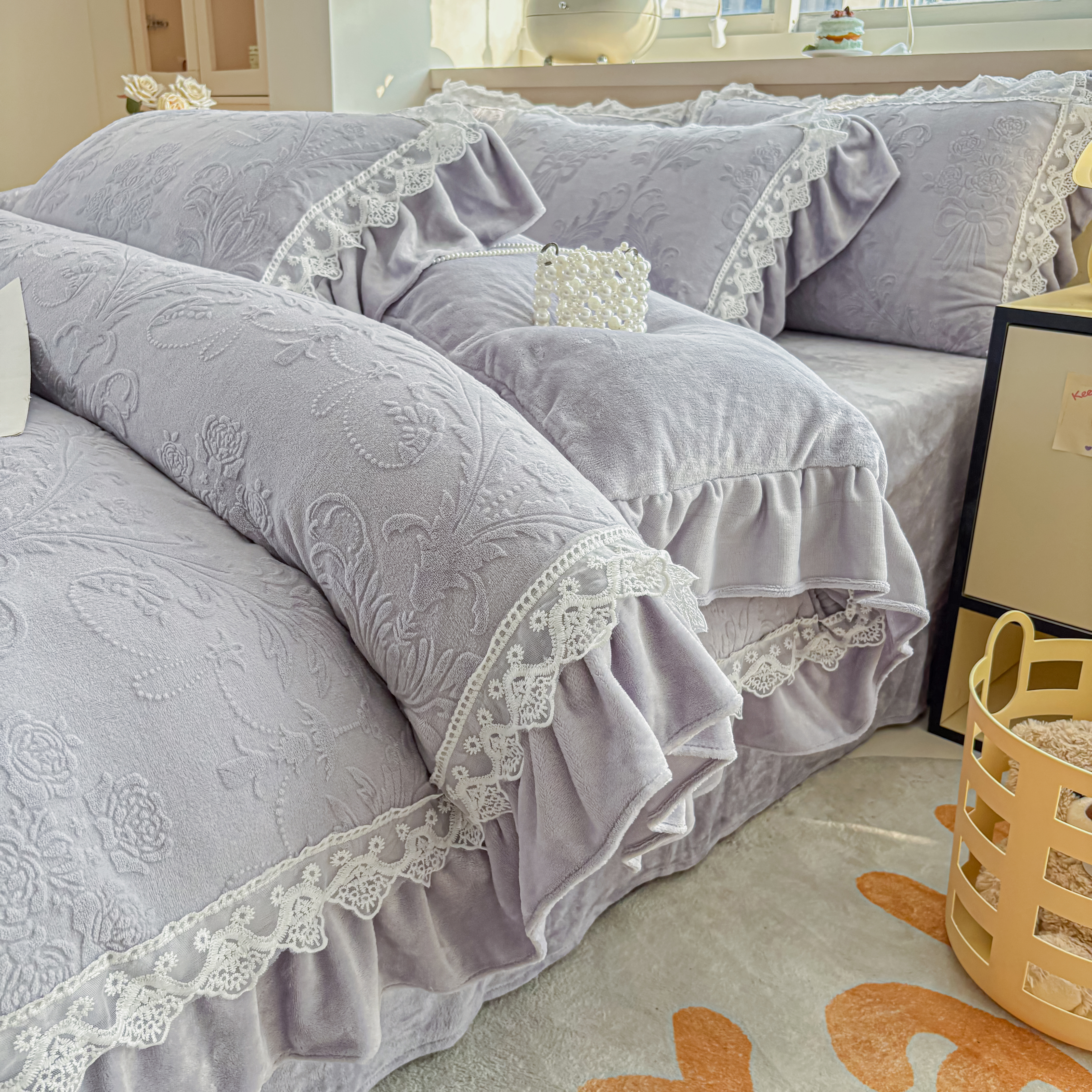 (总)锦格家纺 2025新款A类高克重雕花牛奶绒花边四件套,梦幻-玉粉,初薇-豆沙,初薇-绿,初薇-玉粉,幻梦-黄,幻梦-天蓝,蝶漫-奶白,蝶漫-天蓝