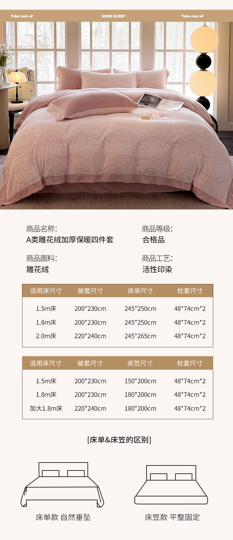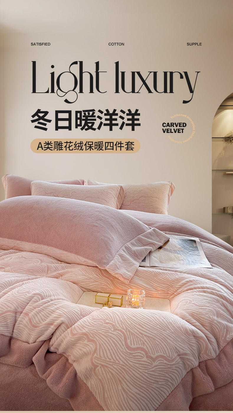商品名称: 秋冬季A类加厚保暖牛奶绒四件套刺绣雕花宝宝绒被套床单床笠床上用品 嘉梦纳-静谧粉