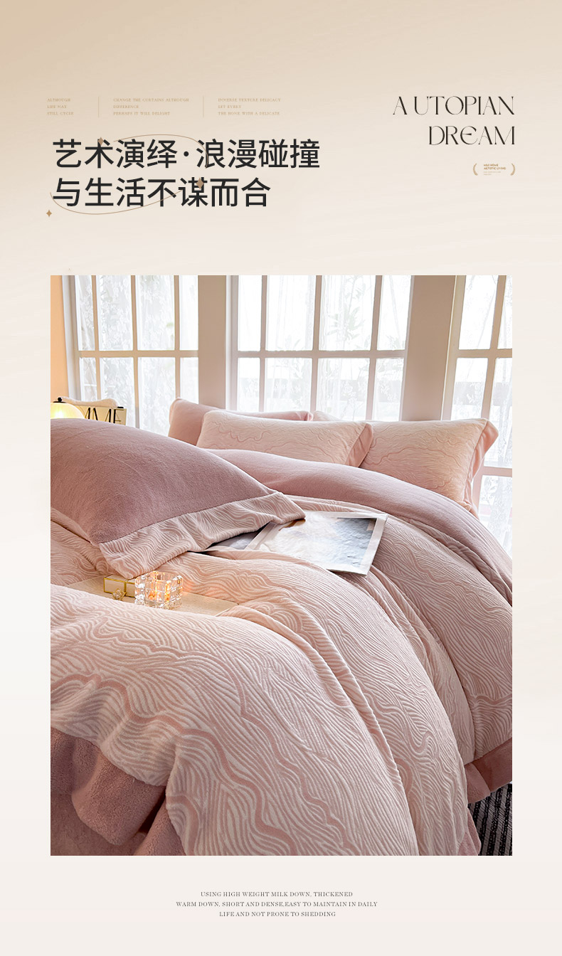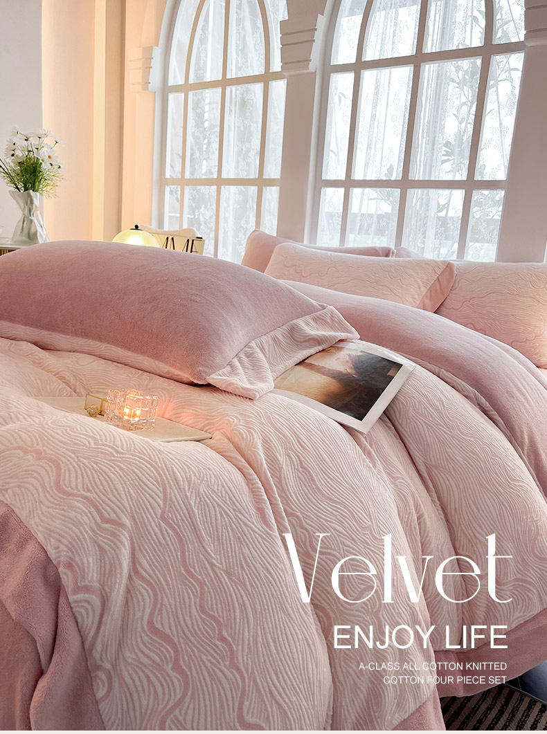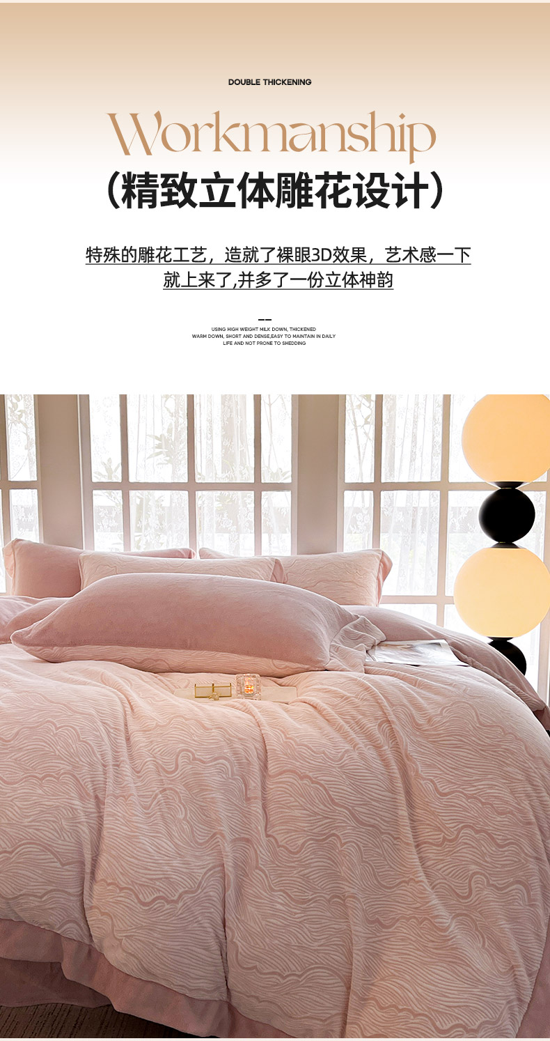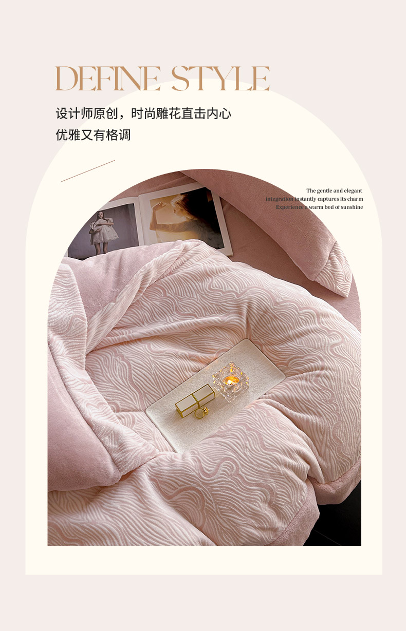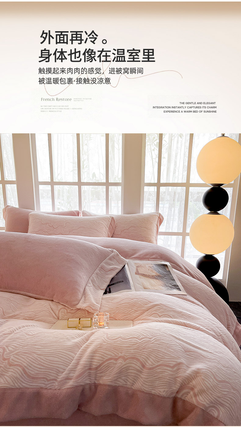 秋冬季A类加厚保暖牛奶绒四件套刺绣雕花宝宝绒被套床单床笠床上用品 嘉梦纳-静谧粉