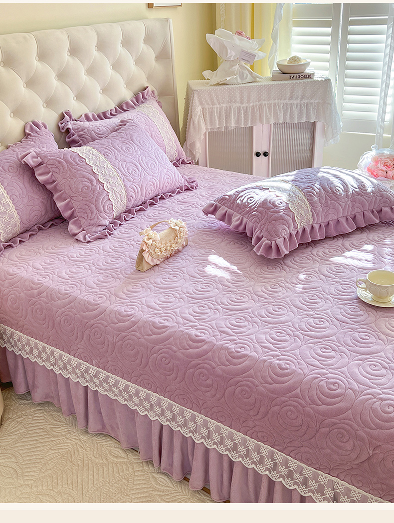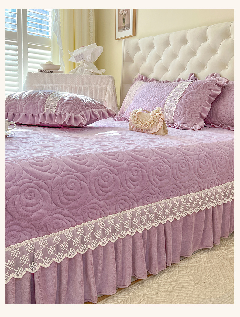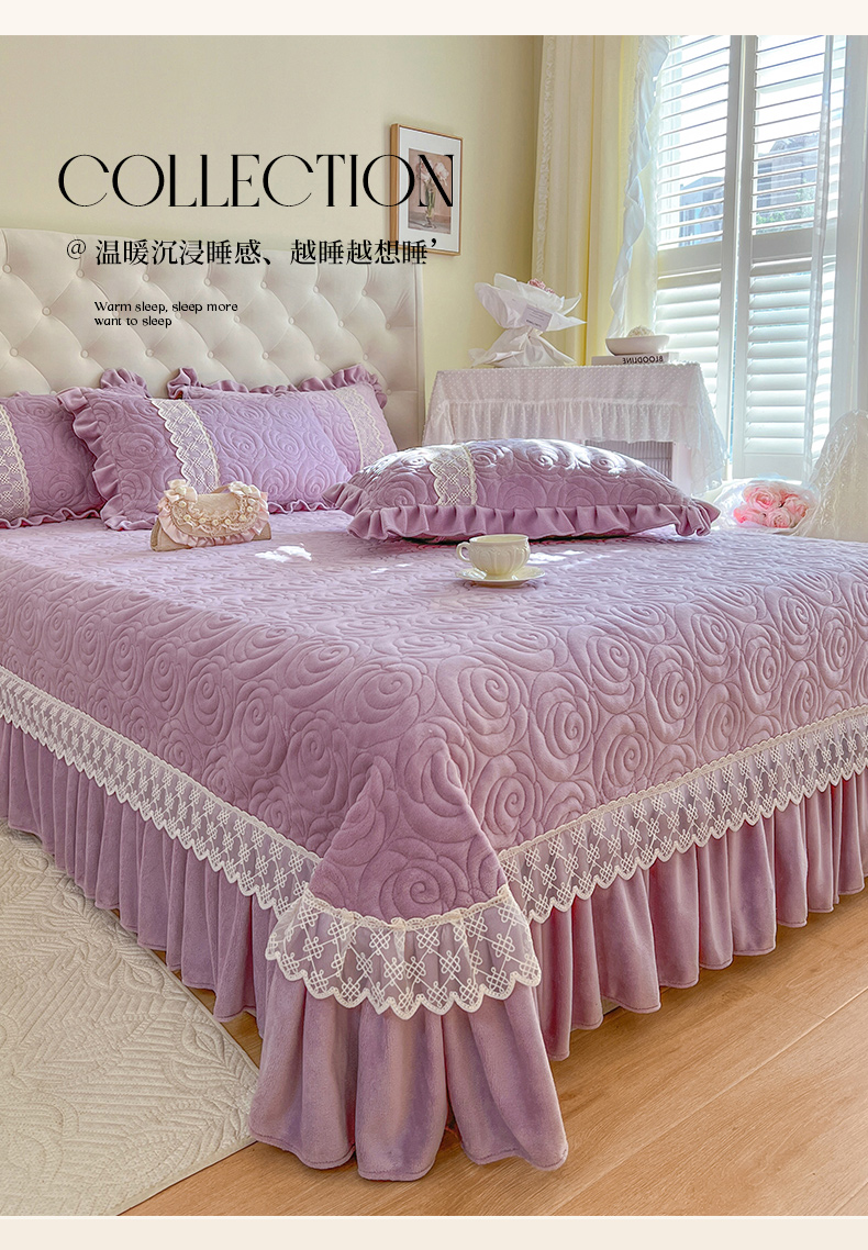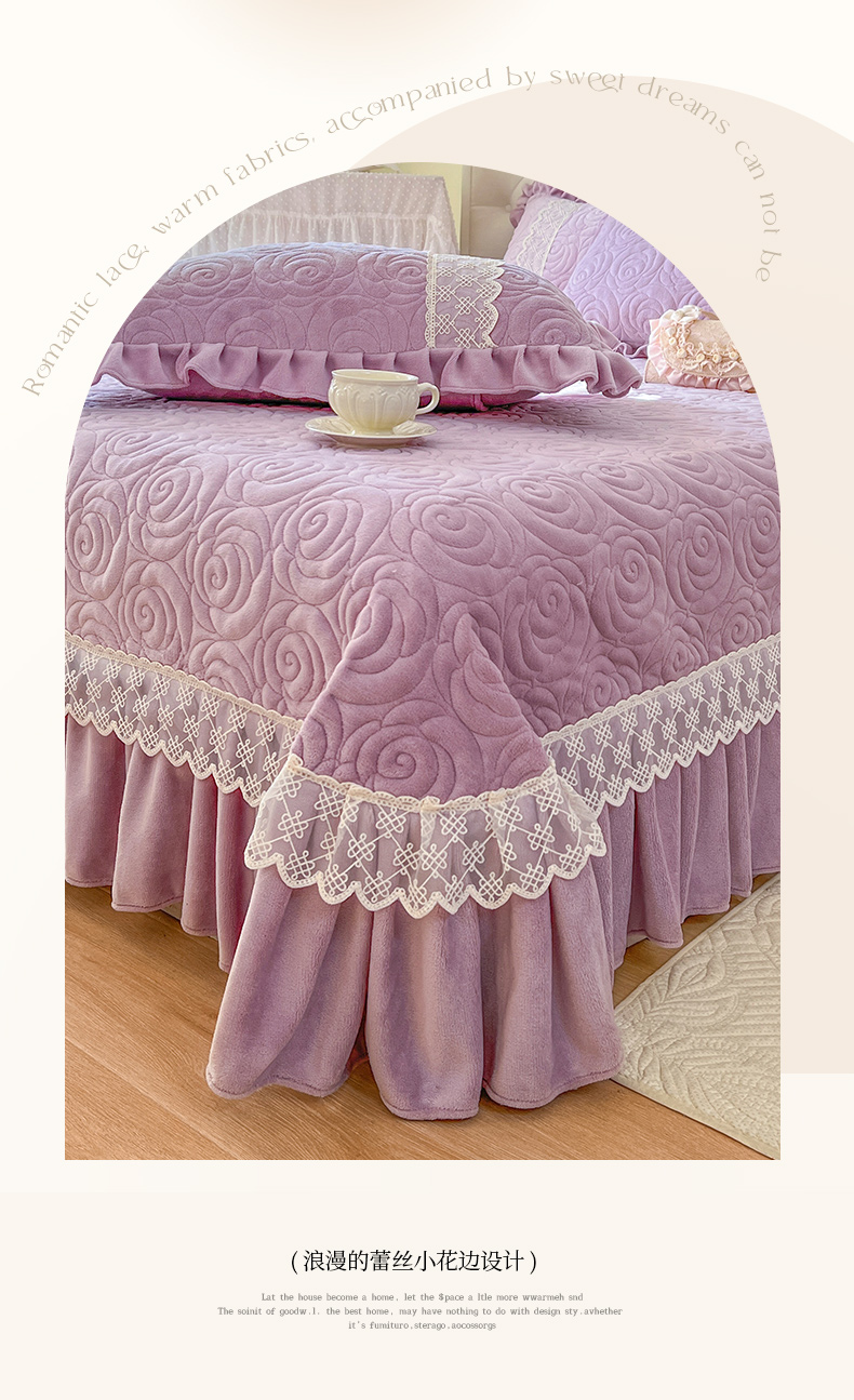 商品名称:恋尚 2024新款高克重牛奶绒夹棉蕾丝花边单床盖--朵拉 朵拉-香芋紫