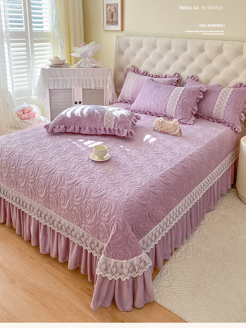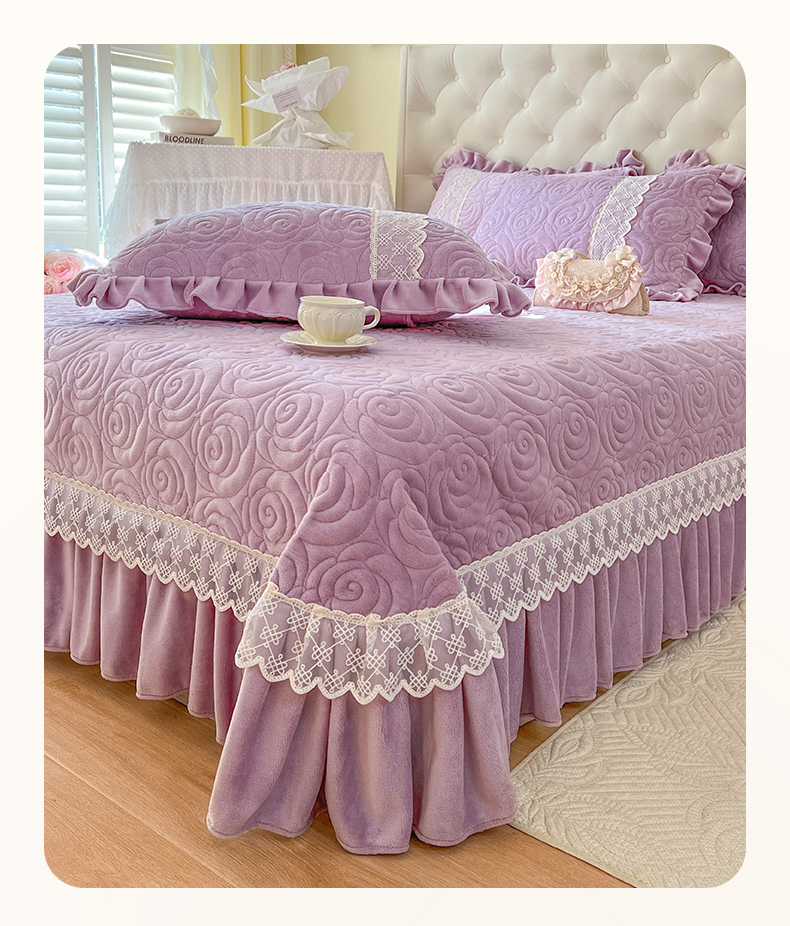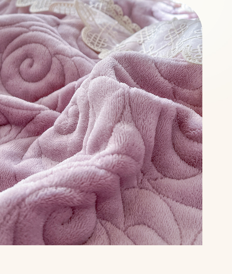 恋尚 2024新款高克重牛奶绒夹棉蕾丝花边单床盖--朵拉 朵拉-香芋紫
