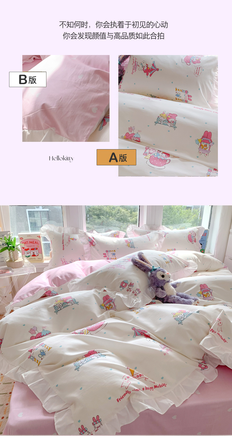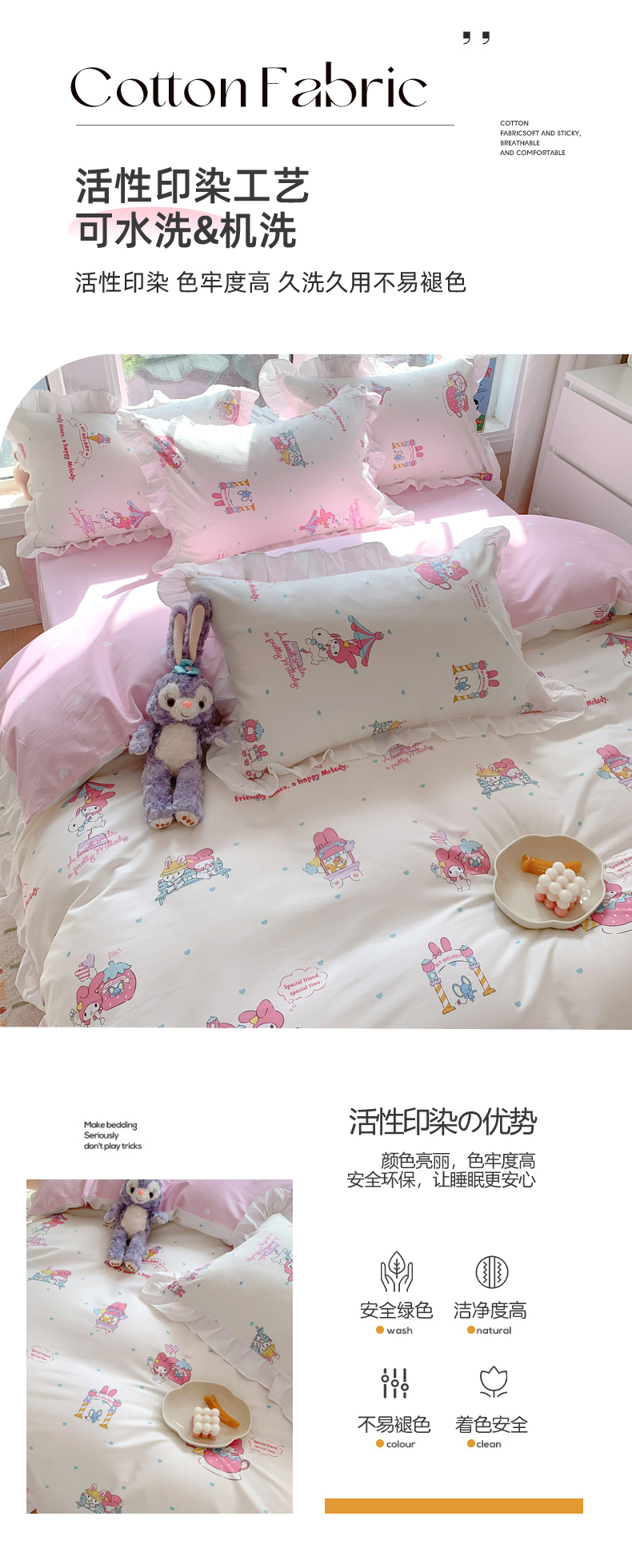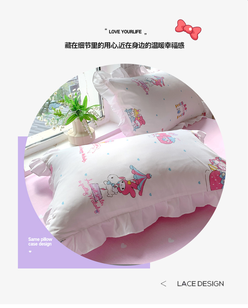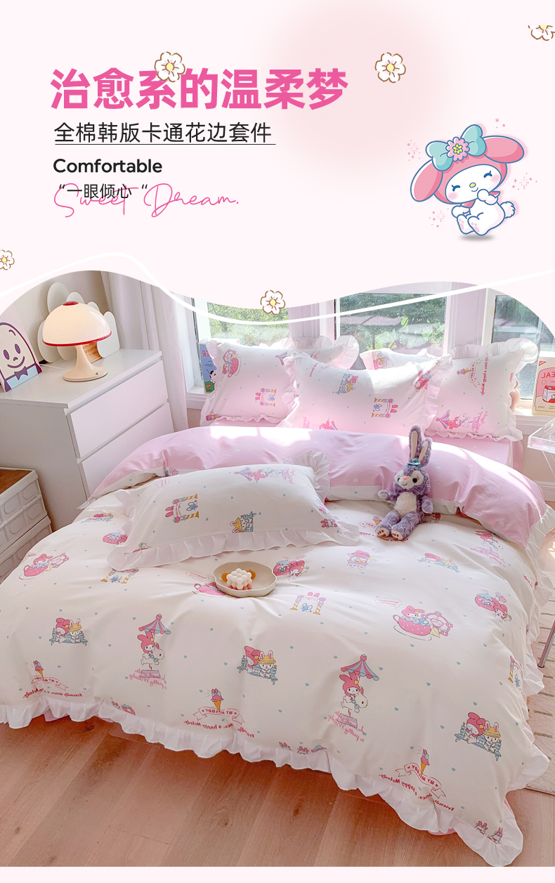 当前位置: 91家纺网 > 商品网购 > 床品套件 > 四件套 > 全棉普通四件套 > 玉元坊 2025新款三丽鸥系列白花边被套纯棉全棉床裙三件套四件套-美乐蒂白花边款式 开心美乐蒂【花边款】
