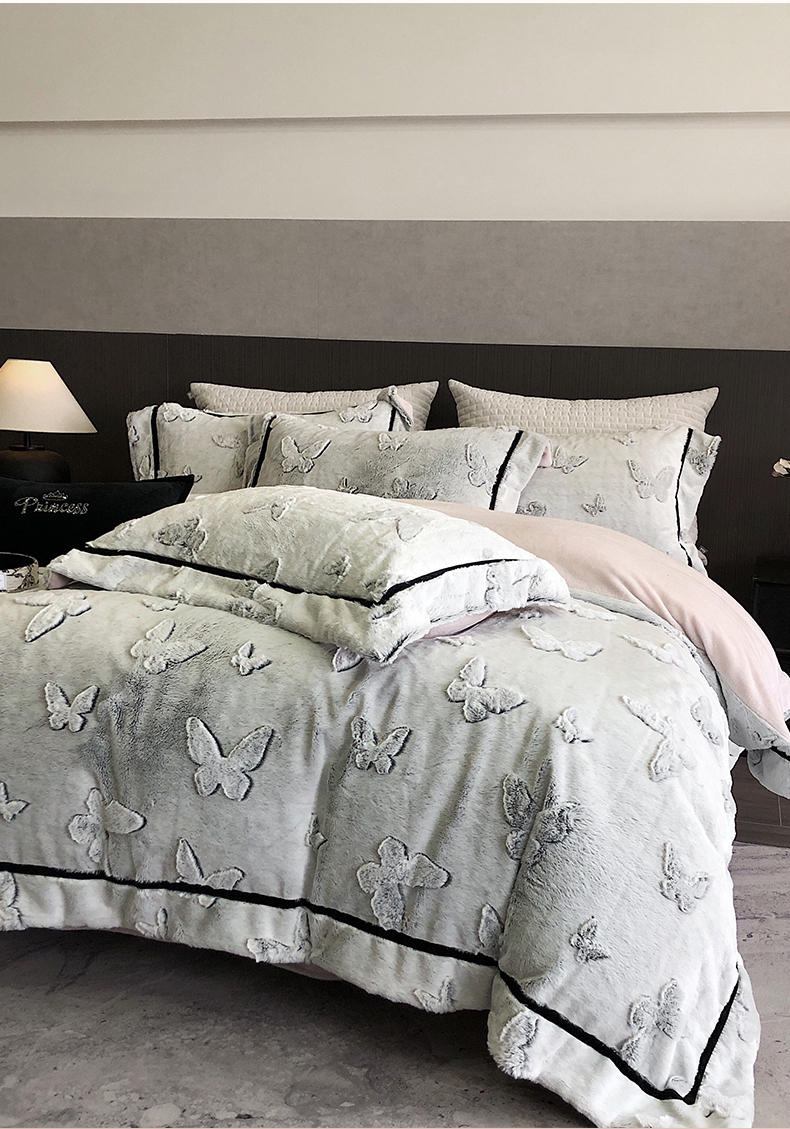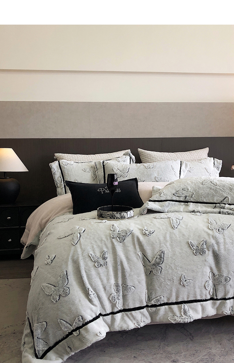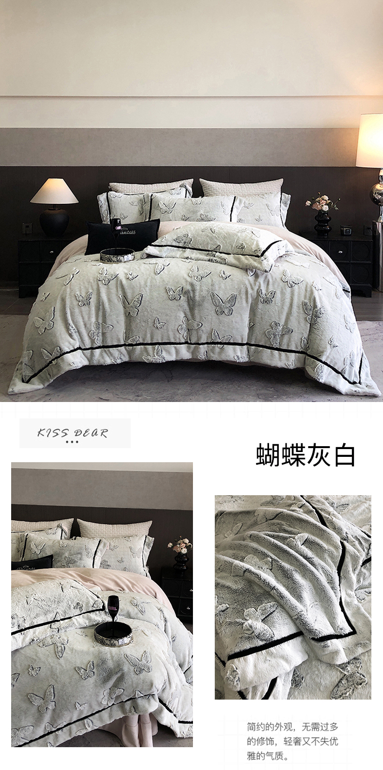 商品名称:罗优家纺 2025新款兔兔绒牛奶绒雕印蝴蝶系列四件套(控价369) 蝴蝶灰白