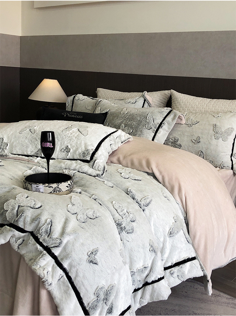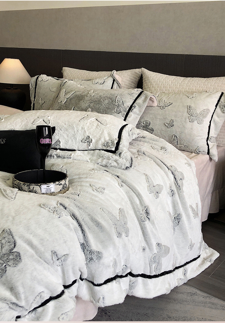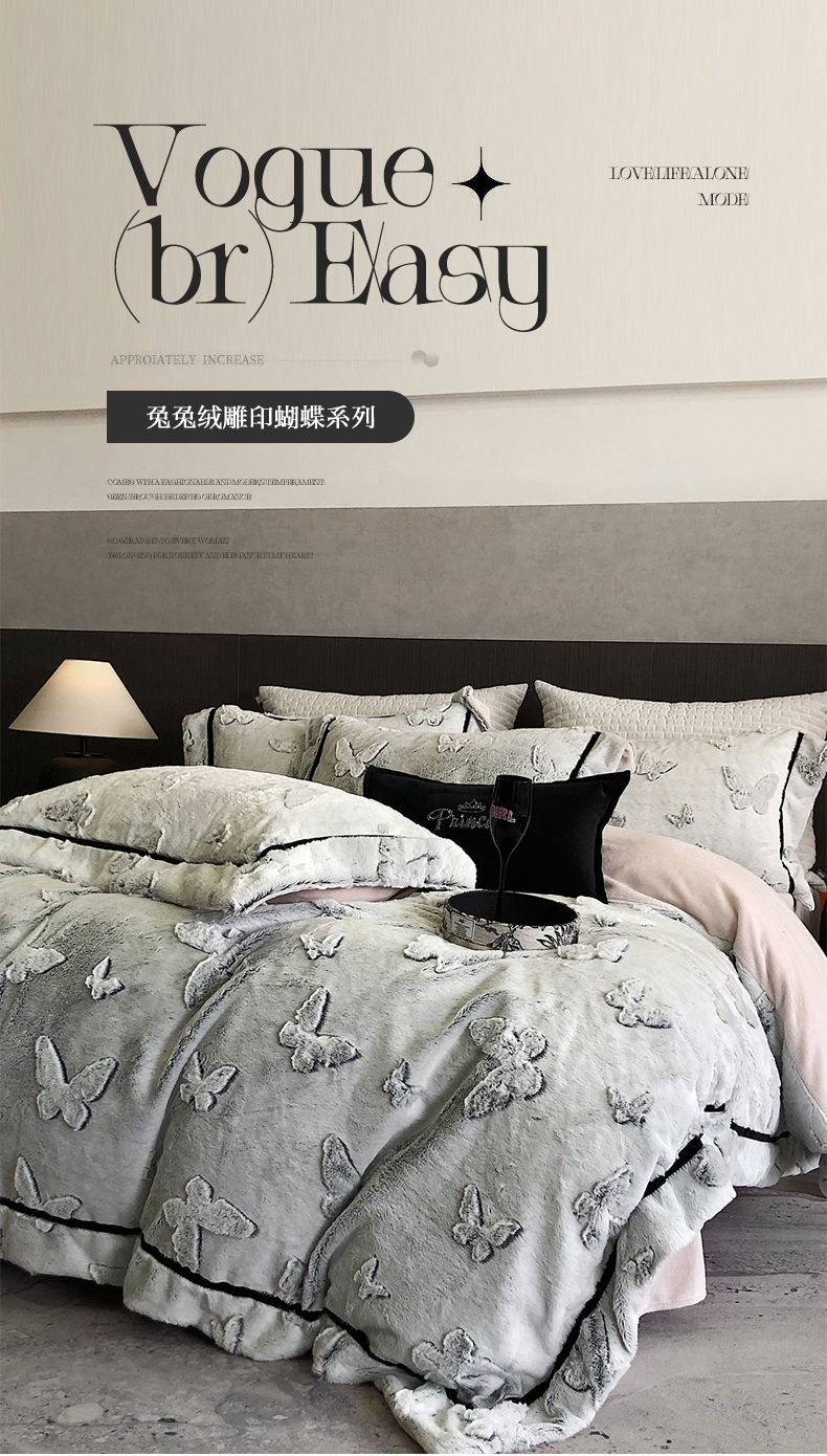罗优家纺 2025新款兔兔绒牛奶绒雕印蝴蝶系列四件套(控价369) 蝴蝶灰白