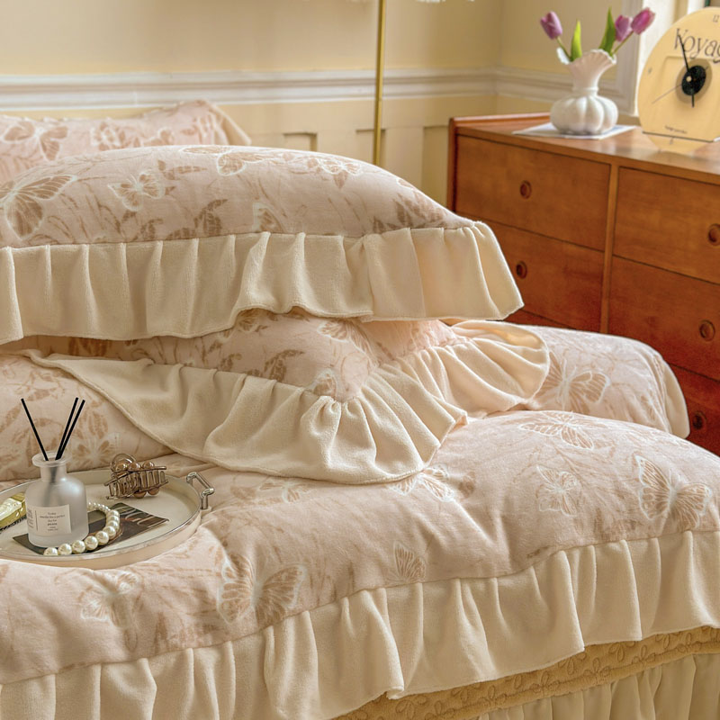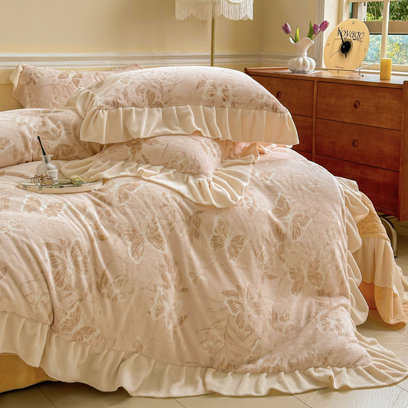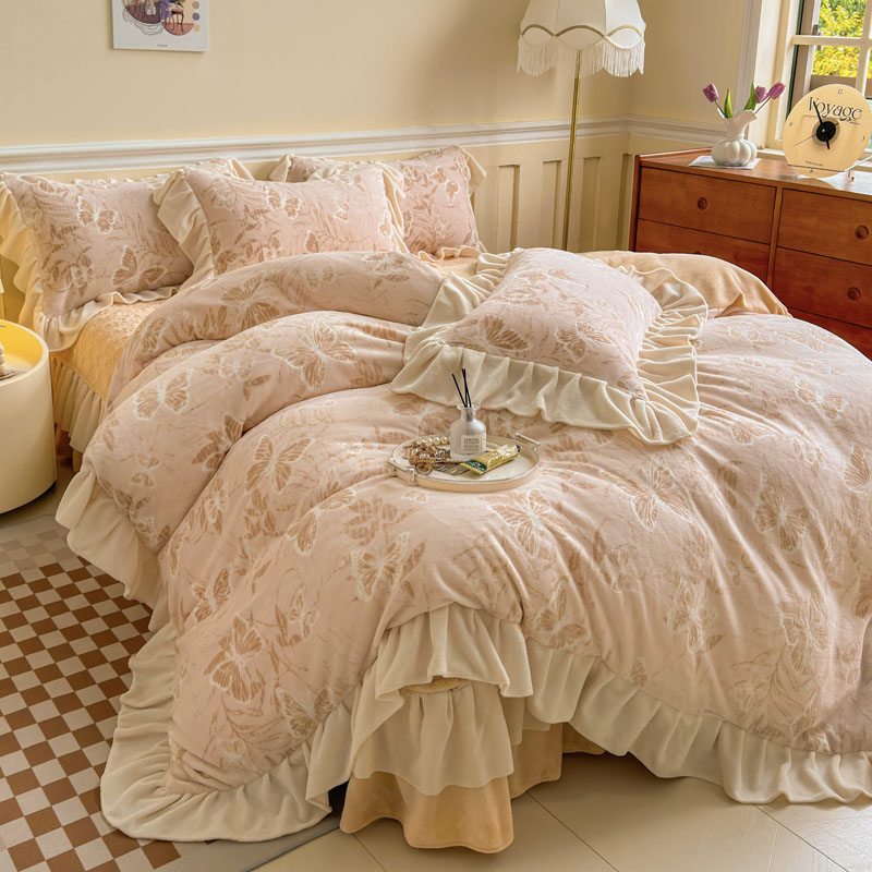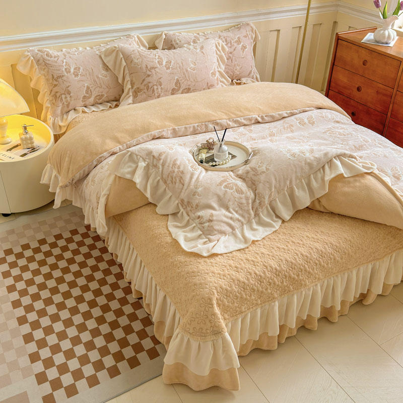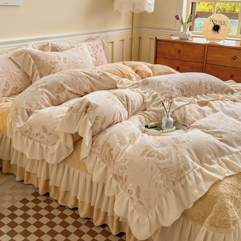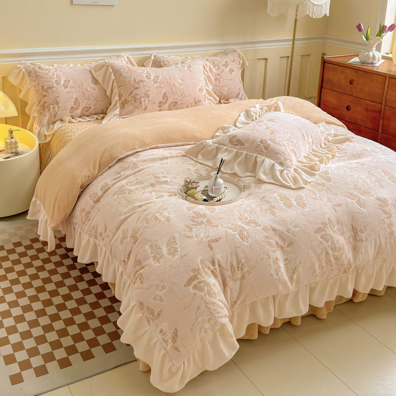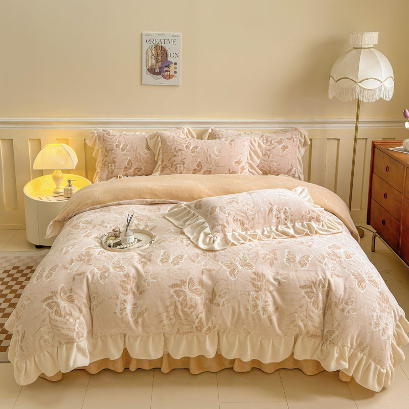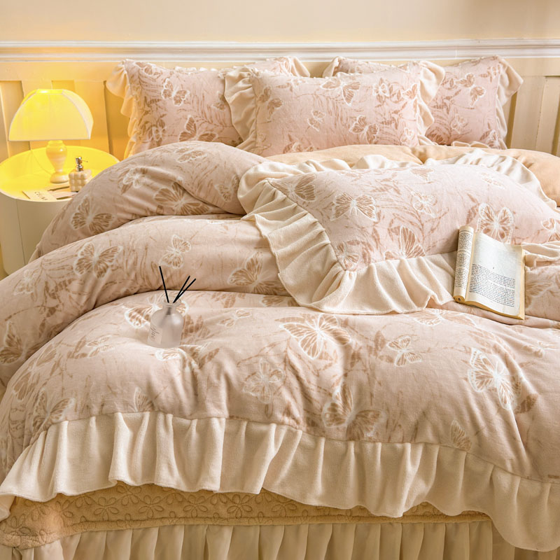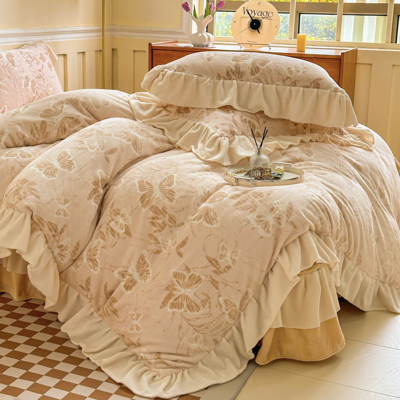 商品名称:大麦家纺 2024新款高克重牛奶绒夹棉床盖四件套 梦蝶咖