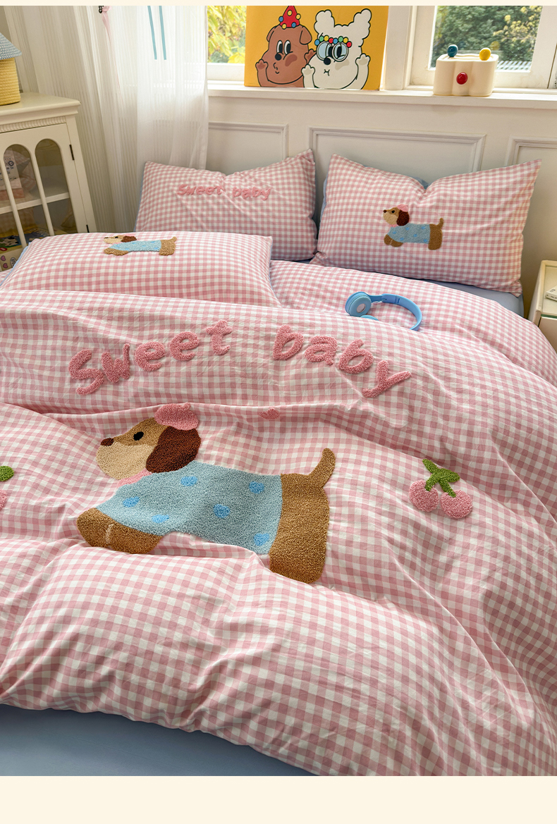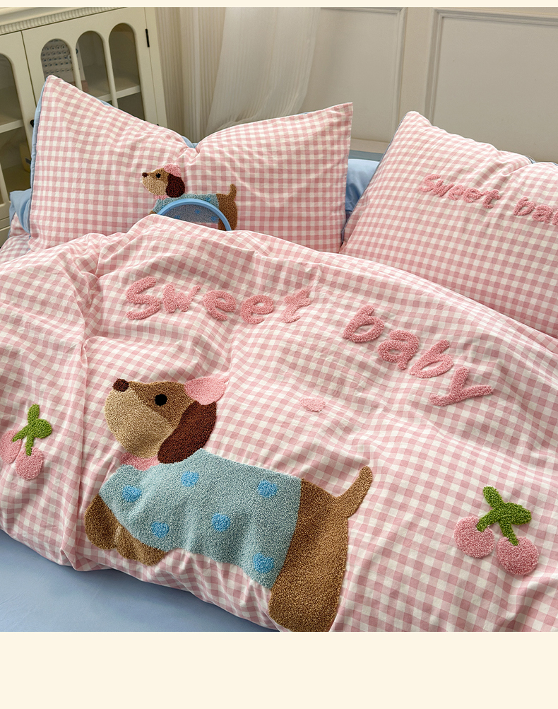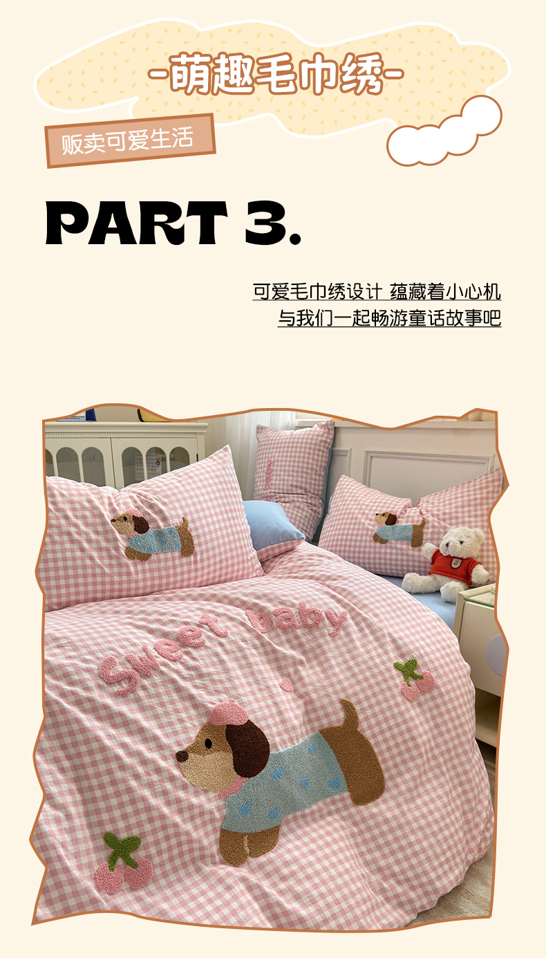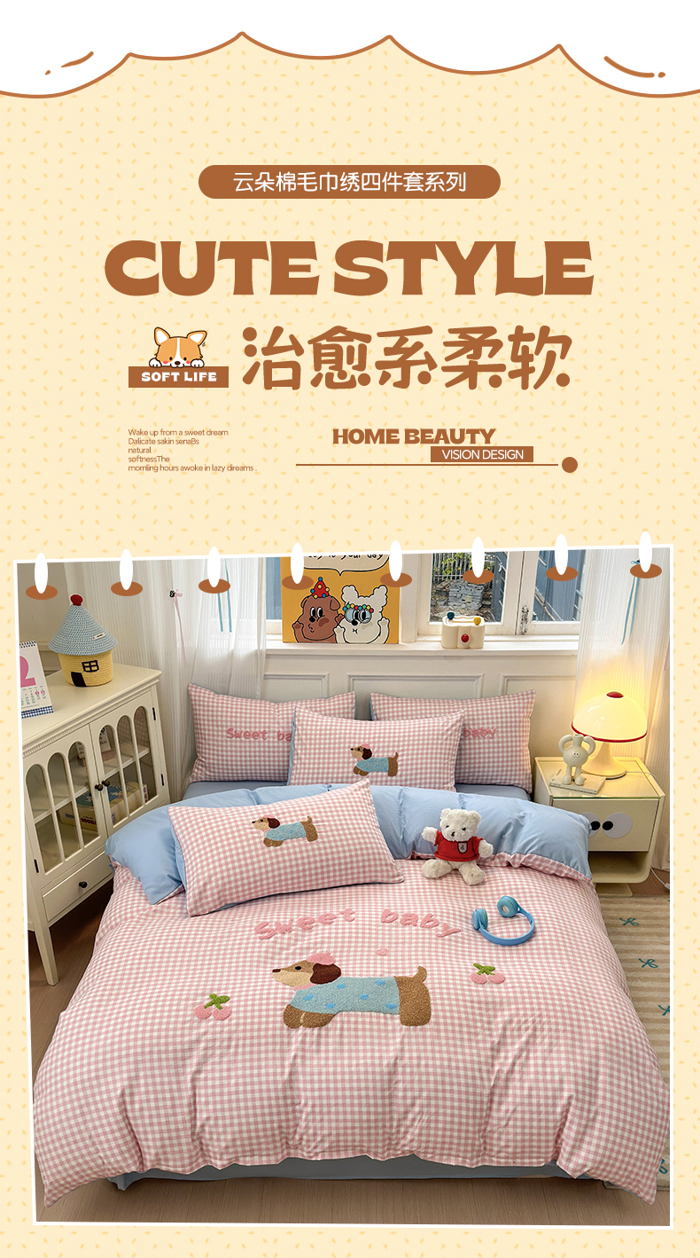 当前位置: 91家纺网 > 商品网购 > 床品套件 > 四件套 > 毛巾绣四件套 > 罗亿家纺 2025新款云朵糯糯棉(110g)腊肠狗毛巾绣四件套 樱桃小狗-粉格
