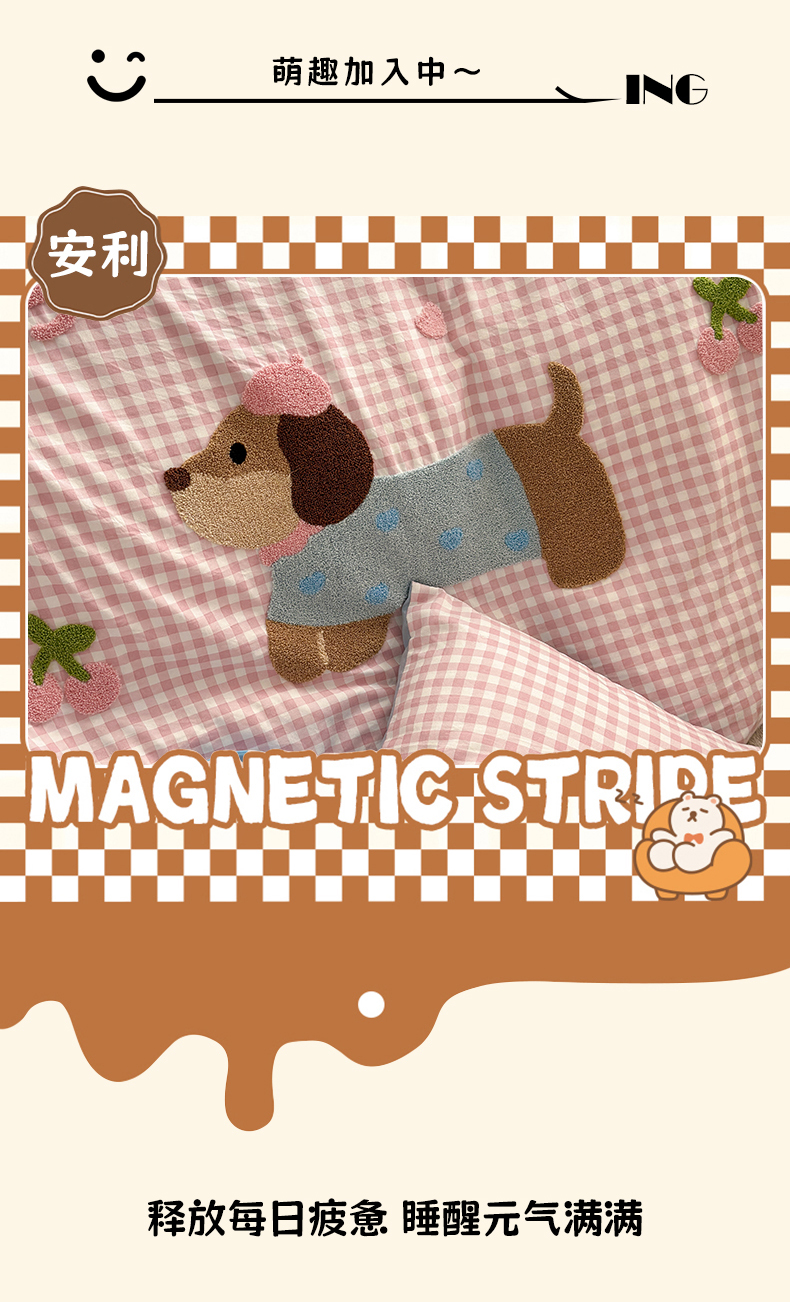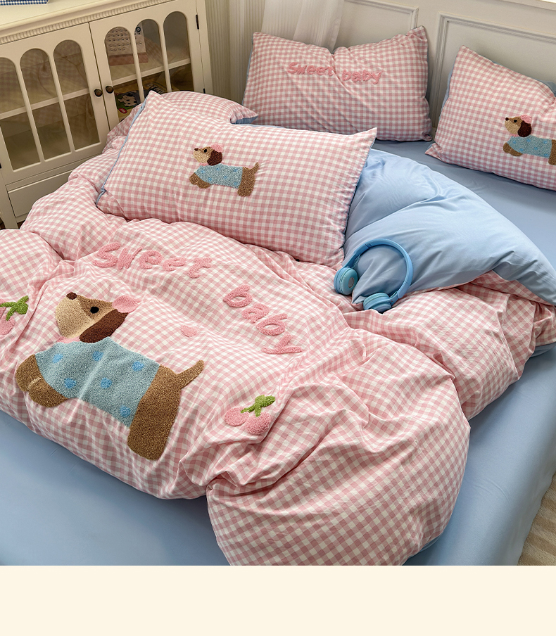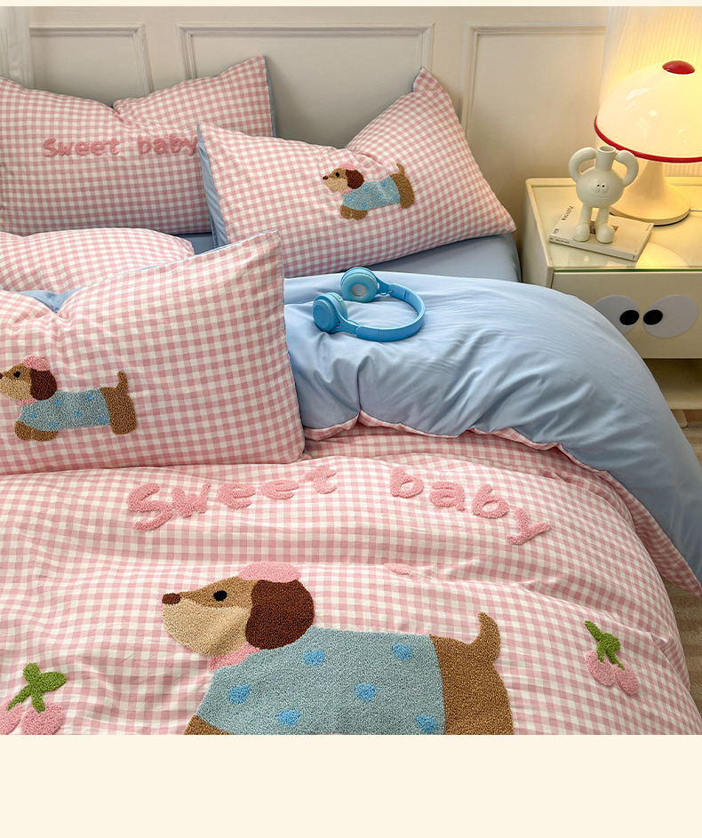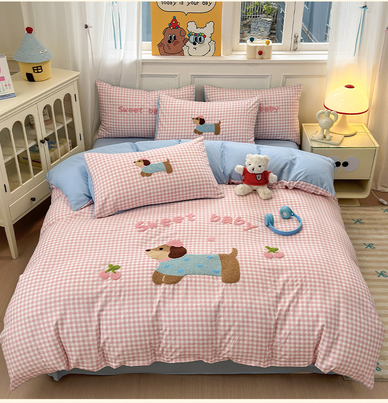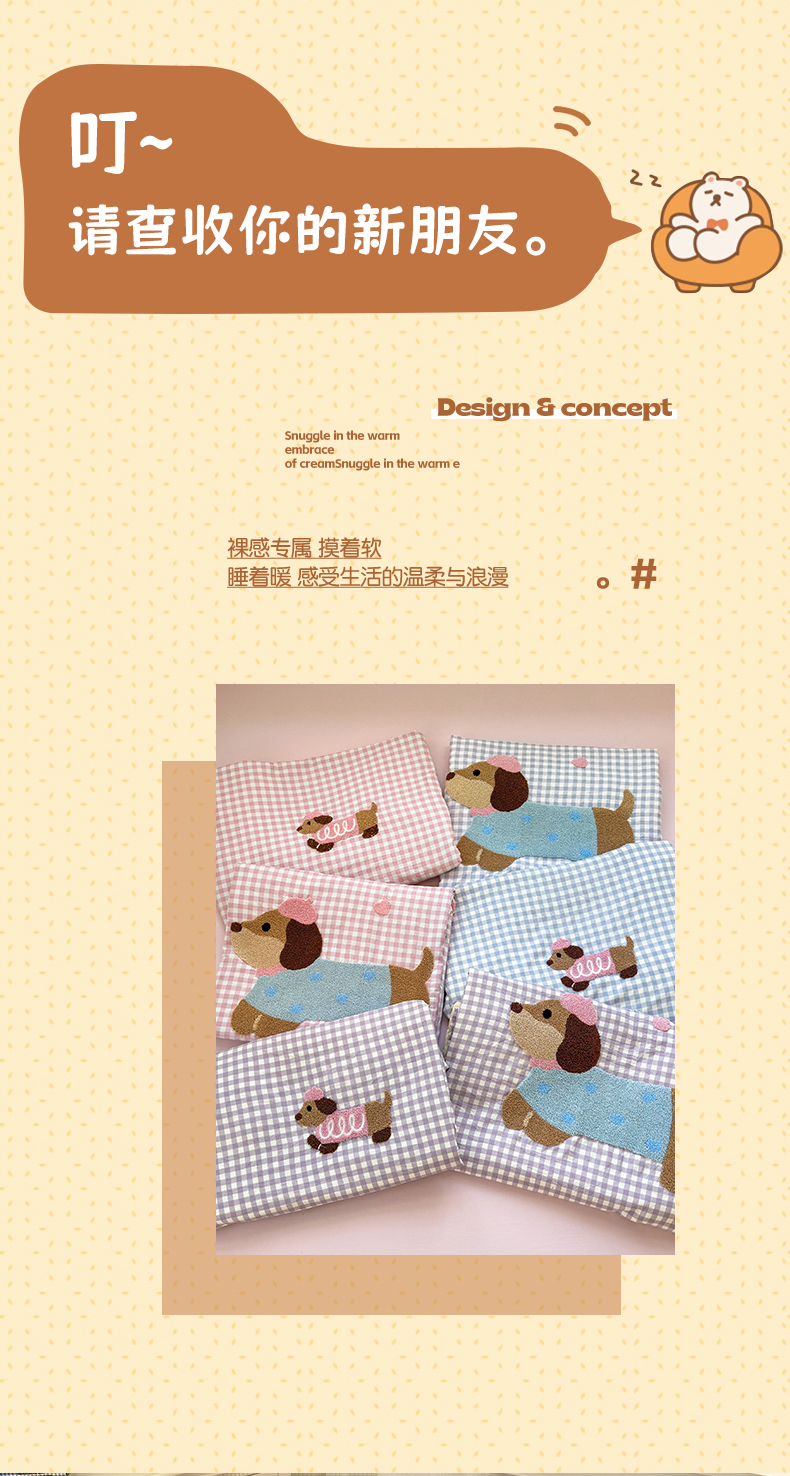 当前位置: 91家纺网 > 商品网购 > 床品套件 > 四件套 > 毛巾绣四件套 > 罗亿家纺 2025新款云朵糯糯棉(110g)腊肠狗毛巾绣四件套 樱桃小狗-粉格