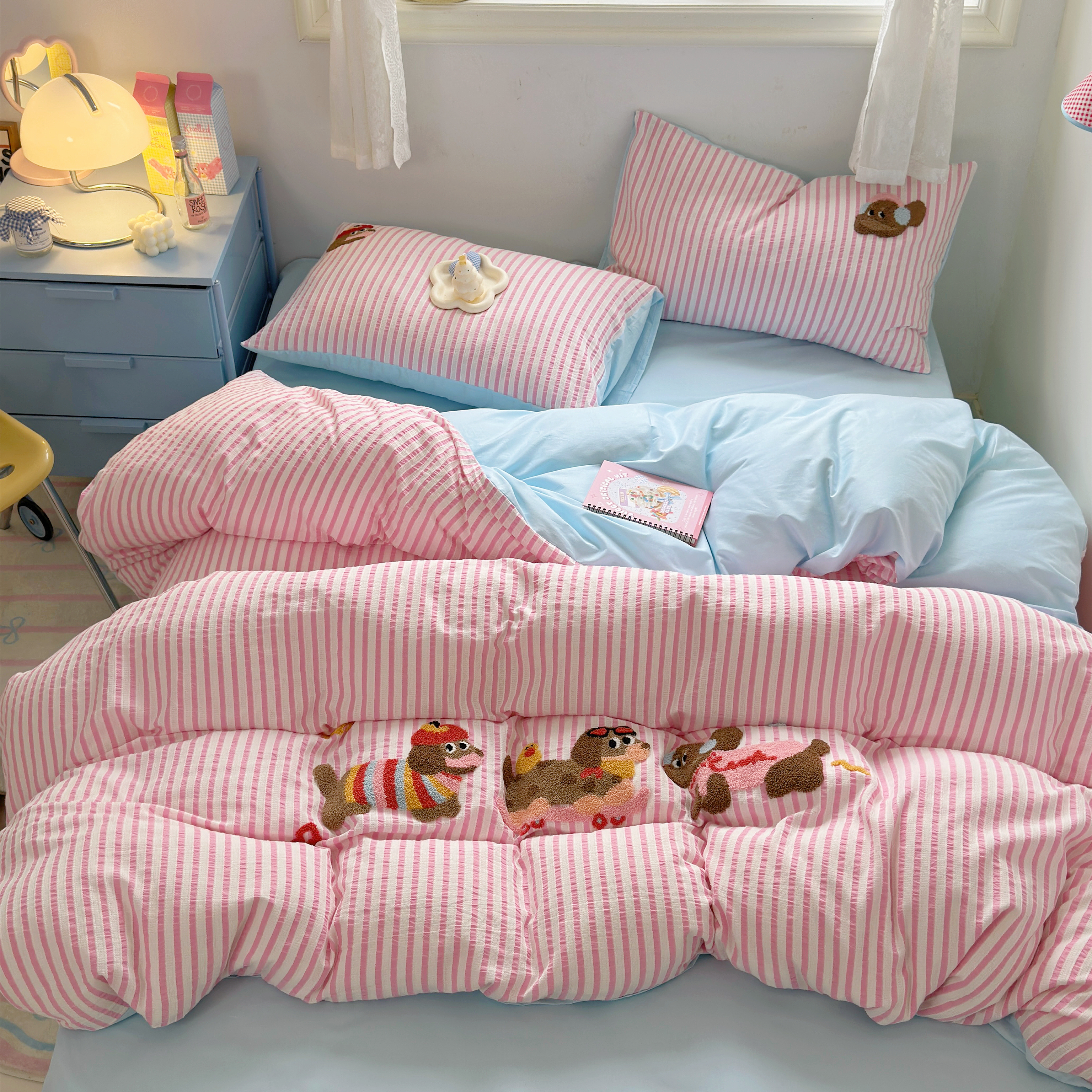 商品名称:珺柔家纺 2025新款全棉水洗棉提花毛巾绣四件套 嘻哈狗