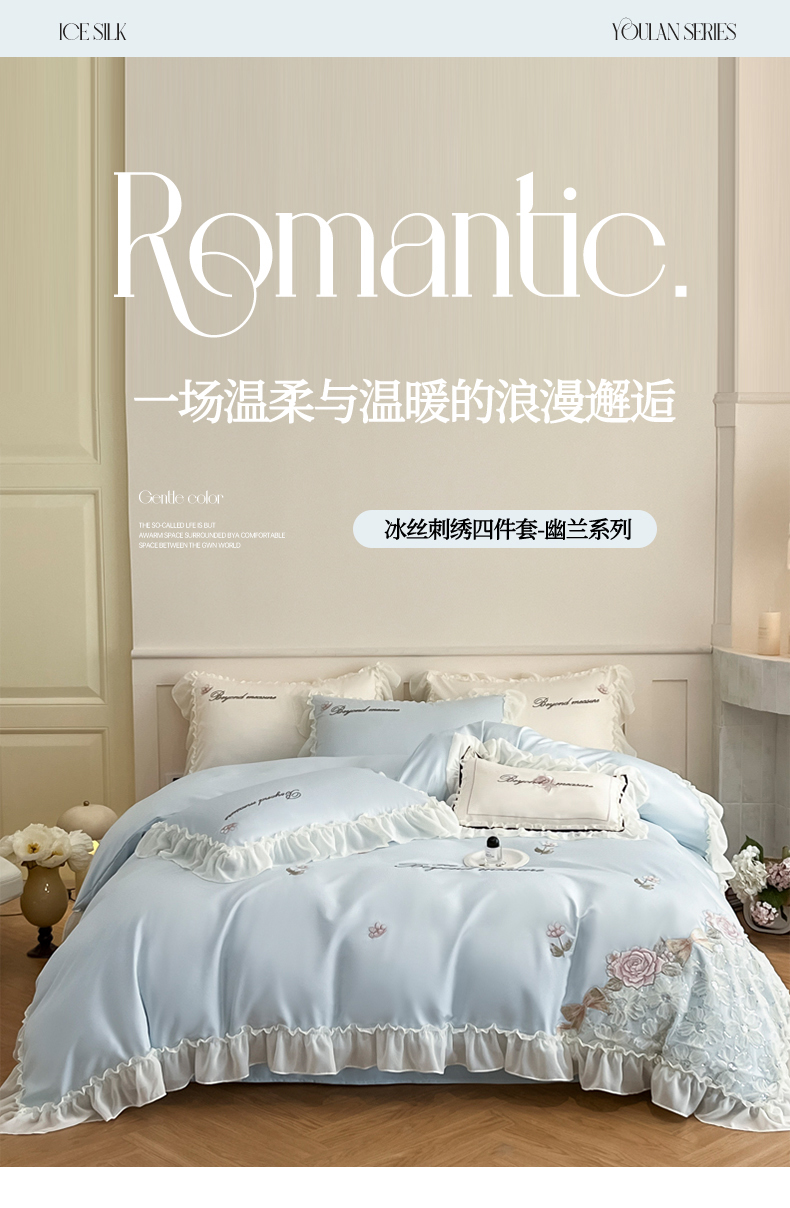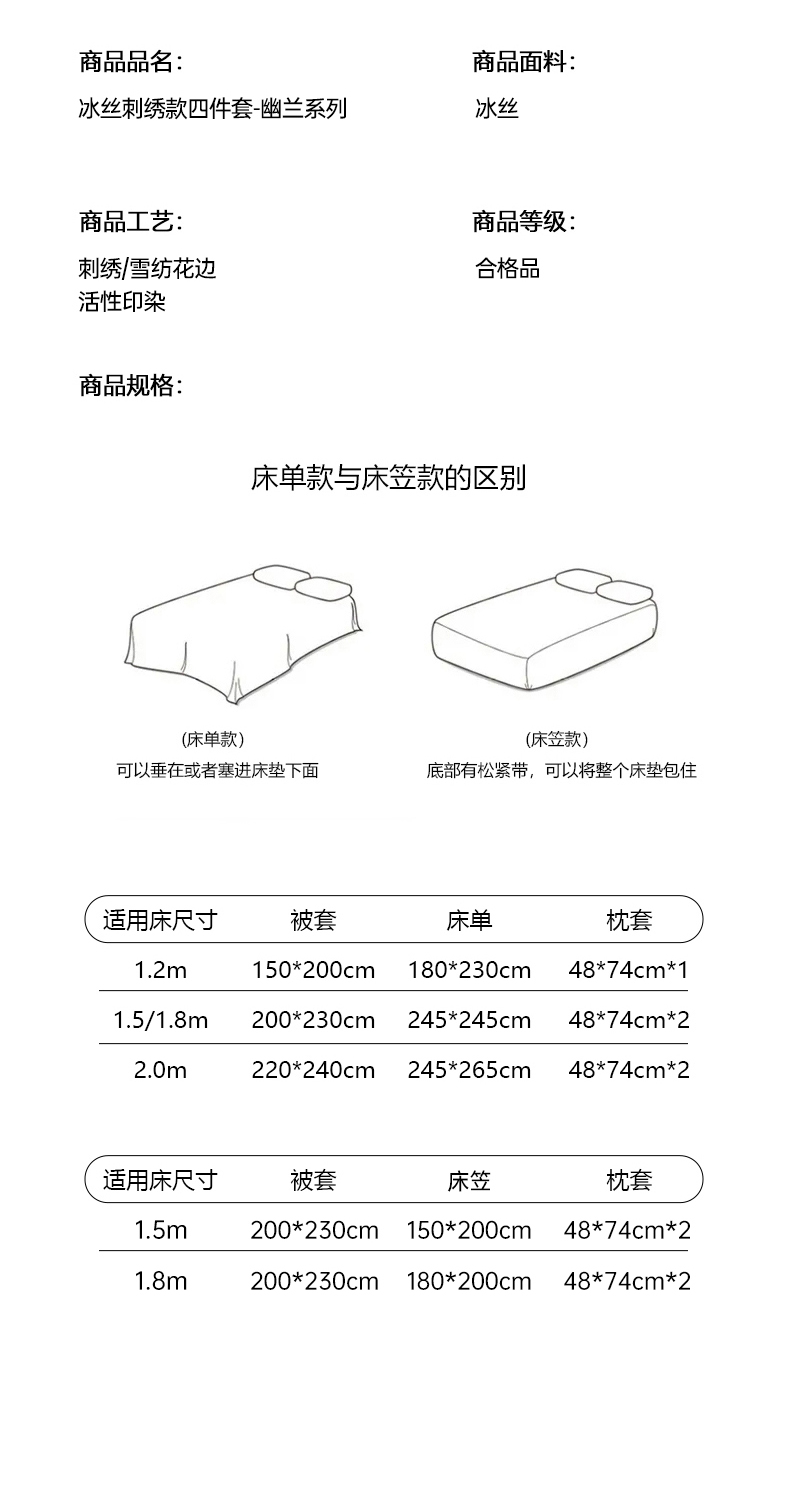 (总)七七家纺 2025新款冰丝刺绣款四件套幽兰系列,幽兰白,幽兰粉,幽兰灰,幽兰蓝,幽兰紫