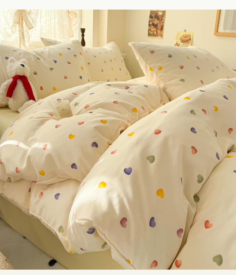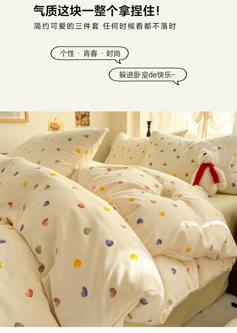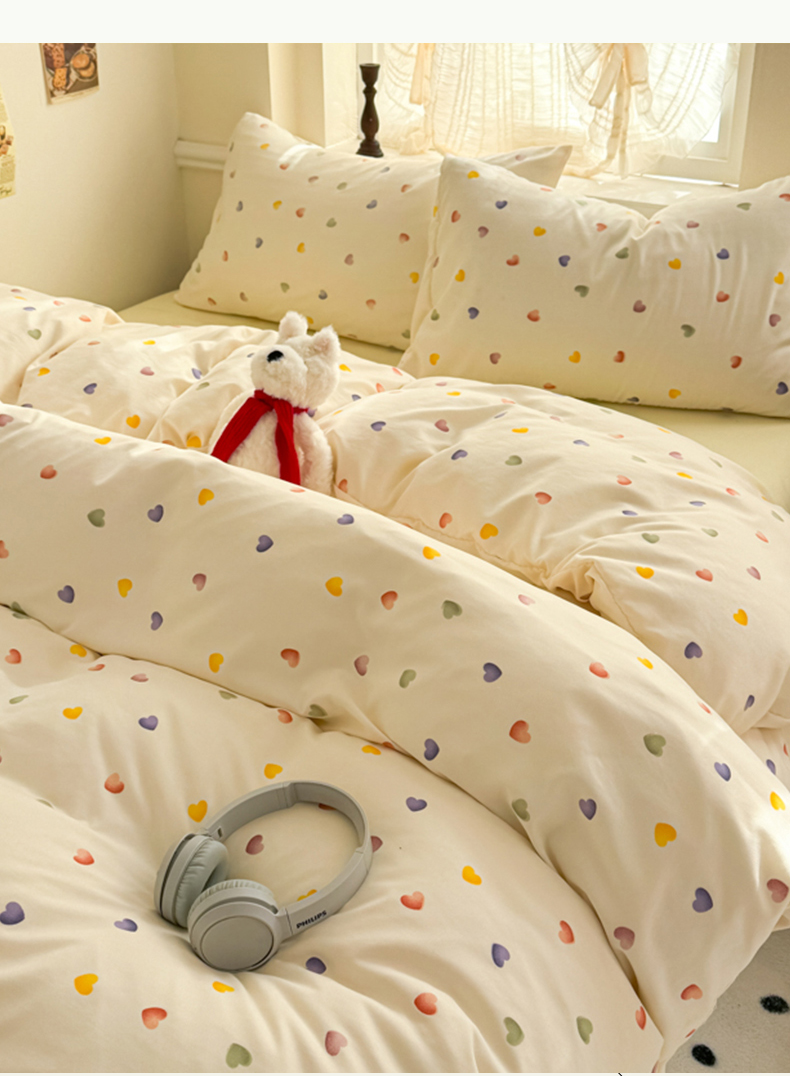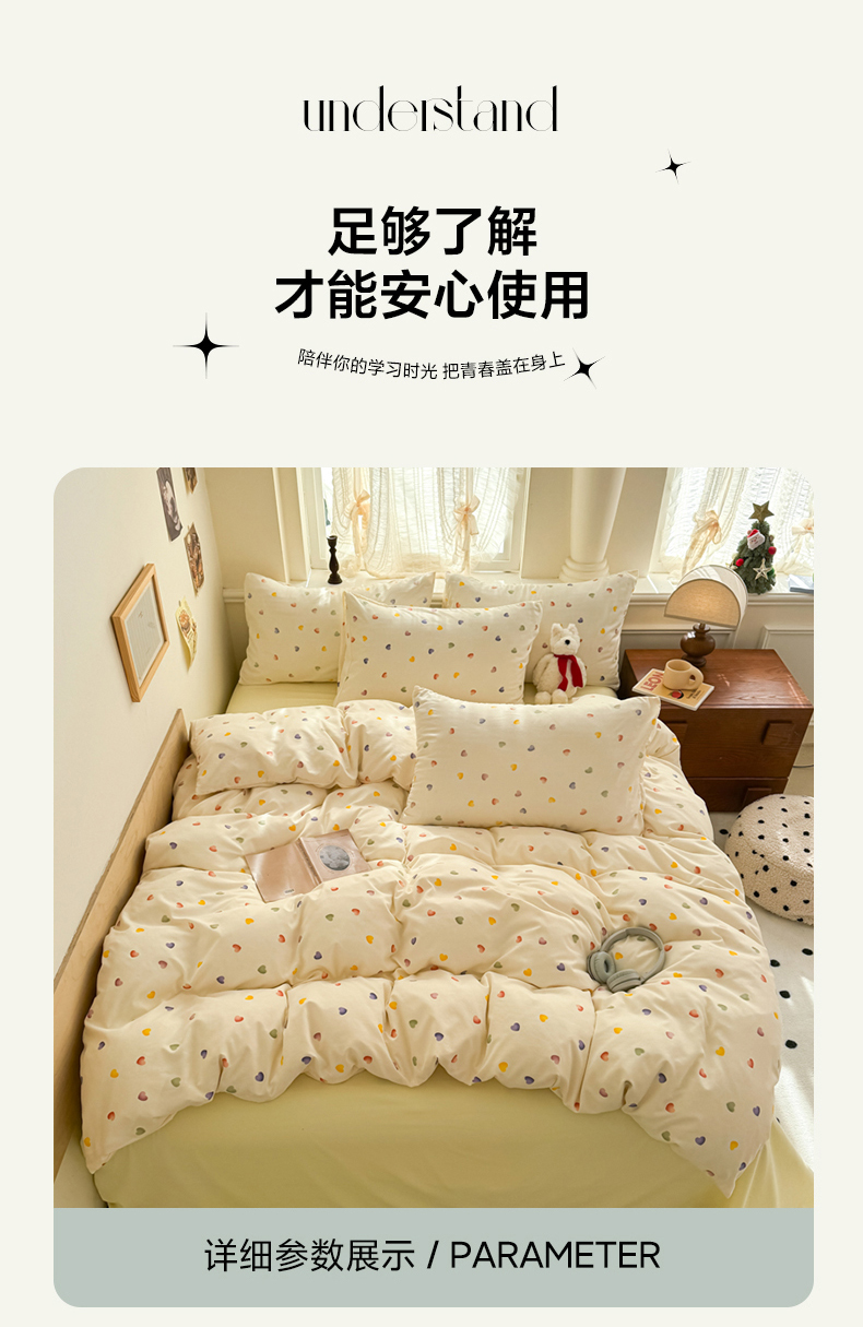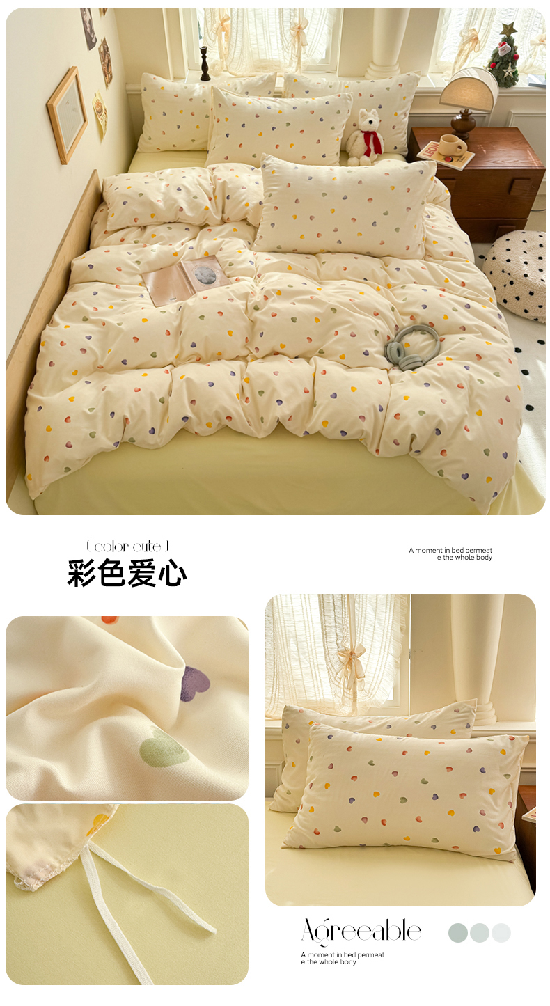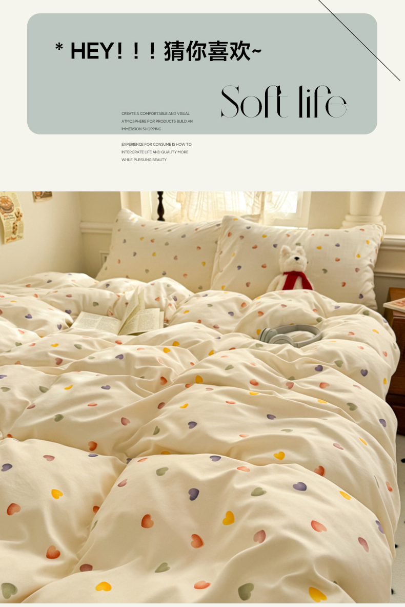 当前位置: 91家纺网 > 商品网购 > 床品套件 > 四件套 > 化纤普通四件套 > 晚爱家纺2025新款ins风卡通小清新超柔裸睡水洗棉四件套学生宿舍三件套 彩色爱心