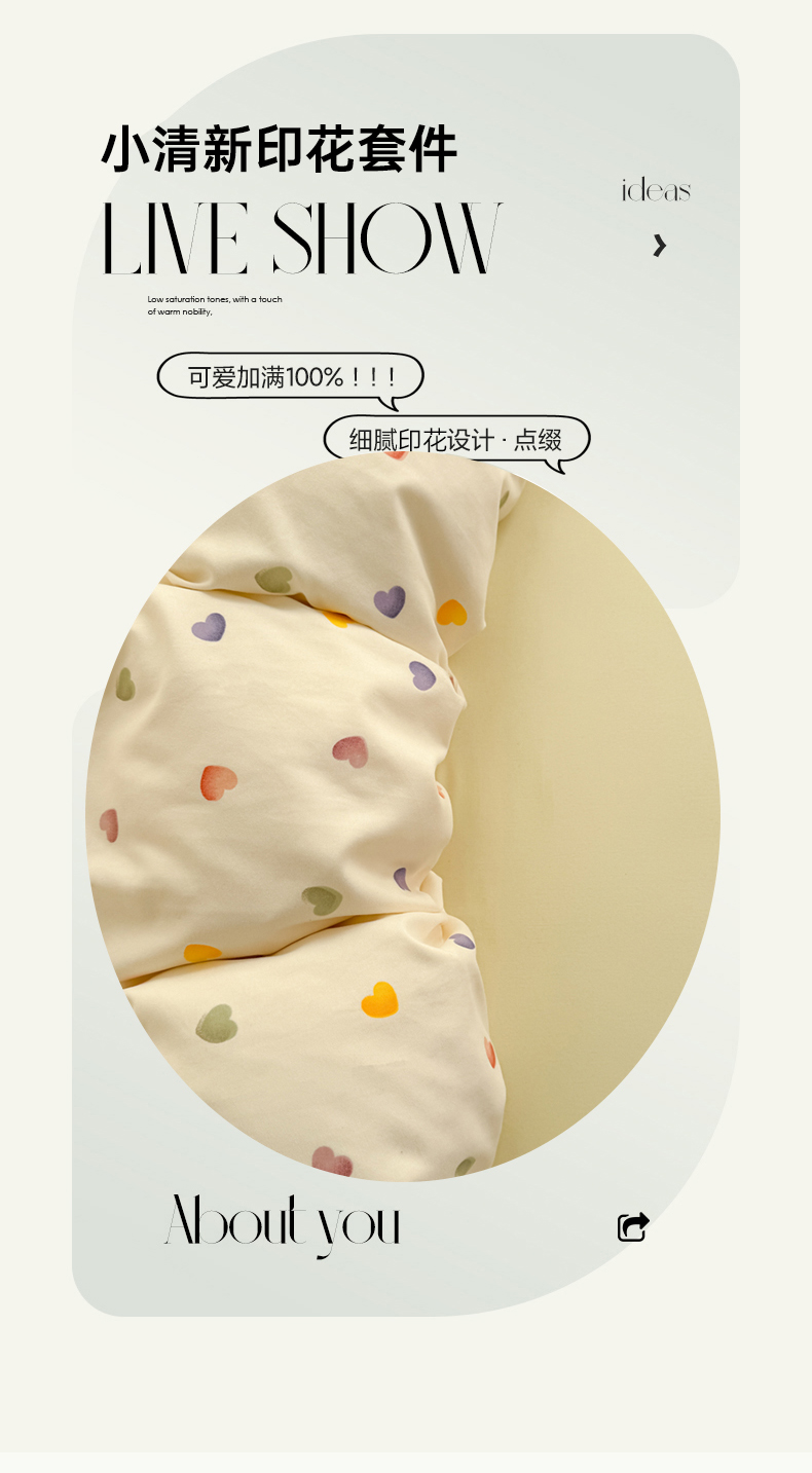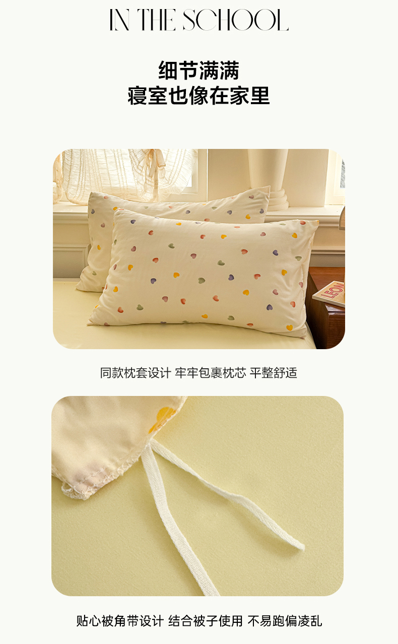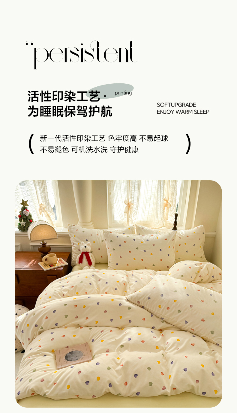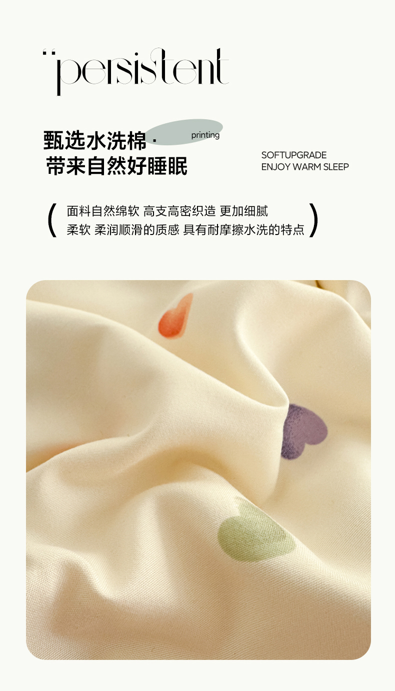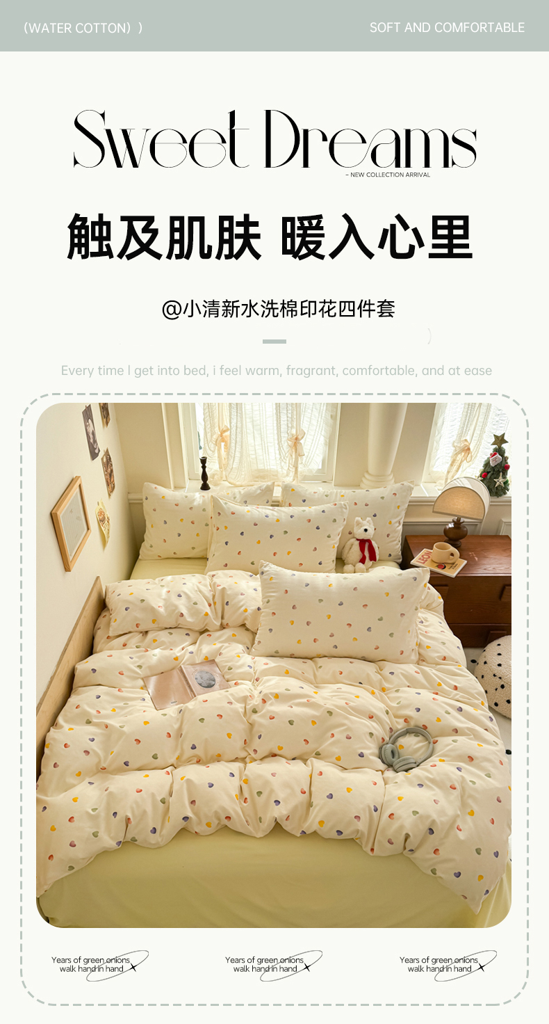 当前位置: 91家纺网 > 商品网购 > 床品套件 > 四件套 > 化纤普通四件套 > 晚爱家纺2025新款ins风卡通小清新超柔裸睡水洗棉四件套学生宿舍三件套 彩色爱心