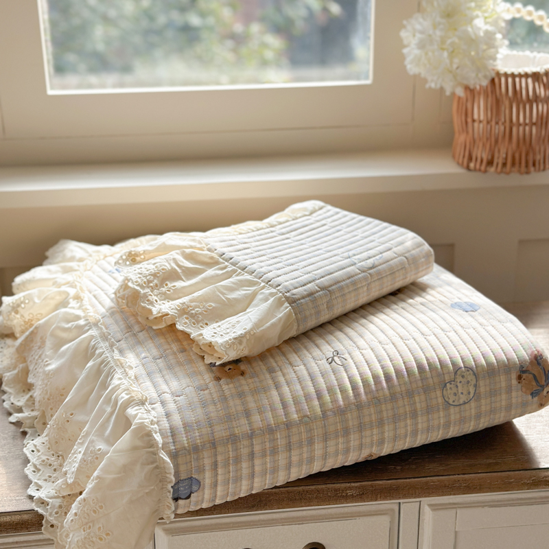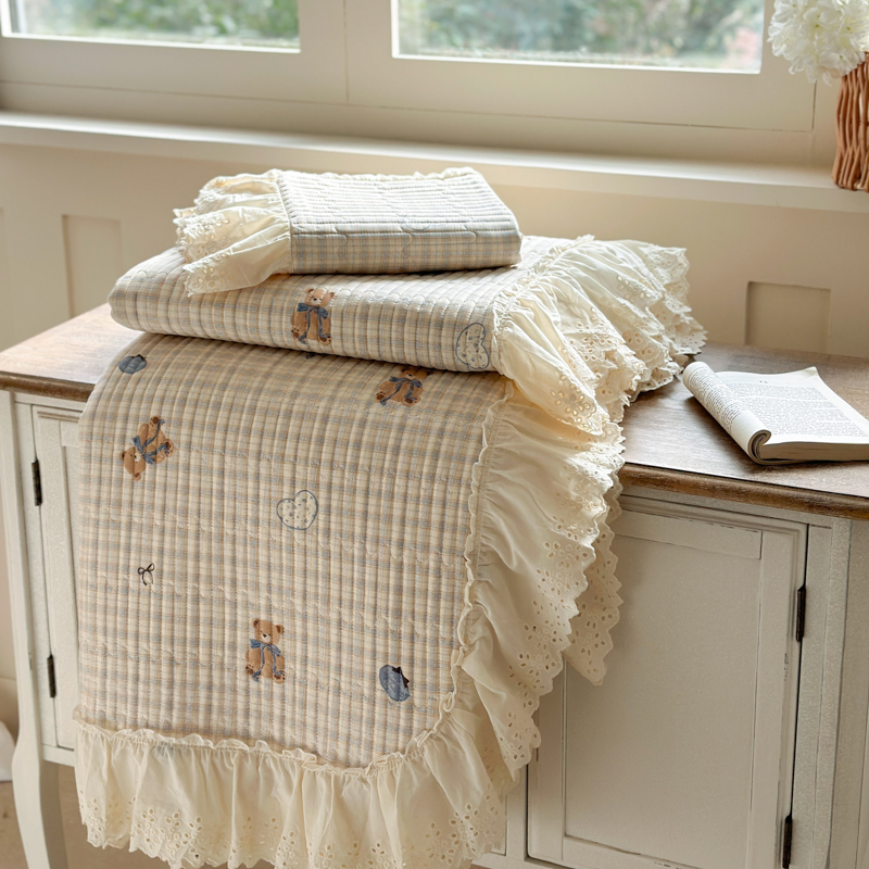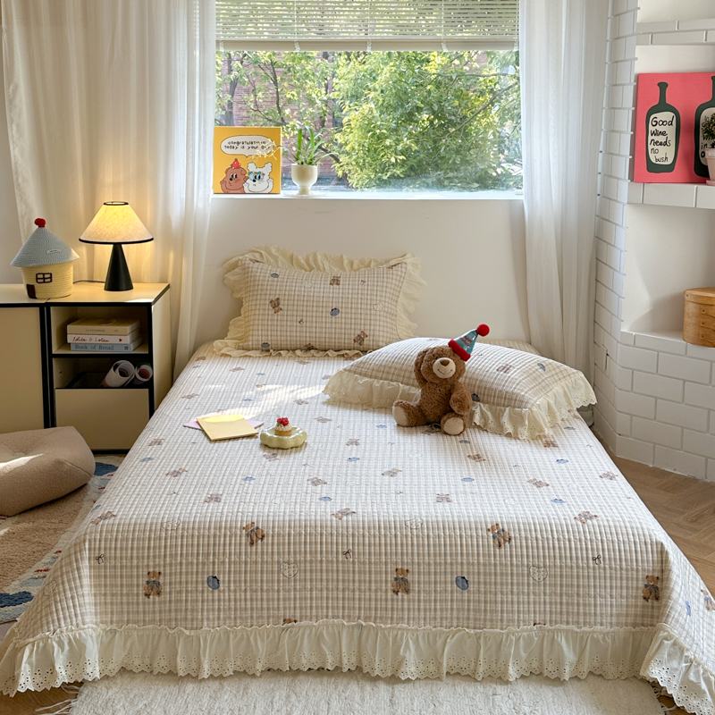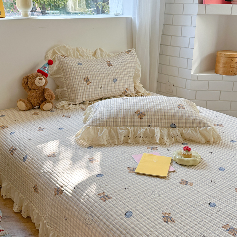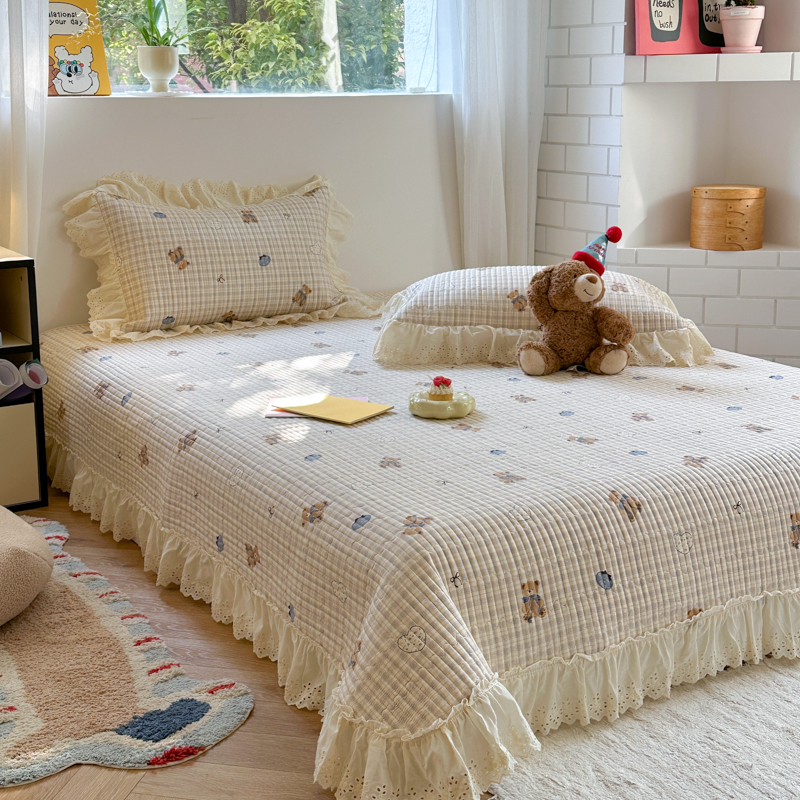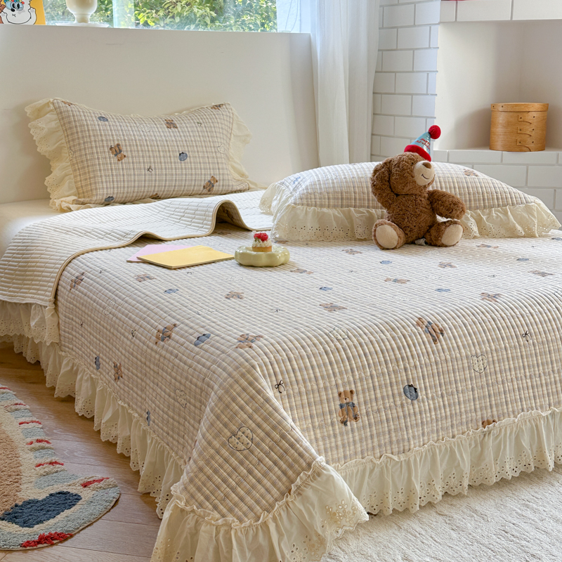 金丝鸟 2025全棉镂空白色花边款韩式床盖 格子小熊
