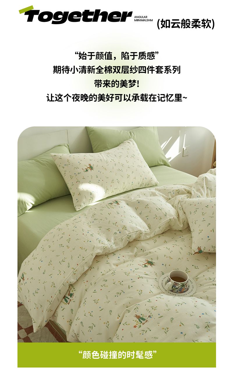 当前位置: 91家纺网 > 商品网购 > 床品套件 > 四件套 > 全棉普通四件套 > 趣色家纺 2025新款A类全棉双层纱印花四件套 薇拉