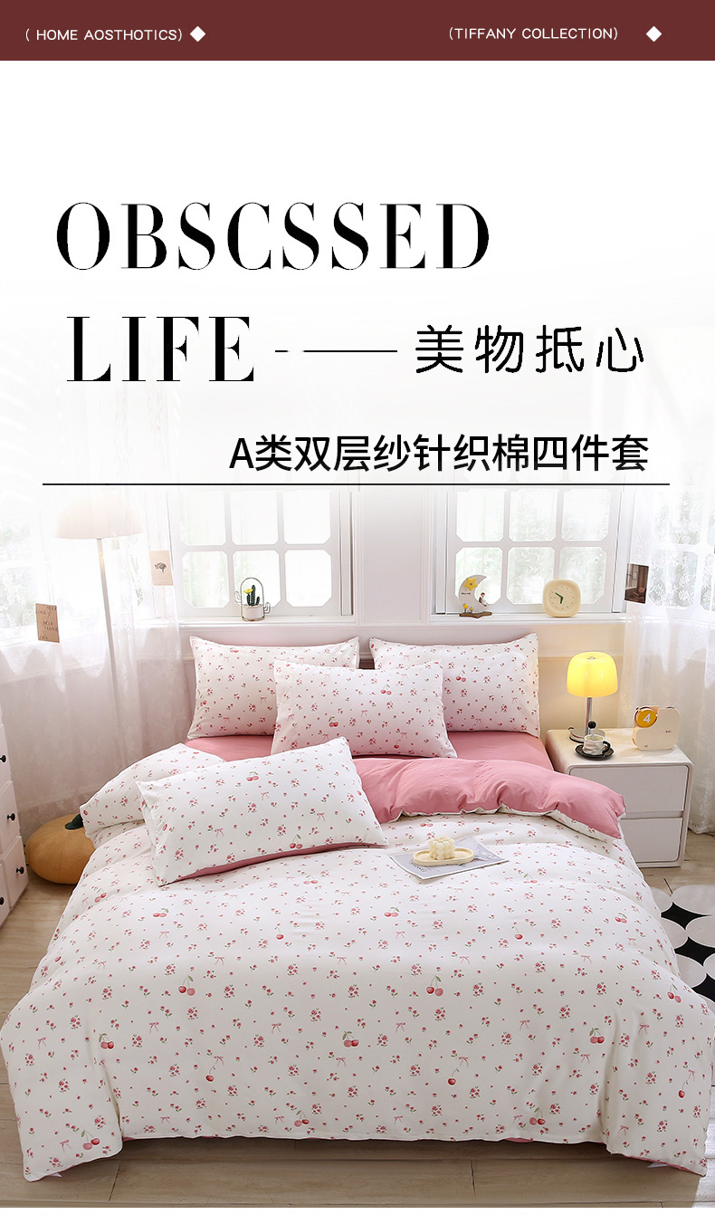 织写 2025新款A类双层纱针织棉四件套床单四件套床单四件套小清新四件套 红色樱桃