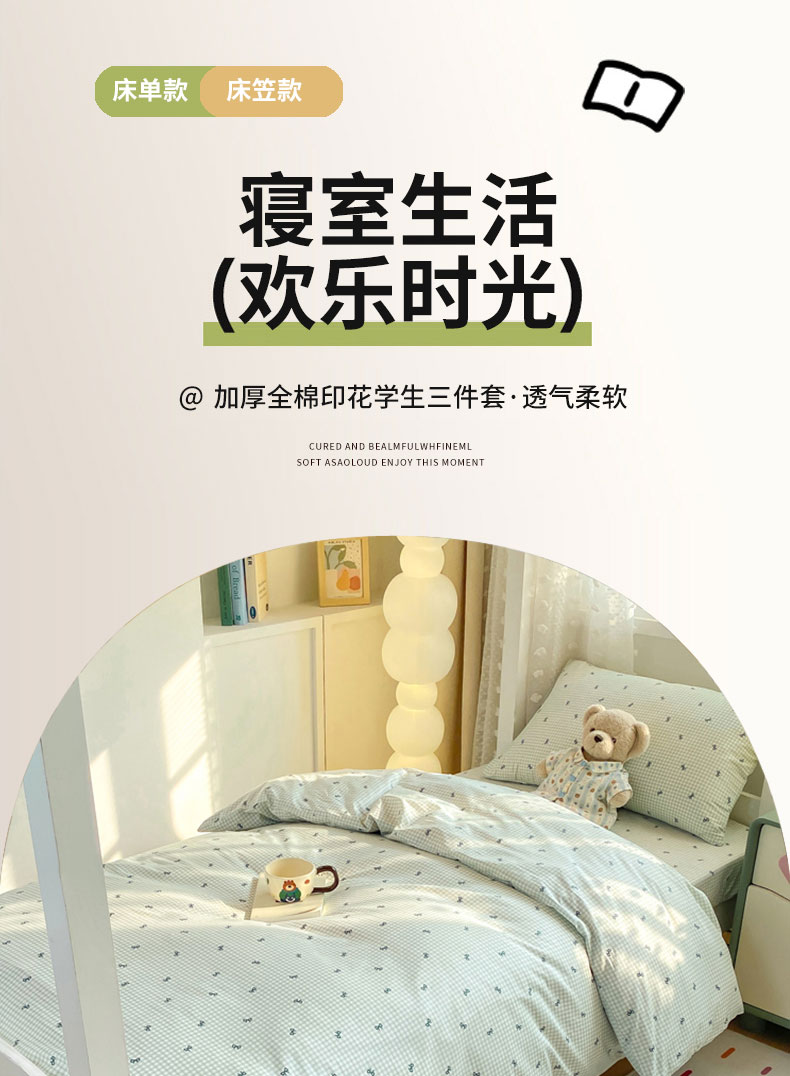 (总)宅部落 2025新款全棉三件套纯棉学生宿舍上下铺六件套,童年印记,蝶语-绿,腊肠狗,梦巴黎,快乐无限,可比熊,卡宾熊,熊猫派对,幸运七彩,奈斯草莓,文艺风范,绅士灰AA,绅士灰AB,灰细条纹,简居,蓝小格,温情北欧