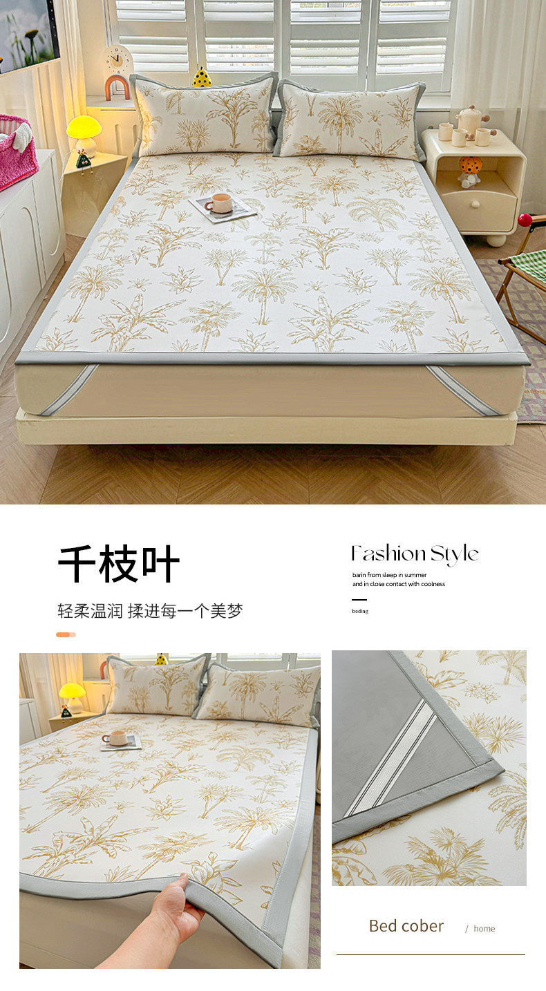 • 91家纺网 家纺一手货源 找家纺 雯豆2025春夏新款碳光冰丝席三件套A类凉感印花三明治凉席 碳光冰丝席-绑带款-千枝叶-1