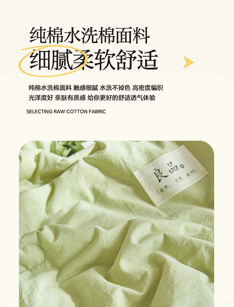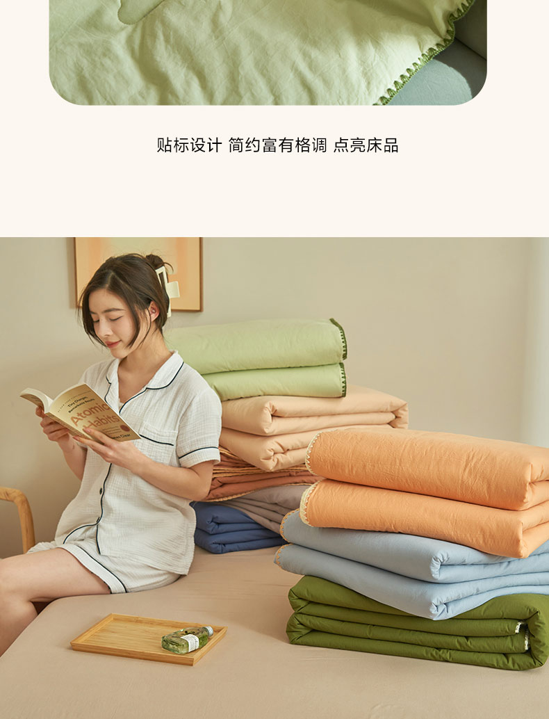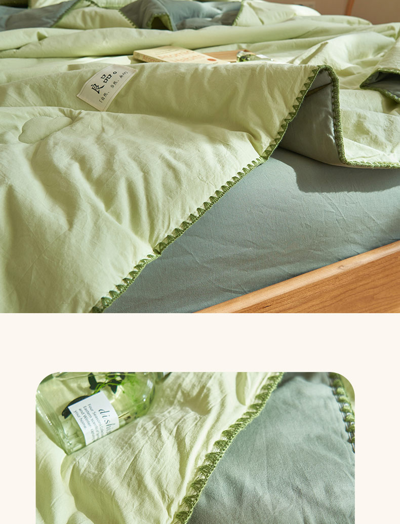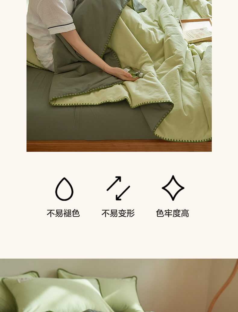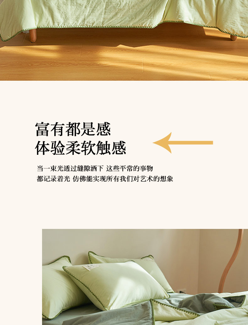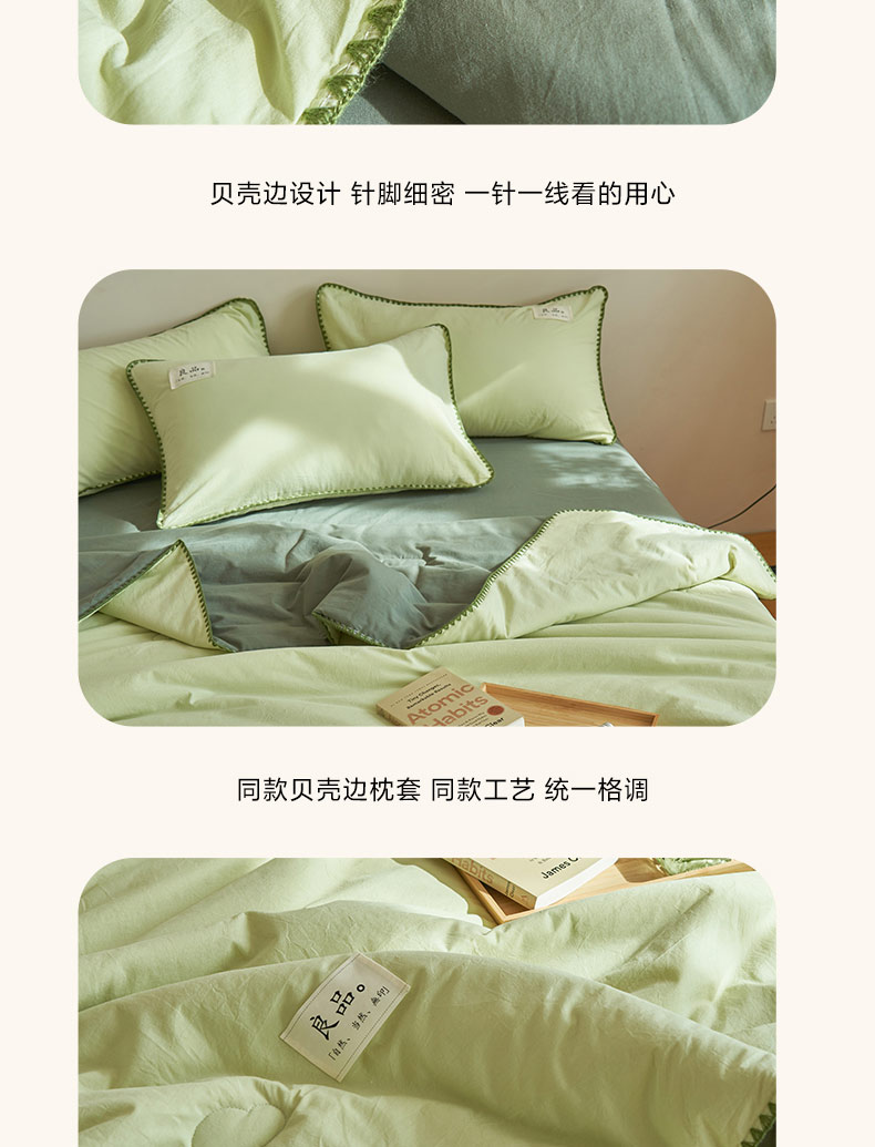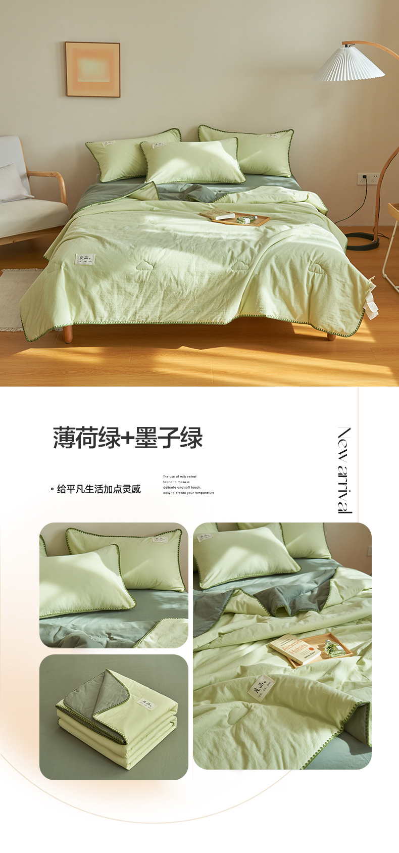 • 91家纺网 家纺一手货源 找家纺 寐绸家纺 2025新款纯棉水洗棉极简风贝克边大豆纤维夏被四件套 薄荷绿+墨子绿