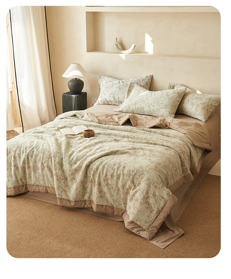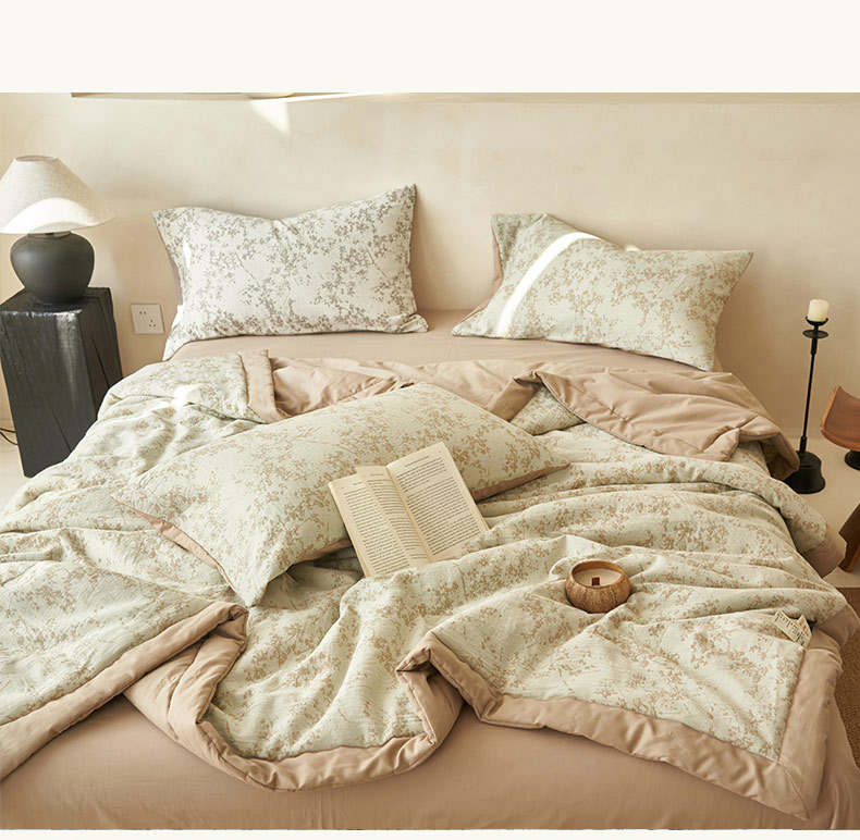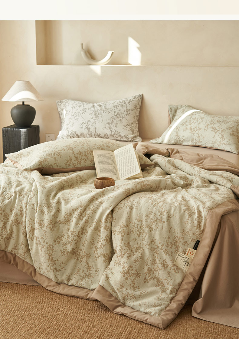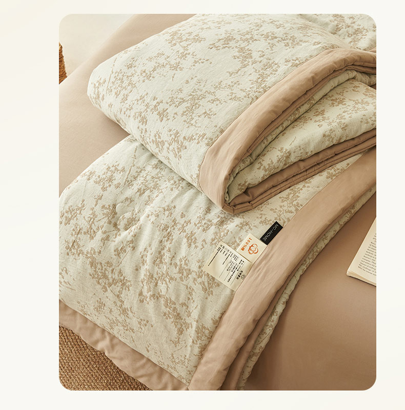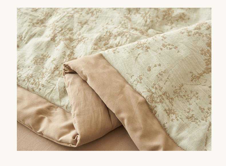 • 91家纺网 家纺一手货源 找家纺 寐绸家纺 2025新款纯棉水洗棉三层繁花提花大豆纤维夏被四件套 繁花夏被-浅驼