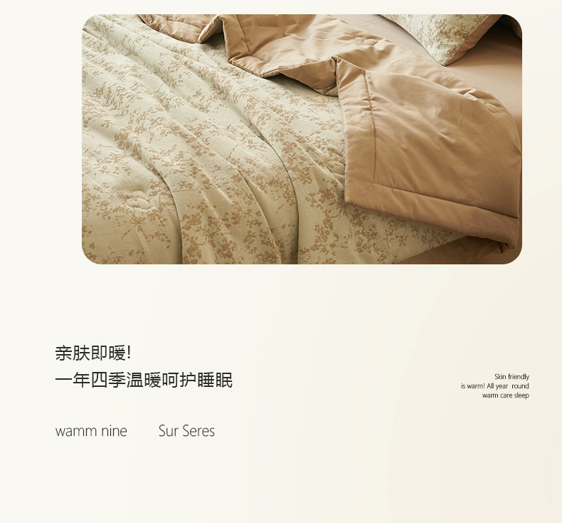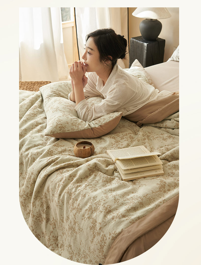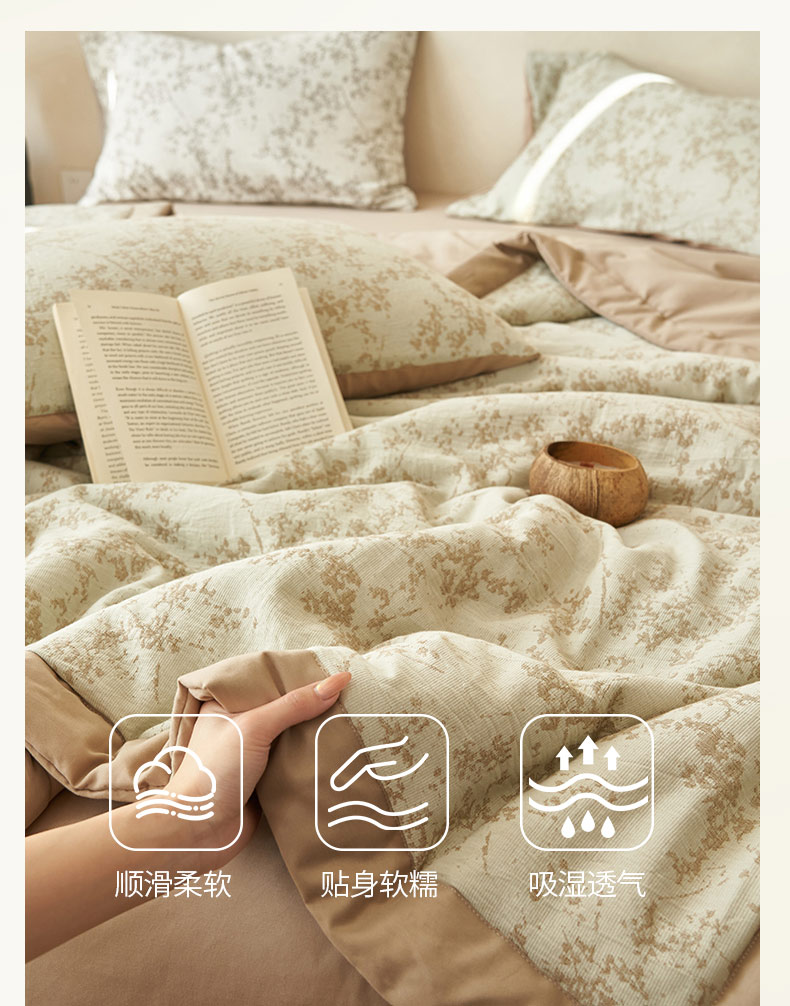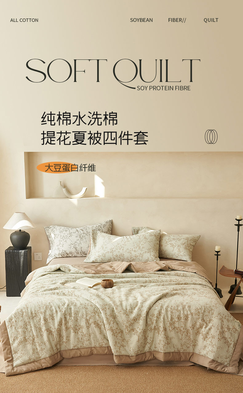 • 91家纺网 家纺一手货源 找家纺 寐绸家纺 2025新款纯棉水洗棉三层繁花提花大豆纤维夏被四件套 繁花夏被-浅驼