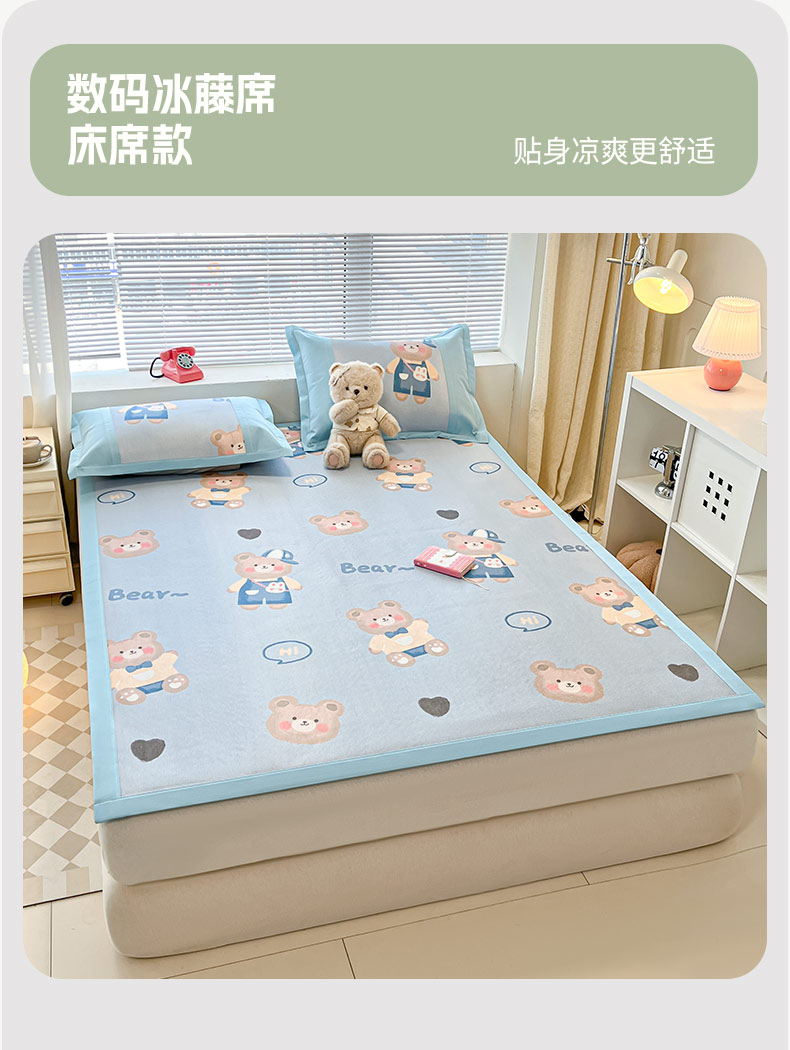 鑫琪莱家纺 2025新款数码印花加密冰藤凉席三件套 床笠款-书院小熊