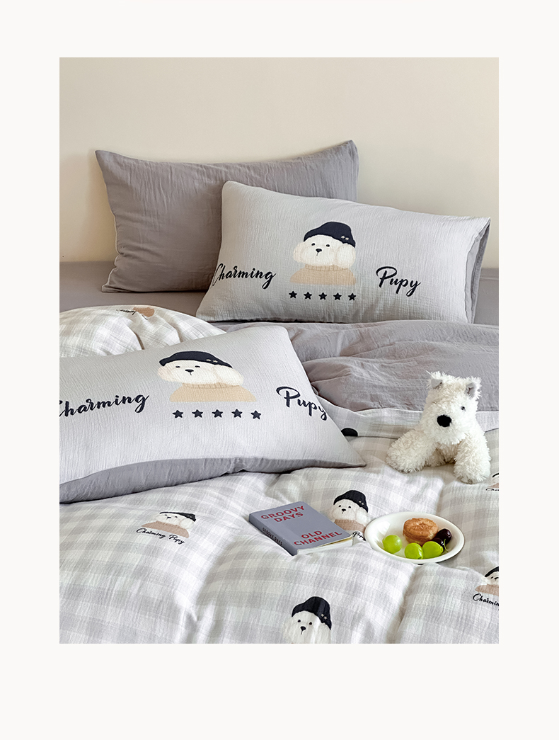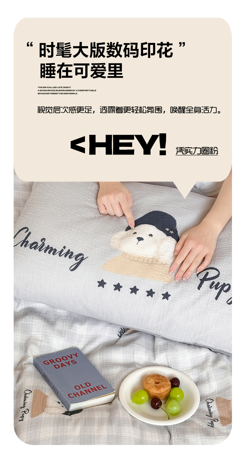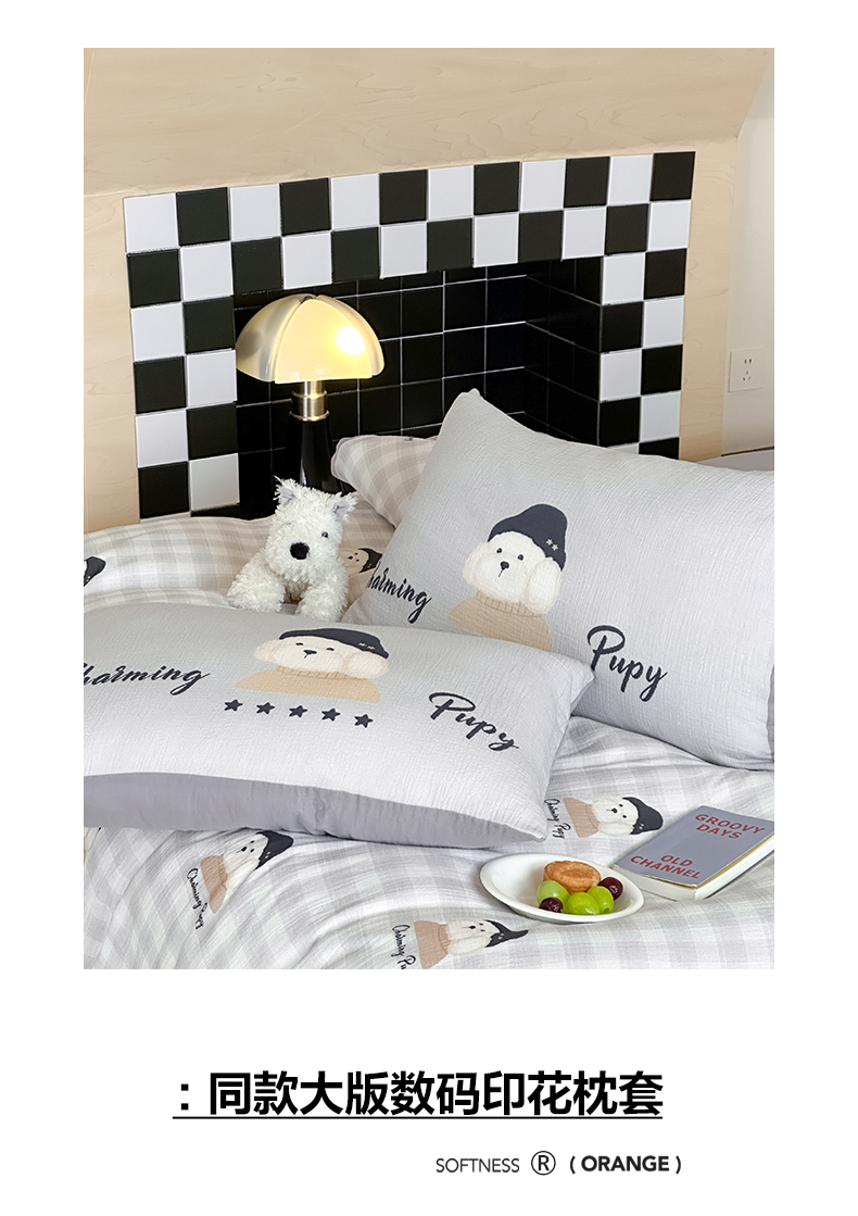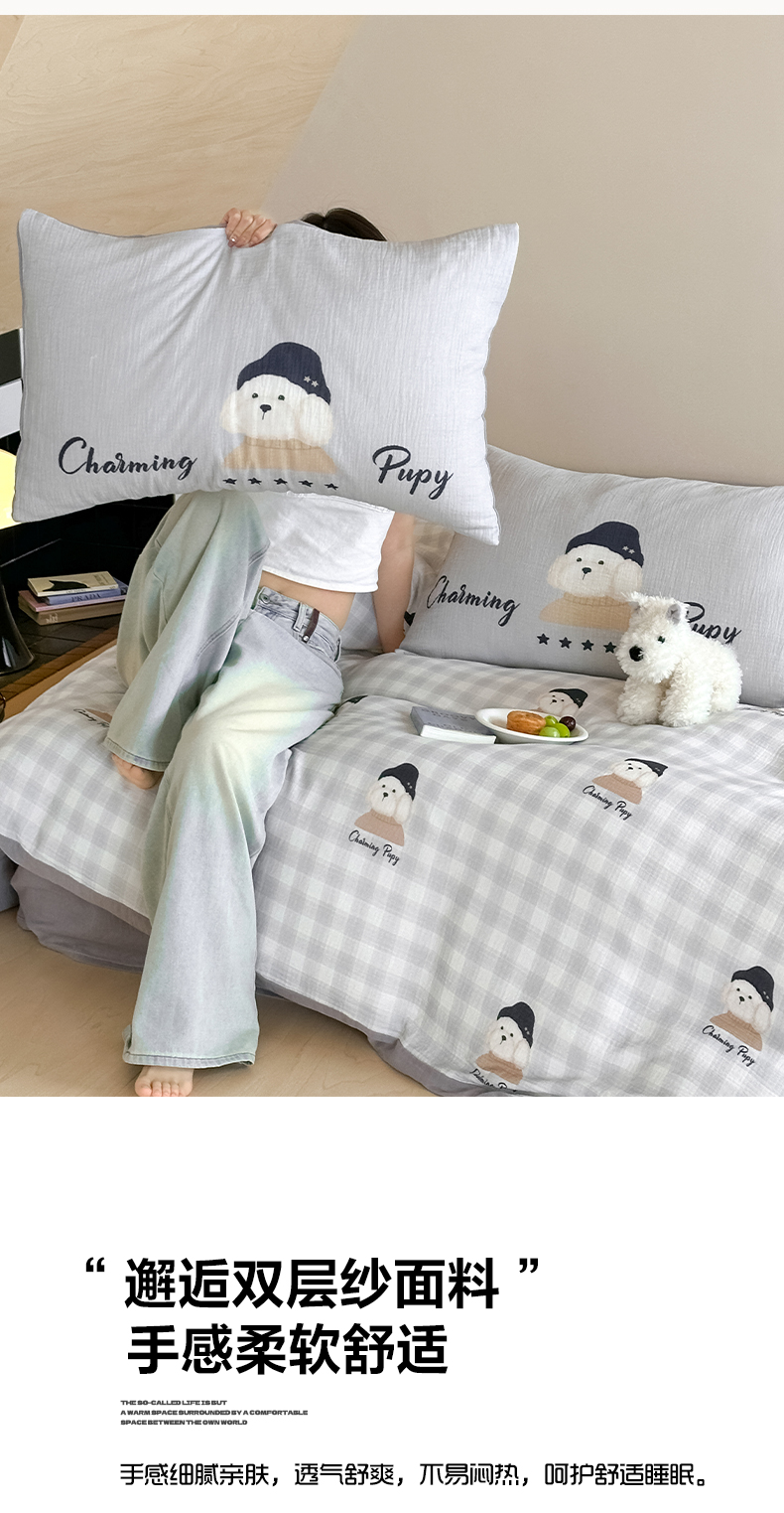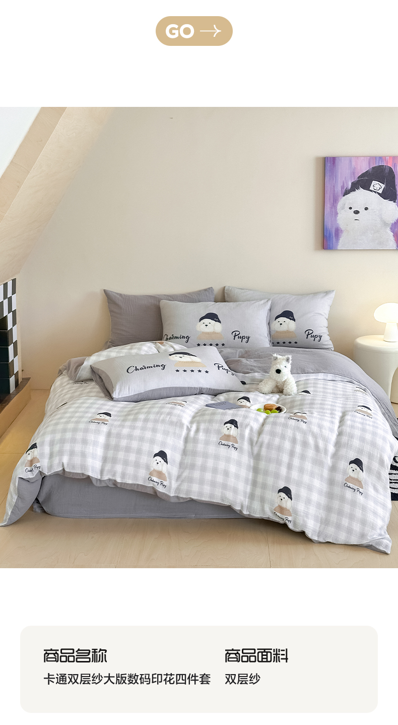 商品名称:卡巴伦家纺 2025新款全棉皱皱纱大版卡通数码印花款四件套二 汪汪掀被-灰