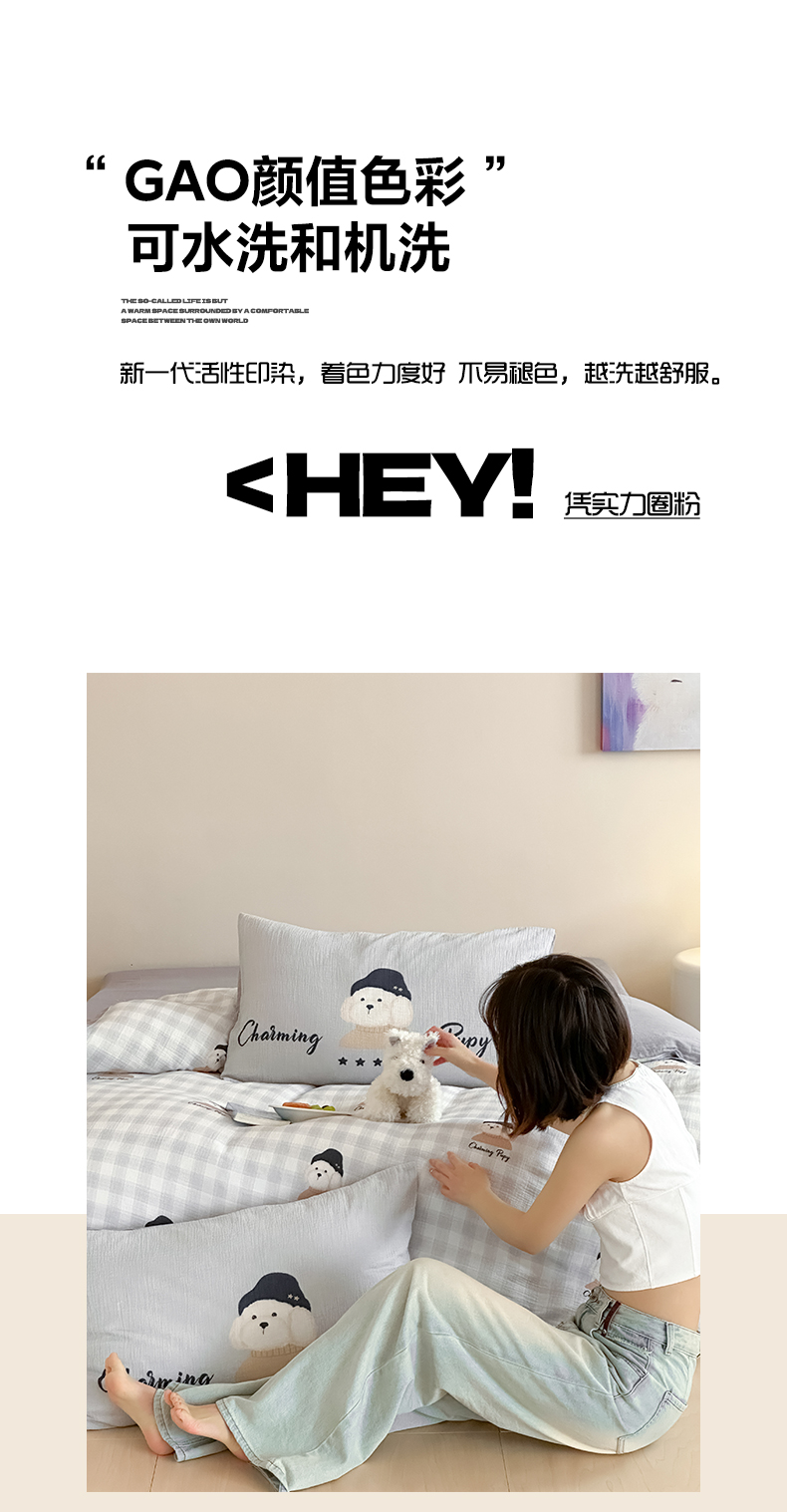 (总)卡巴伦家纺 2025新款全棉皱皱纱大版卡通数码印花款四件套二,酥酥熊-粉,腊肠总裁,生日万岁-粉,生日万岁-蓝,生日万岁-米,酥酥熊-米黄,汪汪掀被-灰,汪汪掀被-绿,小狗没烦恼
